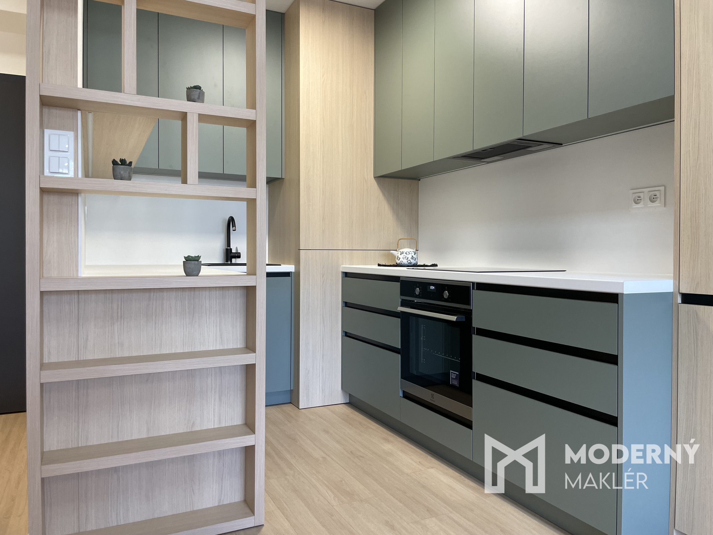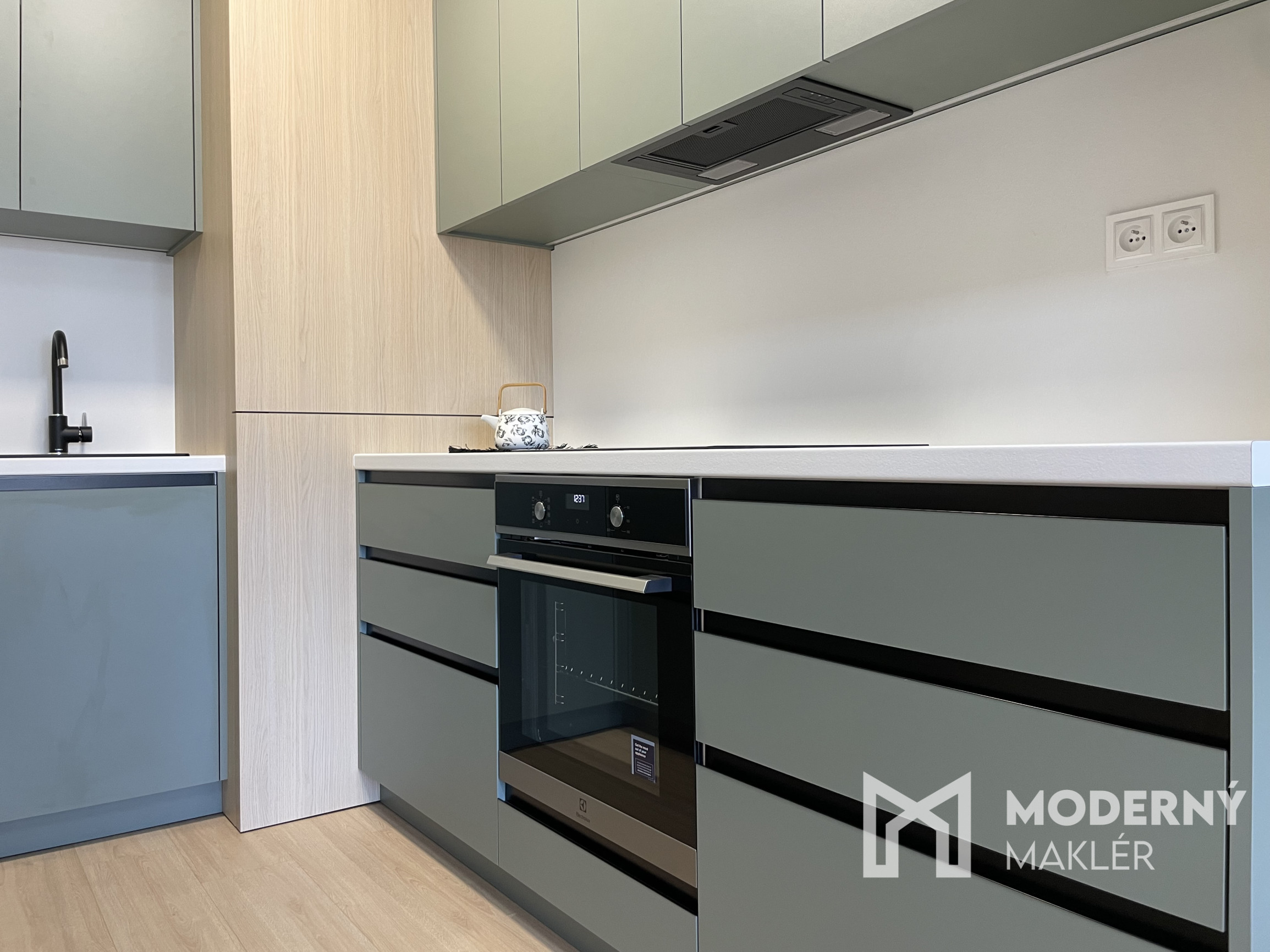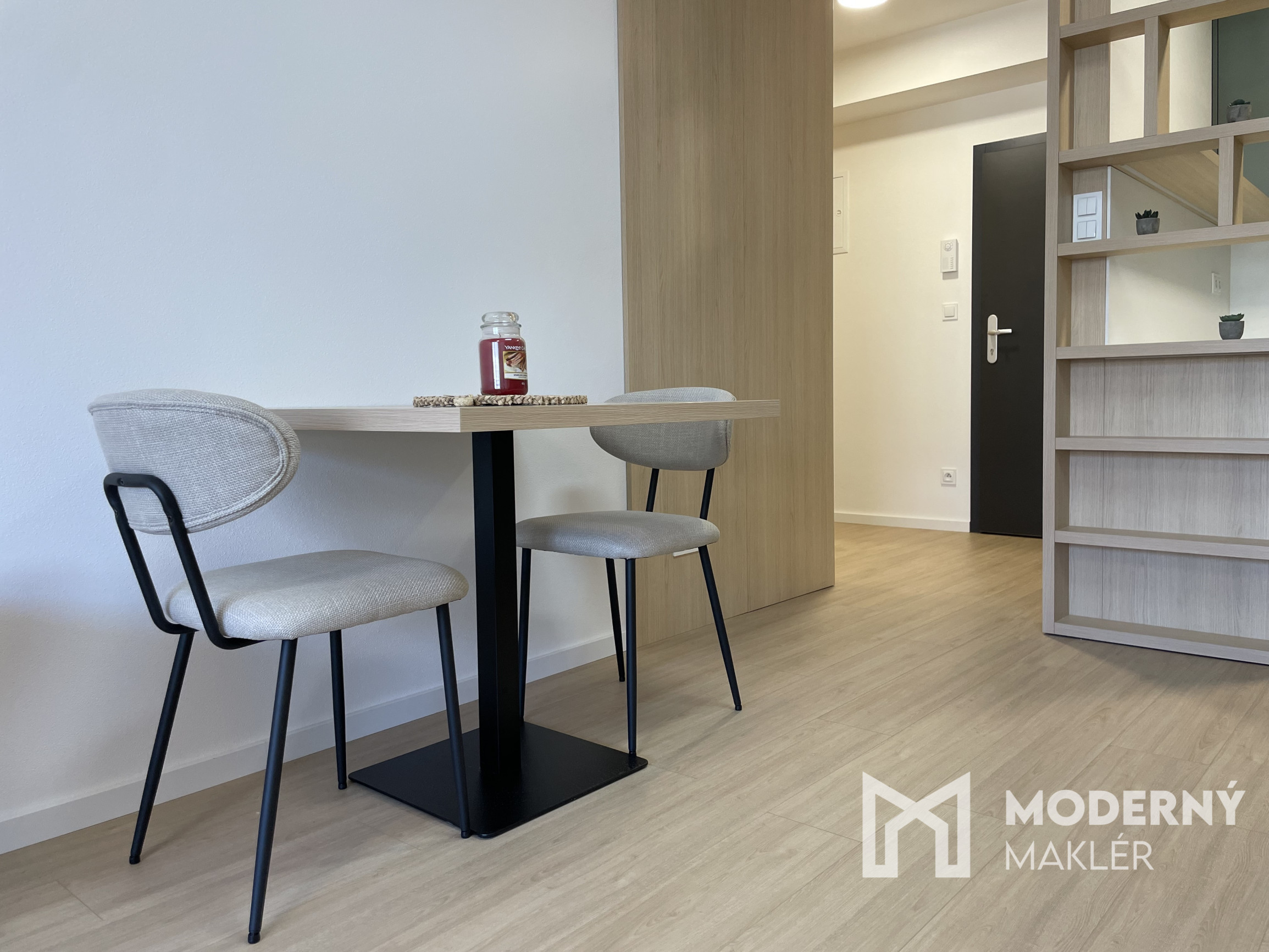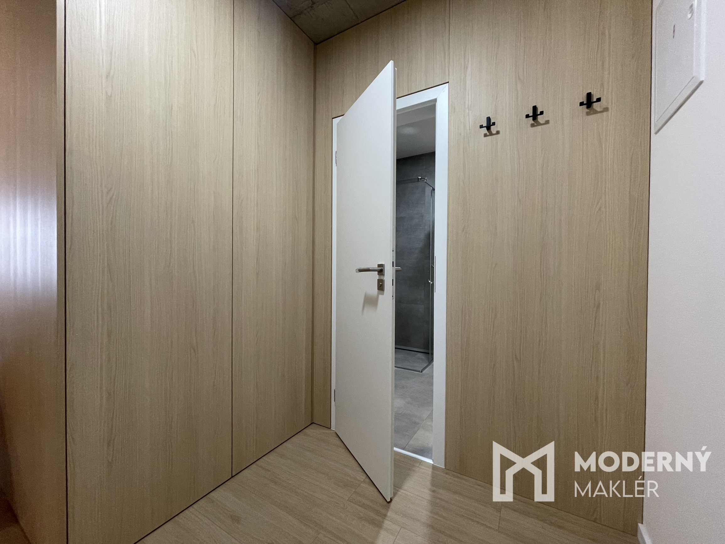 Nehnuteľnosť sa prenajíma čiastočne zariadená. Na chodbe sa nachádza vstavaná skriňa poskytujúca praktický úložný priestor. Kúpeľňa je vybavená moderným sprchovým kútom, WC a umývadlom so skrinkou, ktorá ponúka dodatočné miesto na uskladnenie. Kuchyňa je kompletne vybavená zabudovanými spotrebičmi a praktickým stolom so stoličkami, ideálnym na pohodlné stolovanie. Obývacia časť disponuje pohodlným gaučom so stolíkom, vstavanými skrinkami zabezpečujúcimi dostatok úložného priestoru a TV stolíkom pre multimediálne potreby.