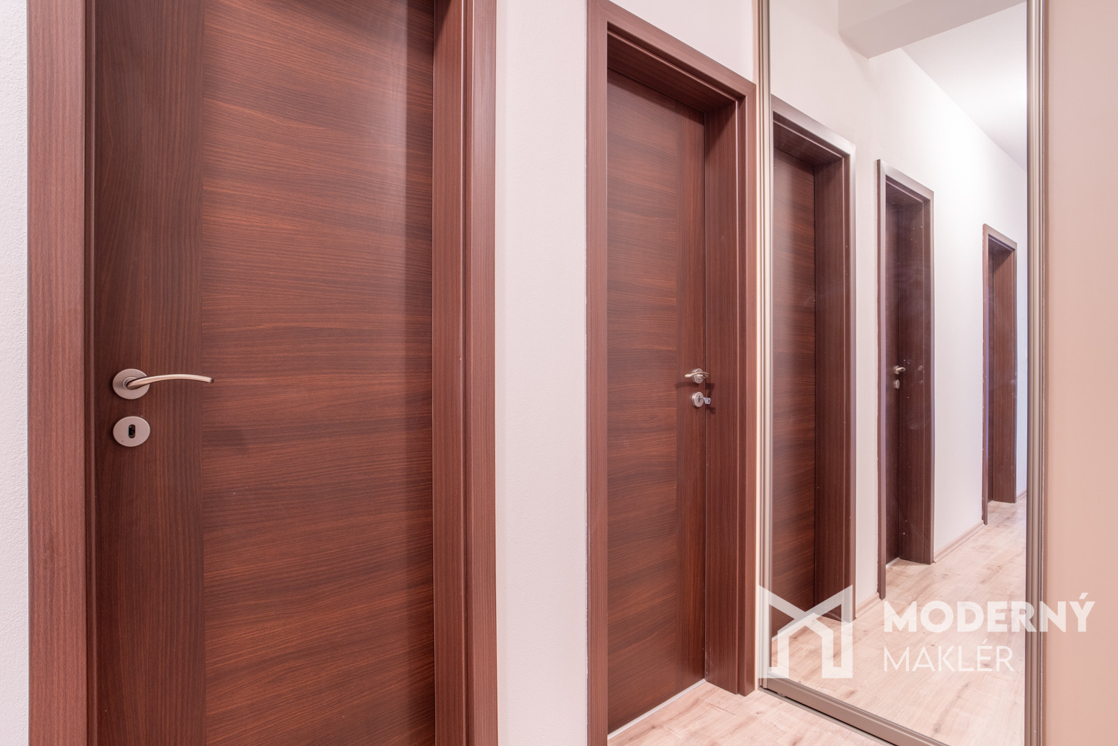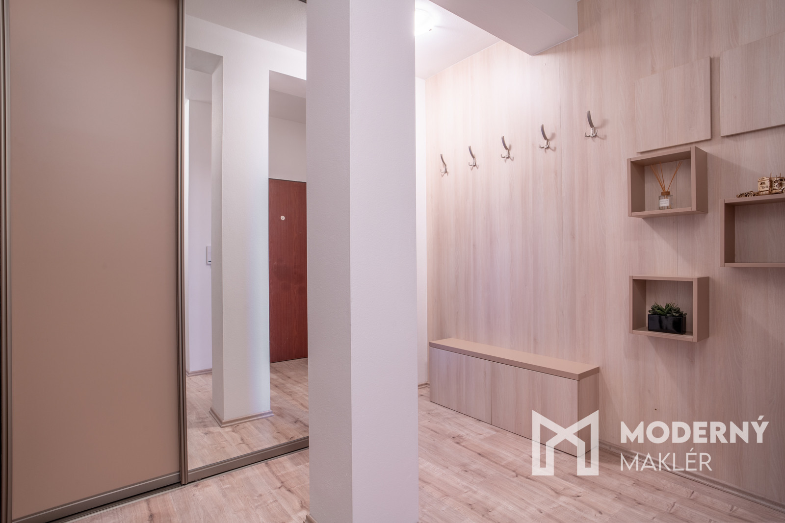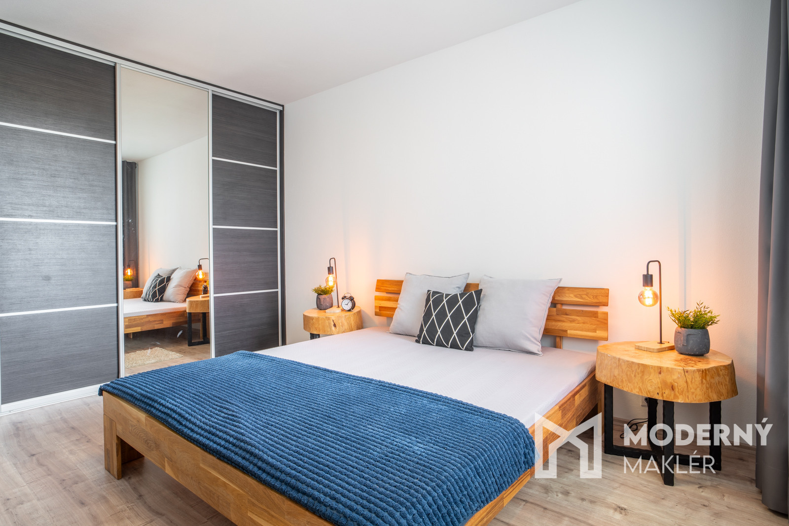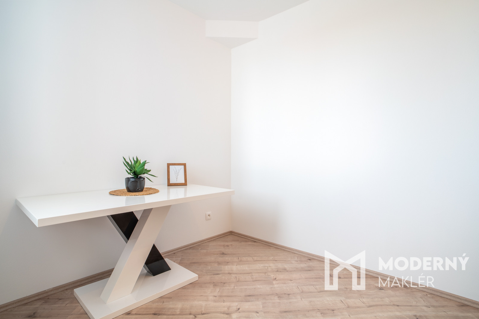 Nehnuteľnosť sa prenajíma kompletne zariadená – v kuchyni nájdete kuchynskú linku so spotrebičmi (indukčná varná doska, elektrická rúra, umývačka riadu, digestor, chladnička s mrazničkou, mikrovlnná rúra, kávovar) a jedálenský stôl so stoličkami. Obývacia izba disponuje rohovou rozťahovacou sedačkou, konferenčným stolíkom, televízorom a skrinkou pod TV. V spálni sa nachádza vstavaná skriňa, manželská posteľ s matracmi, nočné stolíky a komoda. V druhej izbe nájdete jedálenský stôl, avšak po dohode je možné dokúpiť aj ďalší nábytok. V kúpeľni je práčka, odkladacia skrinka, na chodbe vstavaná skriňa, botník a vešiakový panel. K dispozícii je aj robotický vysávač. V byte je zabezpečený optický internet a TV pripojenie.