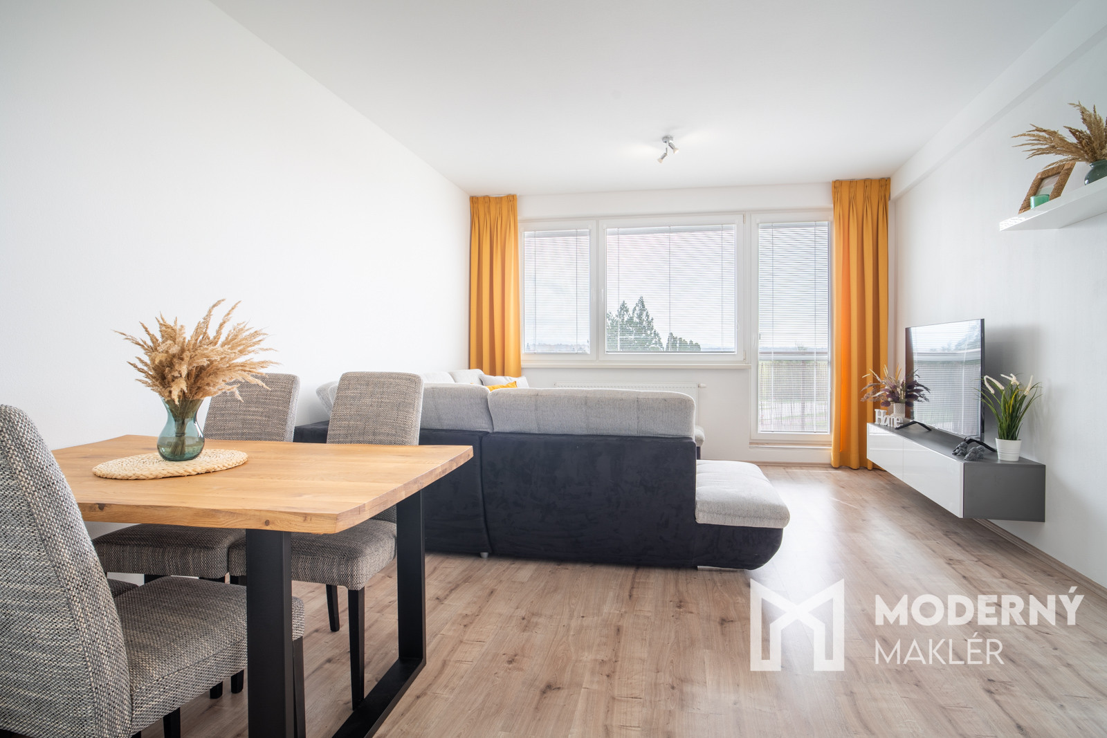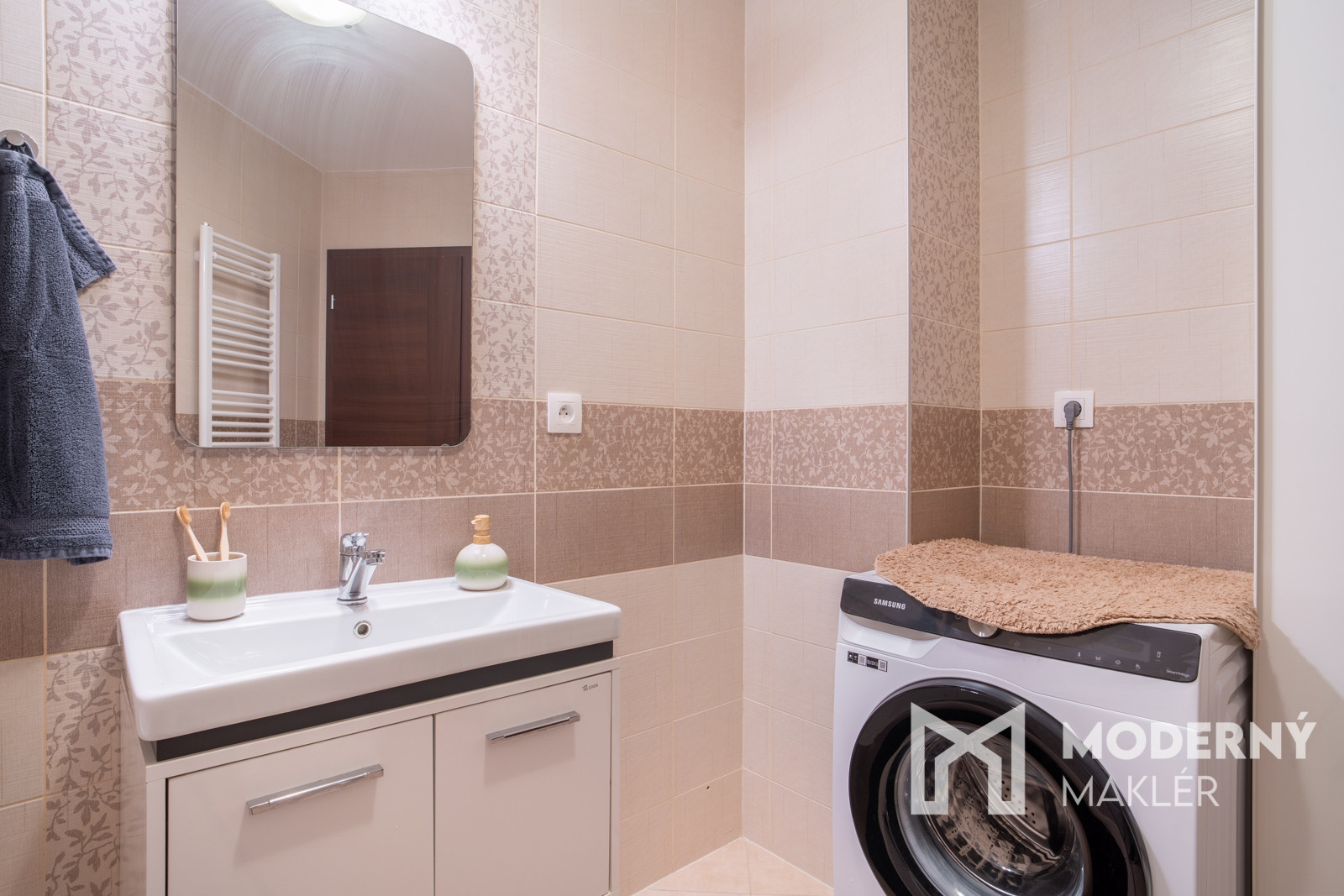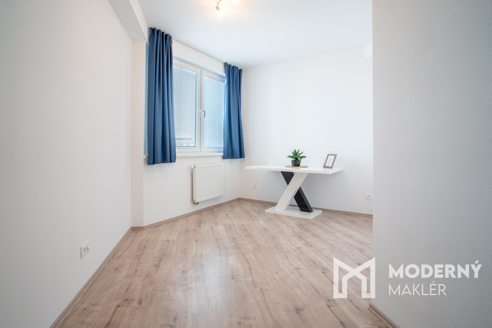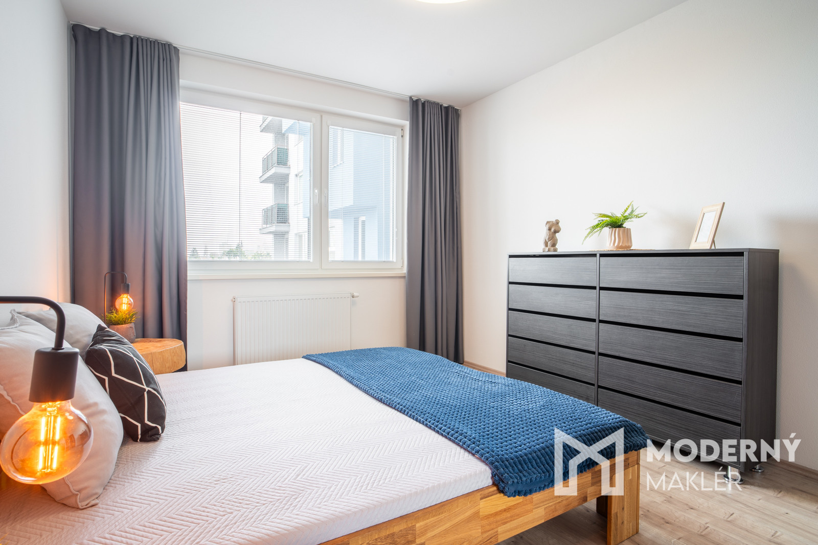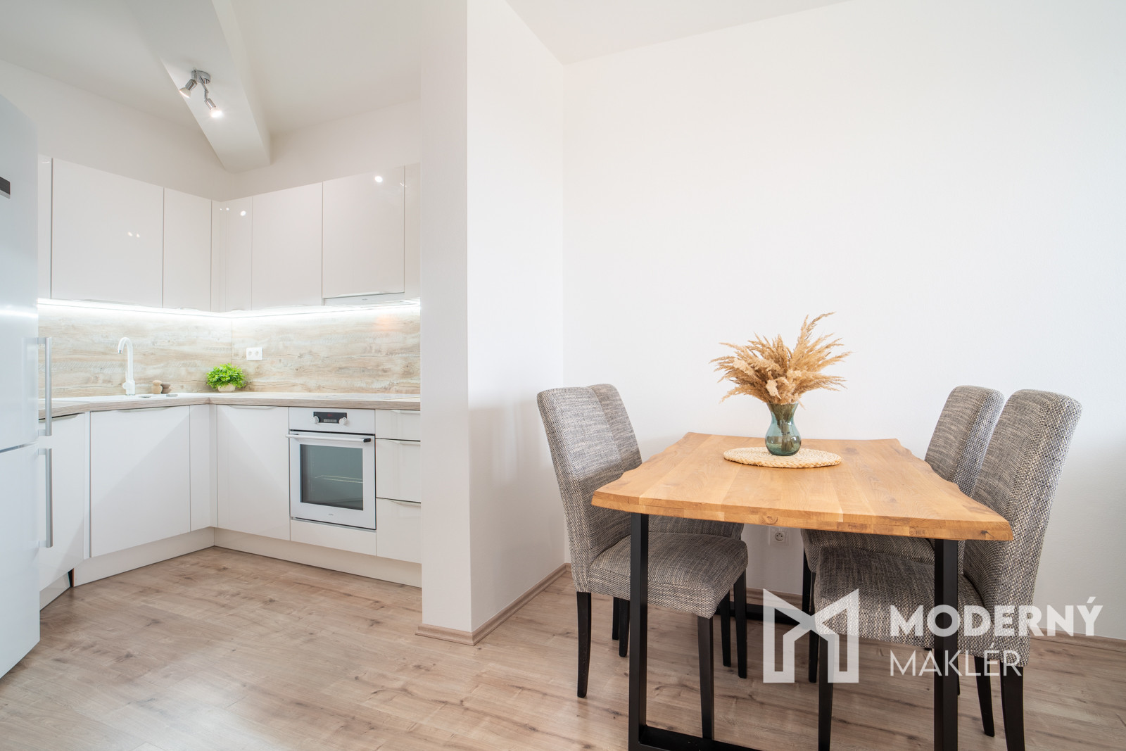 Nehnuteľnosť sa prenajíma kompletne zariadená – v kuchyni nájdete kuchynskú linku so spotrebičmi (indukčná varná doska, elektrická rúra, umývačka riadu, digestor, chladnička s mrazničkou, mikrovlnná rúra, kávovar) a jedálenský stôl so stoličkami. Obývacia izba disponuje rohovou rozťahovacou sedačkou, konferenčným stolíkom, televízorom a skrinkou pod TV. V spálni sa nachádza vstavaná skriňa, manželská posteľ s matracmi, nočné stolíky a komoda. V druhej izbe nájdete jedálenský stôl, avšak po dohode je možné dokúpiť aj ďalší nábytok. V kúpeľni je práčka, odkladacia skrinka, na chodbe vstavaná skriňa, botník a vešiakový panel. K dispozícii je aj robotický vysávač. V byte je zabezpečený optický internet a TV pripojenie.