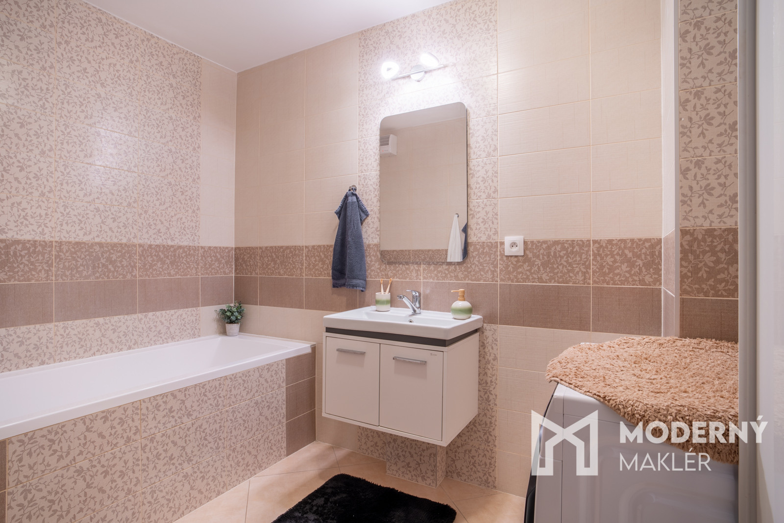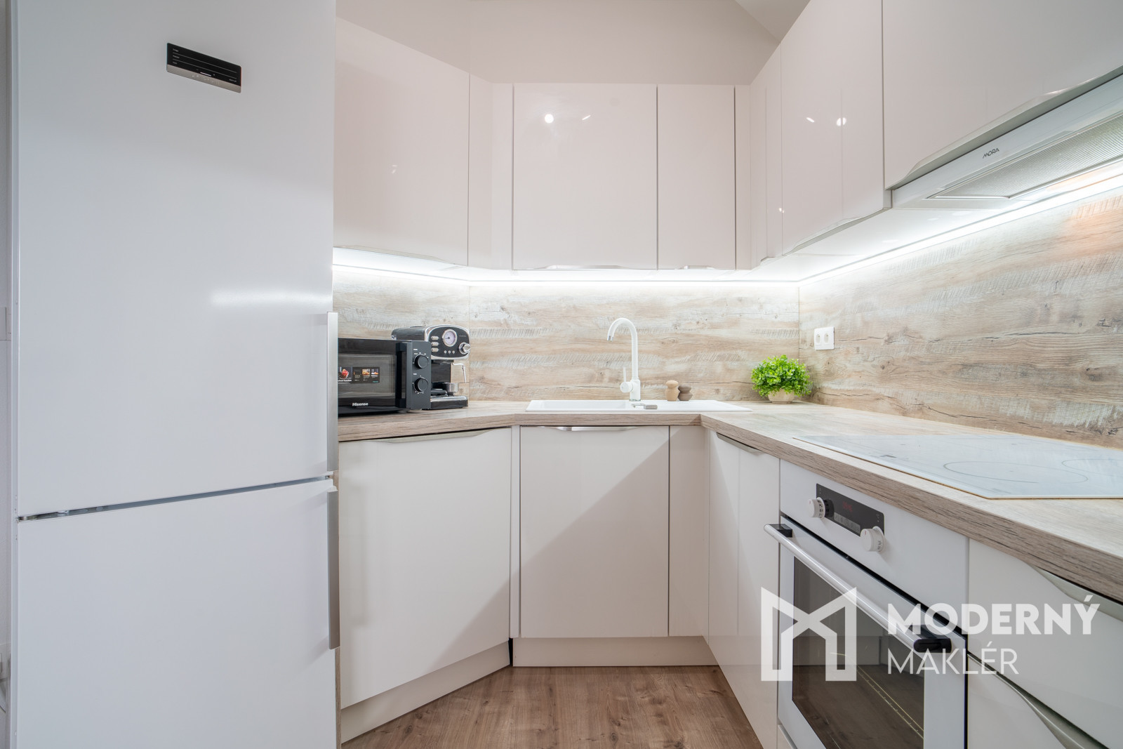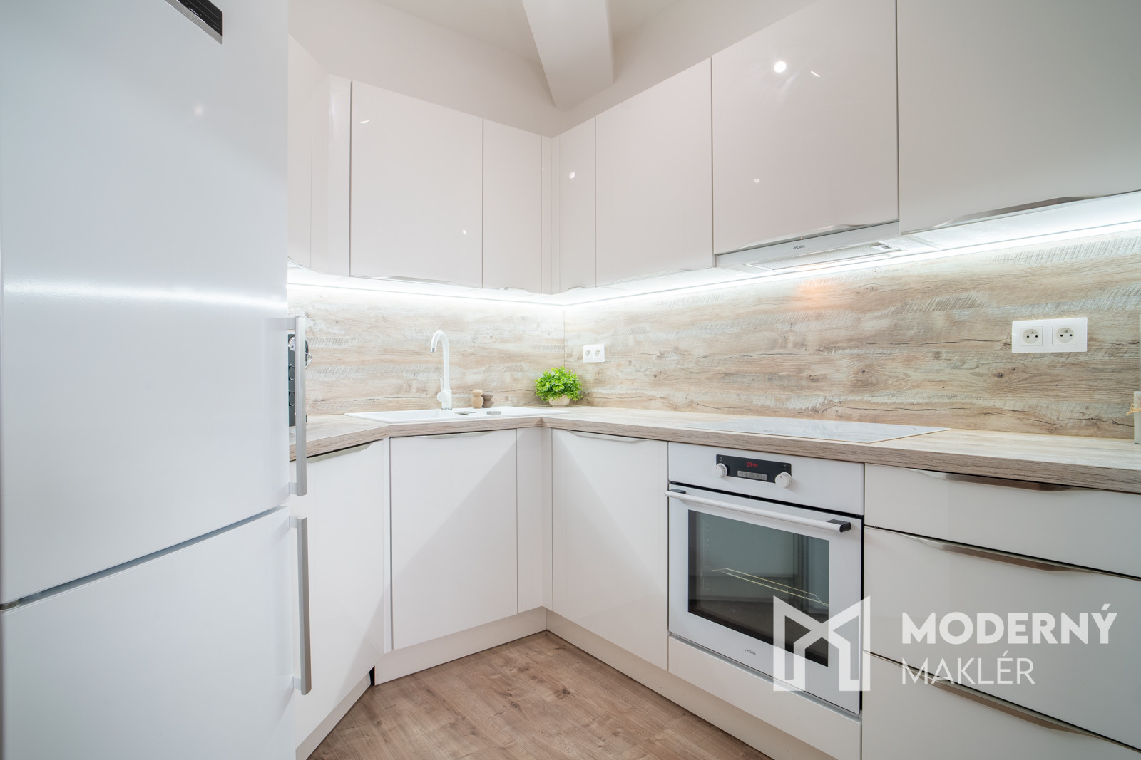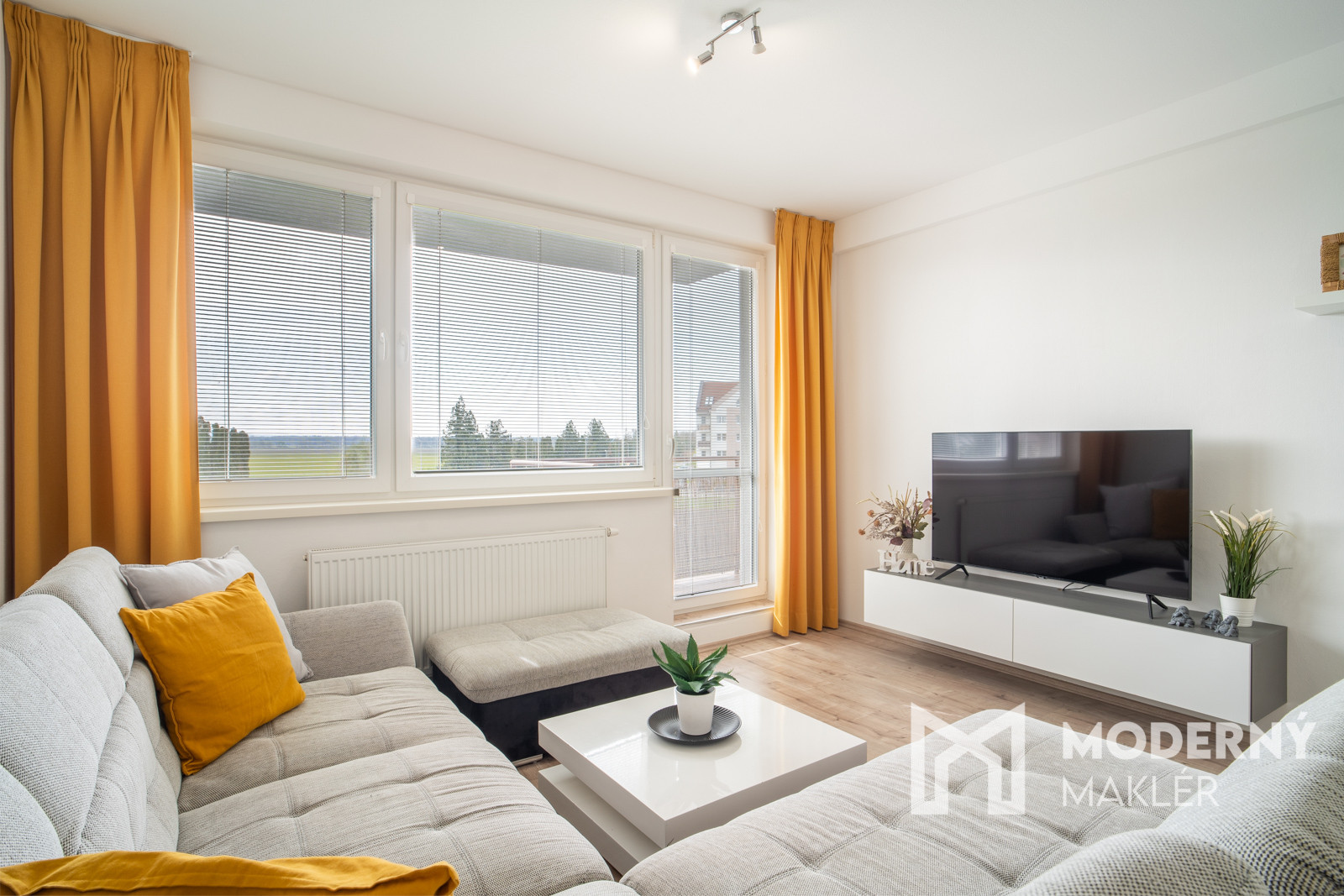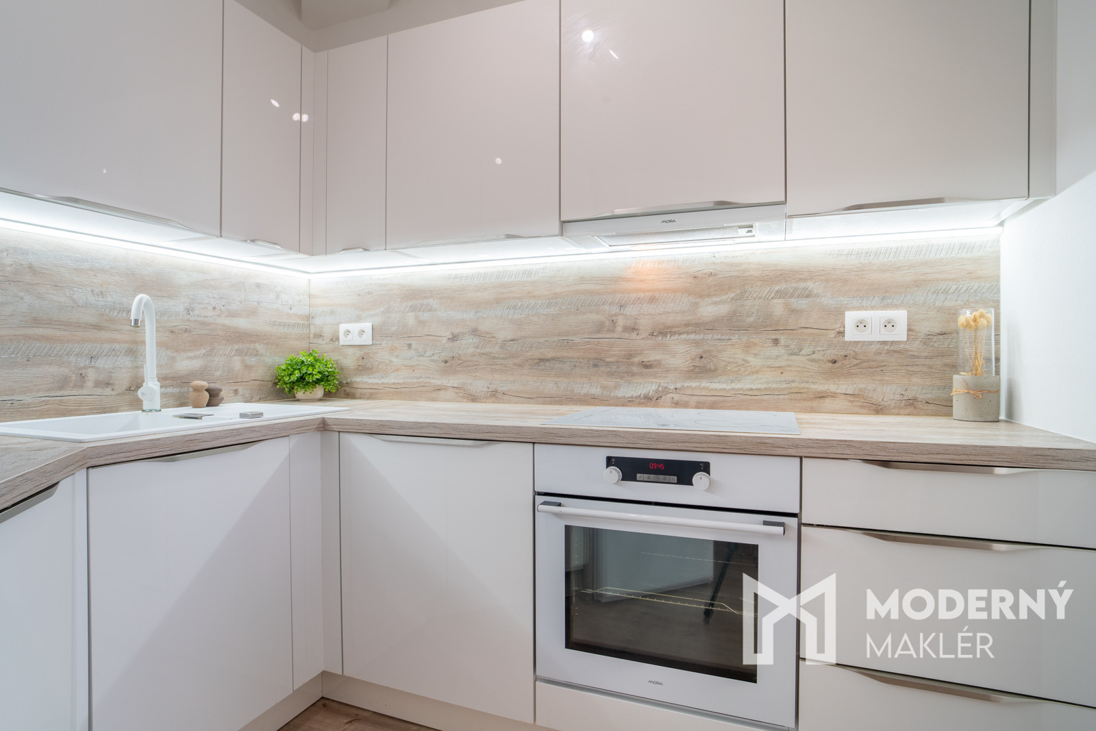 Nehnuteľnosť sa prenajíma kompletne zariadená – v kuchyni nájdete kuchynskú linku so spotrebičmi (indukčná varná doska, elektrická rúra, umývačka riadu, digestor, chladnička s mrazničkou, mikrovlnná rúra, kávovar) a jedálenský stôl so stoličkami. Obývacia izba disponuje rohovou rozťahovacou sedačkou, konferenčným stolíkom, televízorom a skrinkou pod TV. V spálni sa nachádza vstavaná skriňa, manželská posteľ s matracmi, nočné stolíky a komoda. V druhej izbe nájdete jedálenský stôl, avšak po dohode je možné dokúpiť aj ďalší nábytok. V kúpeľni je práčka, odkladacia skrinka, na chodbe vstavaná skriňa, botník a vešiakový panel. K dispozícii je aj robotický vysávač. V byte je zabezpečený optický internet a TV pripojenie.