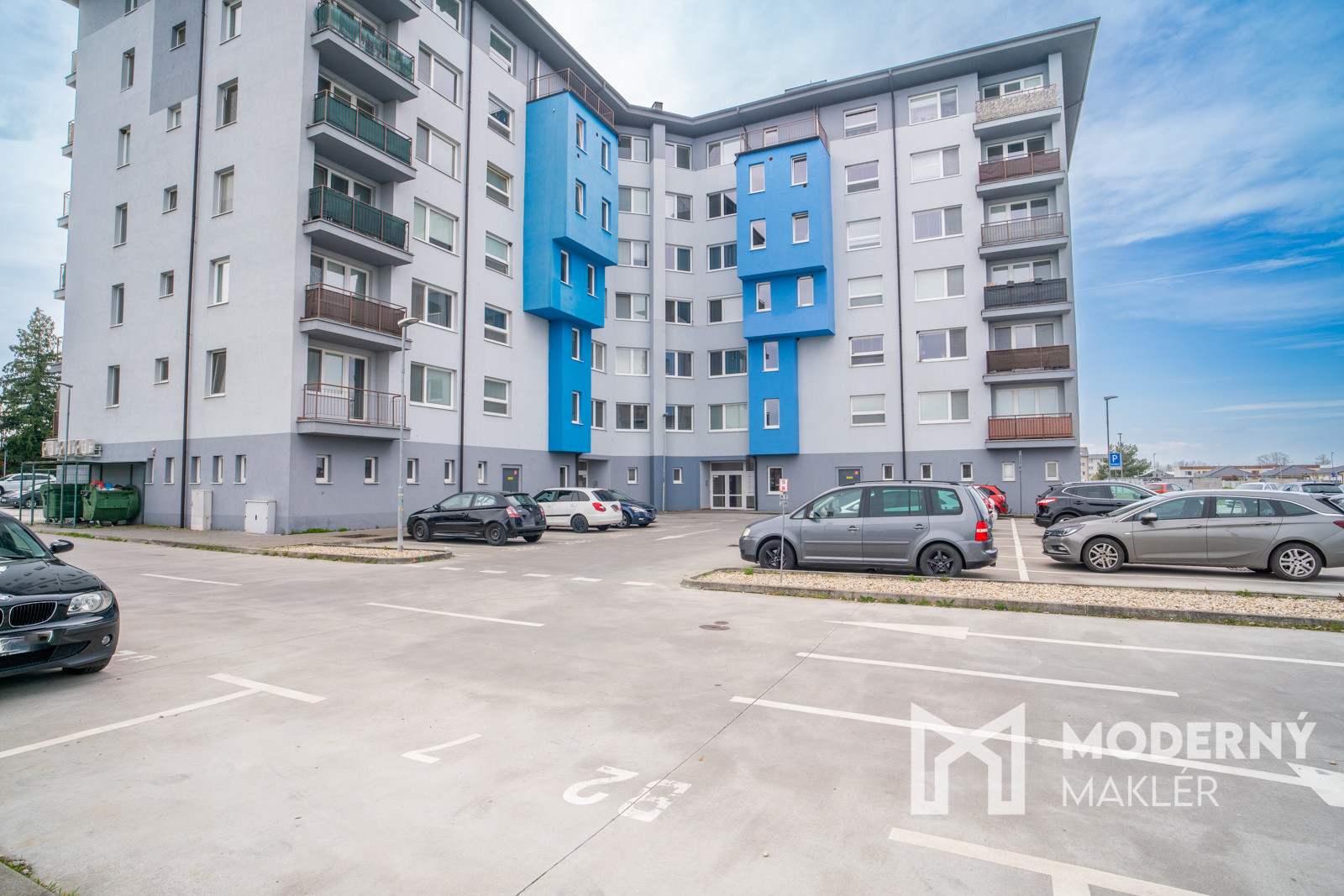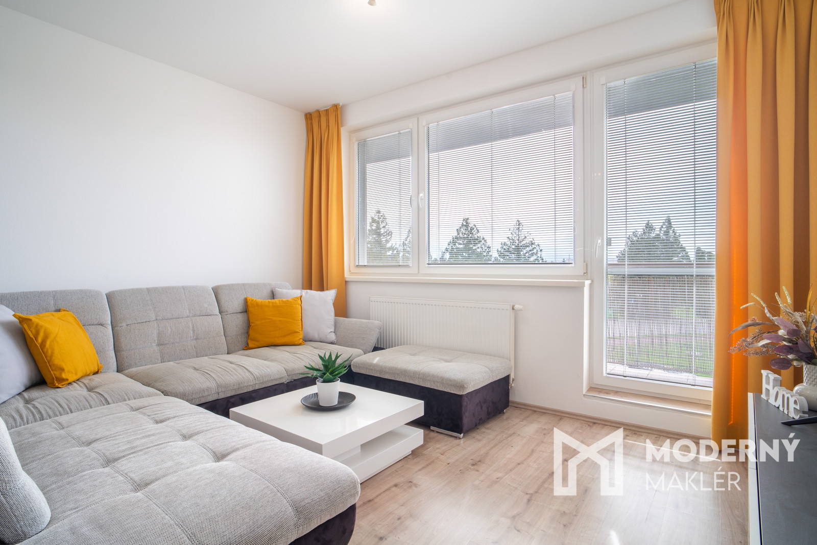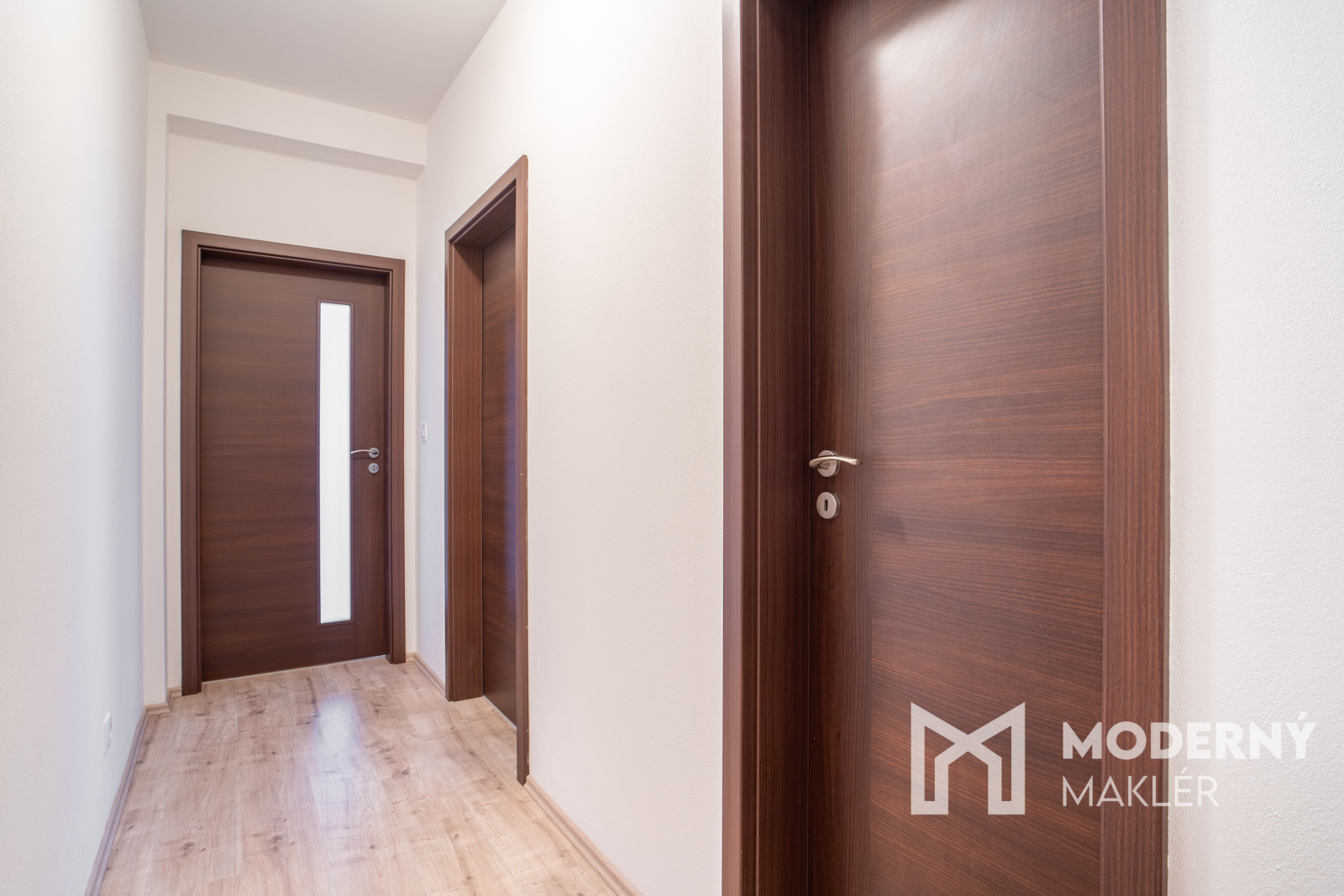 Byt je veľmi dobre dispozične riešený a predelený na dennú a nočnú časť. Pozostáva zo vstupnej chodby, kuchyne spojenej s obývacou izbou, z ktorej je výstup na balkón (orientovaný na juhovýchod), samostatného WC a kúpeľne s vaňou. Nočnú časť tvoria dve samostatné nepriechodné izby orientované na sever. Parkovanie je zabezpečené vyhradeným parkovacím miestom priamo pred bytovým domom.