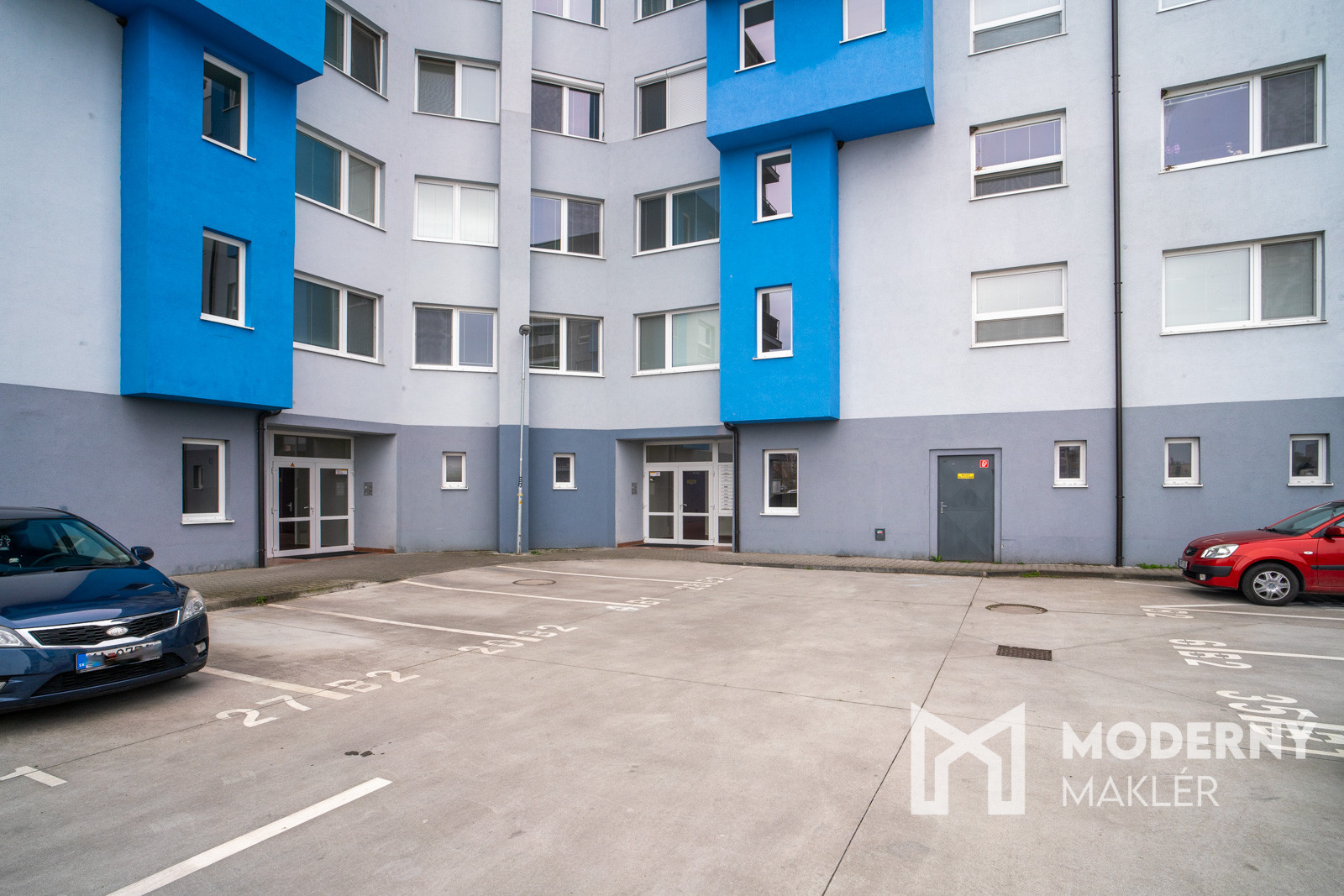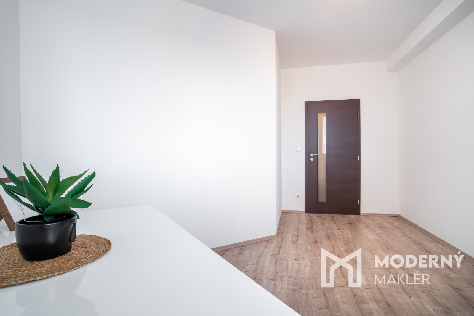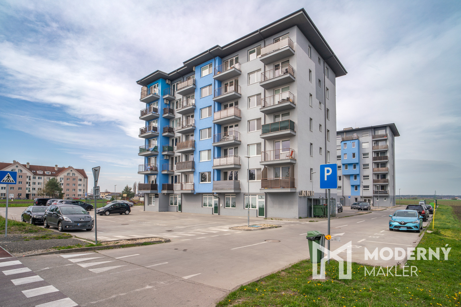 Byt je veľmi dobre dispozične riešený a predelený na dennú a nočnú časť. Pozostáva zo vstupnej chodby, kuchyne spojenej s obývacou izbou, z ktorej je výstup na balkón (orientovaný na juhovýchod), samostatného WC a kúpeľne s vaňou. Nočnú časť tvoria dve samostatné nepriechodné izby orientované na sever. Parkovanie je zabezpečené vyhradeným parkovacím miestom priamo pred bytovým domom.