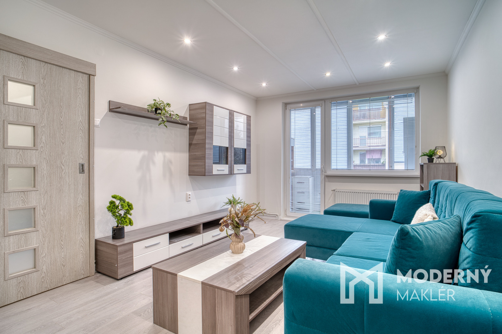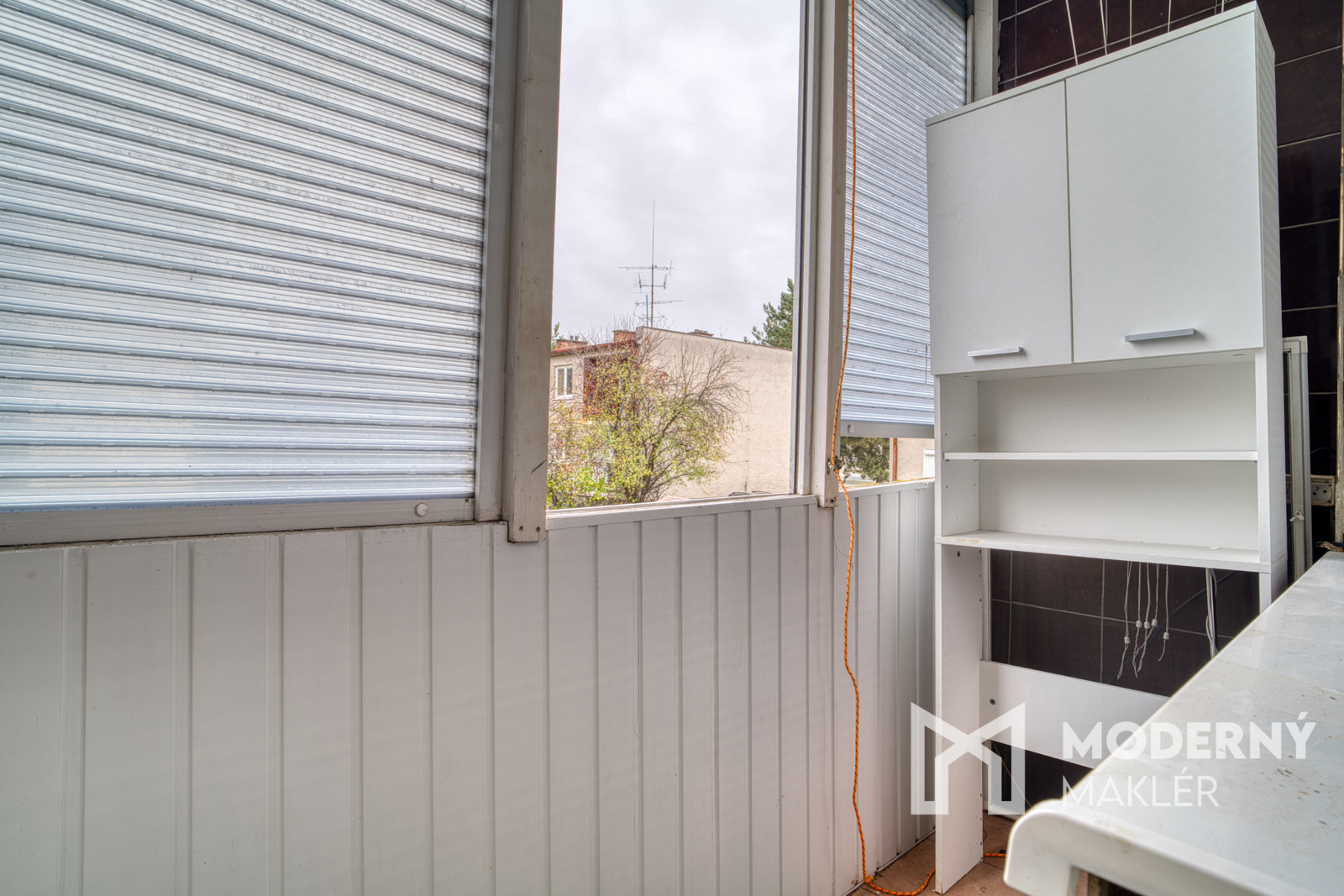 Nehnuteľnosť sa prenajíma kompletne zariadená – kompletne zariadená kuchynská linka s dostatočným úložným priestorom a spotrebičmi (varná doska, elektrická rúra, digestor, chladnička s mrazničkou, umývačka riadu), jedálenský barový stolík, 4x barová stolička, obývačková zostva (skrinka pod TV, 2x nástnná vitrína, 2x polica, komoda, otvorená komoda), konferenčný stolík, manželská posteľ, 2 nočný stolík, otvorená knižnica, vstavaná skriňa, policová skriňa. Balkón je v prípade nepriaznivého počasia krytý vonkajšími zaťahovacími roletami.