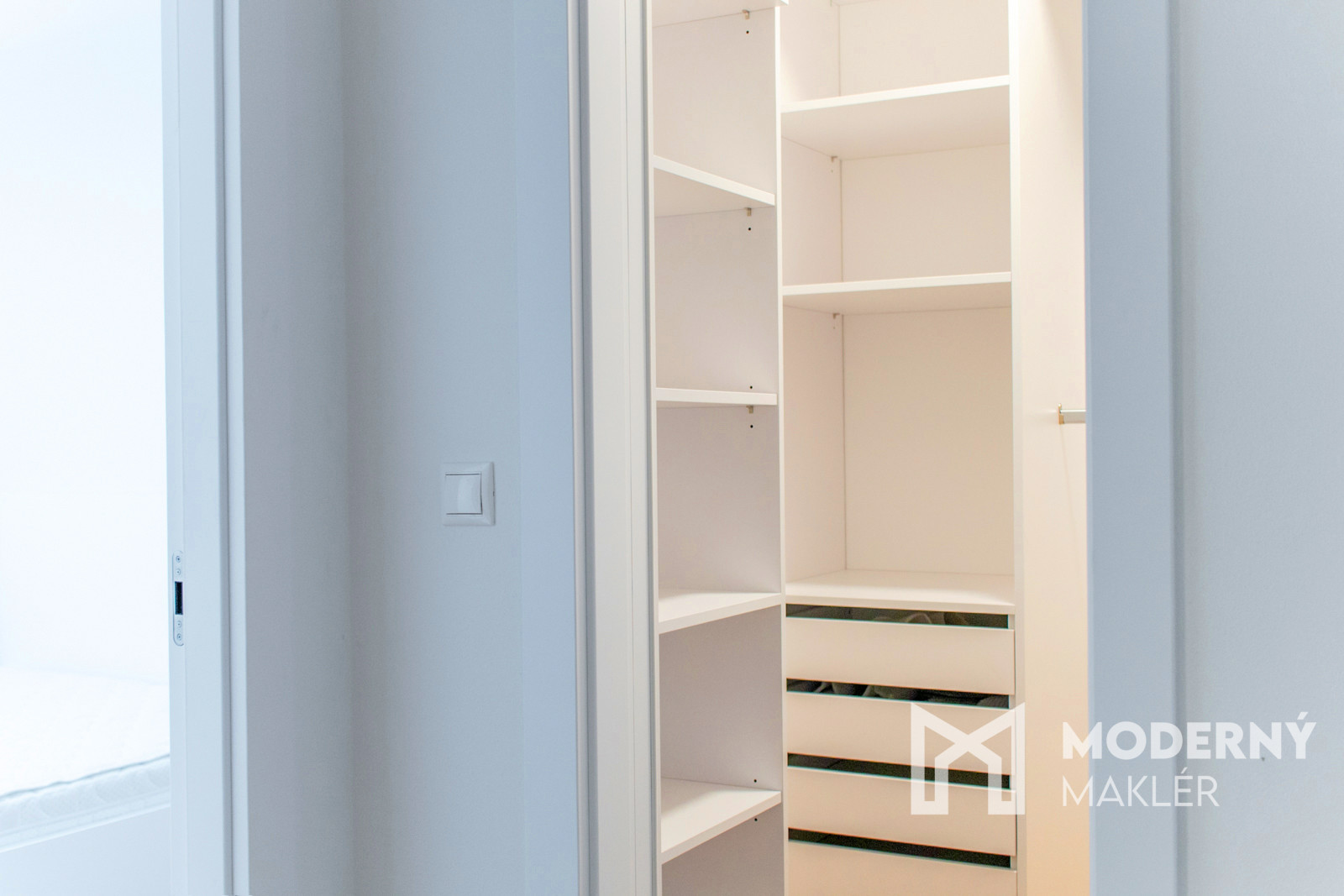 Nehnuteľnosť sa prenajíma čiastočne zariadená. V byte sa nachádza šatník s úložným priestorom a praktickým vešiakovým systémom. Hlavná spálňa je vybavená manželskou posteľou a nočnými stolíkmi. Obývacia izba disponuje sedacou súpravou so stolíkom, závesným nábytkom, televízorom a komodou. Jedálenská časť je vybavená stolom pre štyroch ľudí so stoličkami. Kuchyňa má modernú linku s kompletným vybavením spotrebičov. Kúpeľňa je vybavená dvoma umývadlami, automatickou pračkou so sušičkou a veľkým sprchovým kútom.