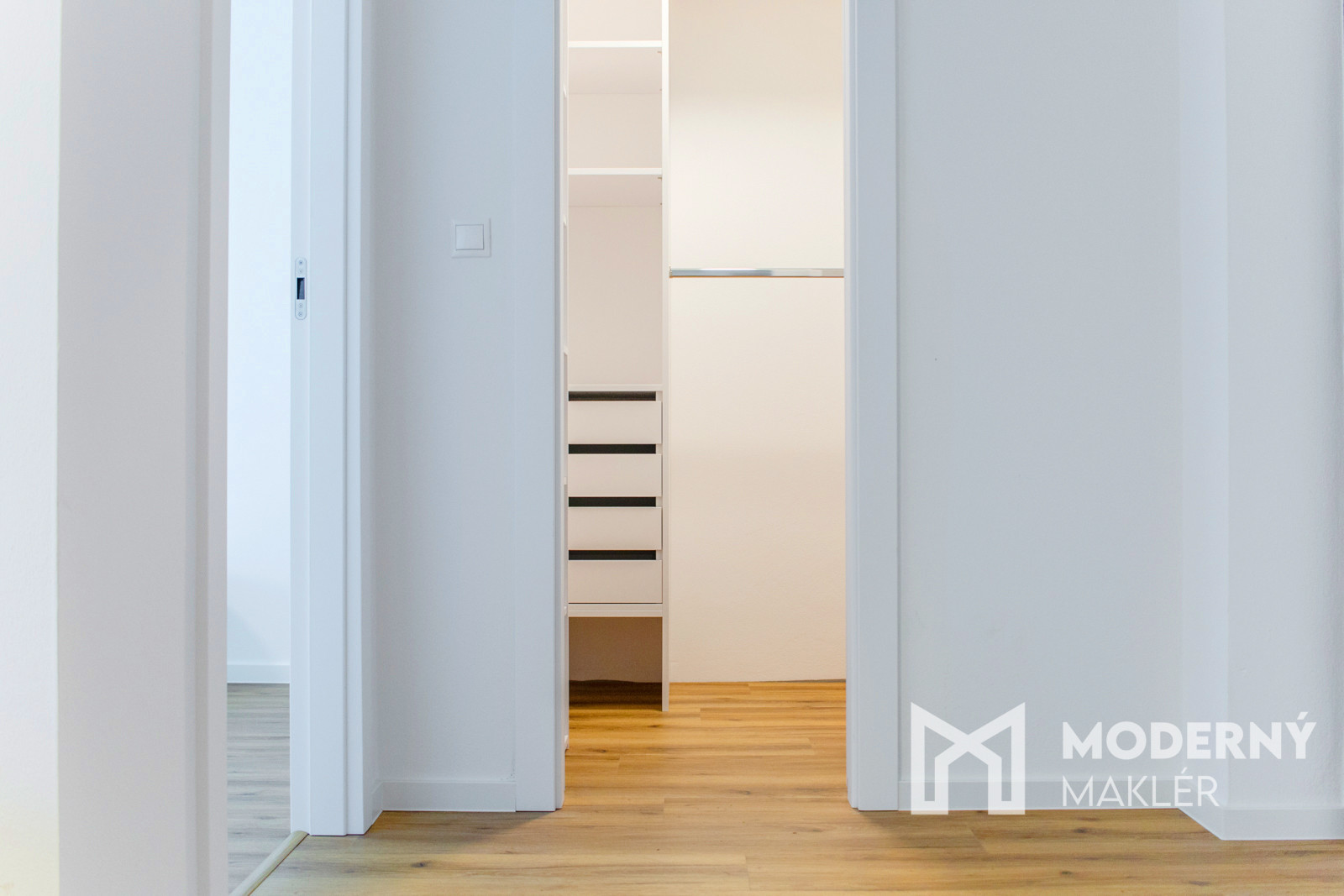 Byt sa skladá z priestrannej vstupnej chodby, z ktorej sa dostanete do všetkých miestností. Po pravej strane chodby nájdete samostatný šatník pre pohodlné uloženie oblečenia. Z chodby máte priamy vstup do hlavnej spálne a taktiež do otvoreného priestoru, ktorý zahŕňa obývaciu izbu s výstupom na veľkometrážny balkón, kuchynskú časť s vlastným výstupom na druhý balkón a jedálenskú časť. V zadnej časti bytu sa nachádza samostatná toaleta, veľkorysá kúpeľňa a samostatná izba, ktorá poskytuje flexibilitu využitia ako pracovňa alebo hosťovská izba.