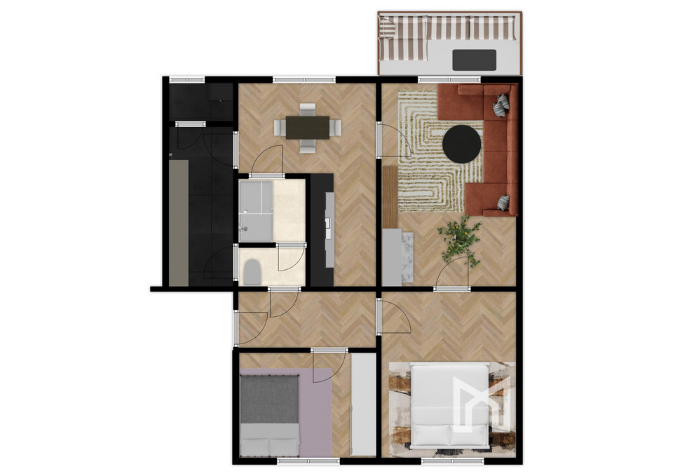 Byt sa skladá z priestrannej chodby, ktorá prepája všetky miestnosti, samostatného WC, dvoch izieb, kuchyne, komfortnej obývacej izby, kúpeľne s vaňou a umývadlom, praktického šatníka a špajze pre dodatočné úložné priestory. Z bytu je prístup na balkón s orientáciou východ-západ, ktorý poskytuje príjemné svetelné podmienky počas celého dňa.