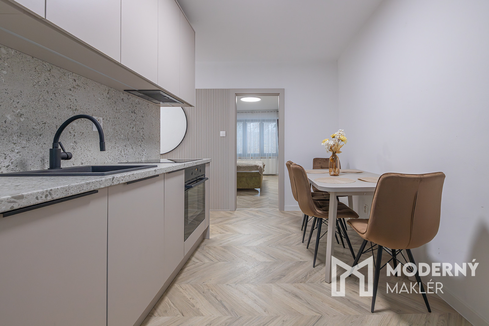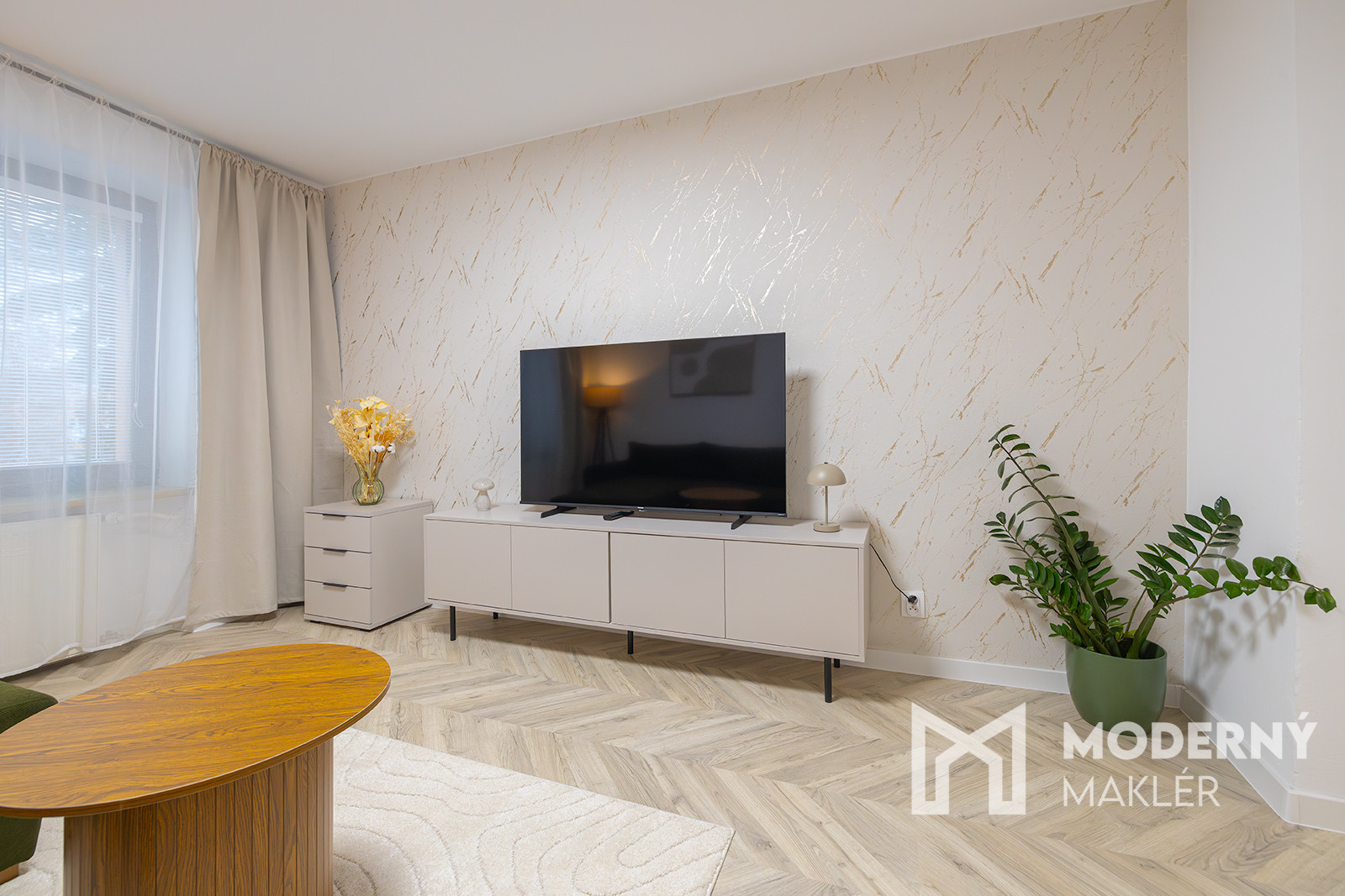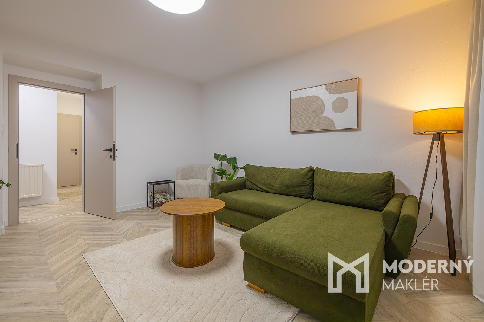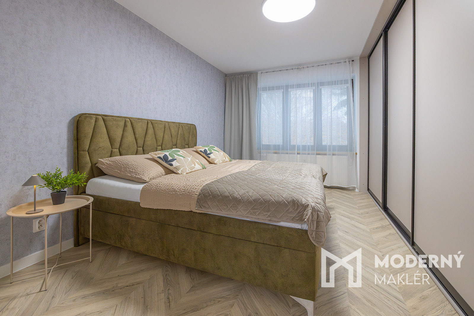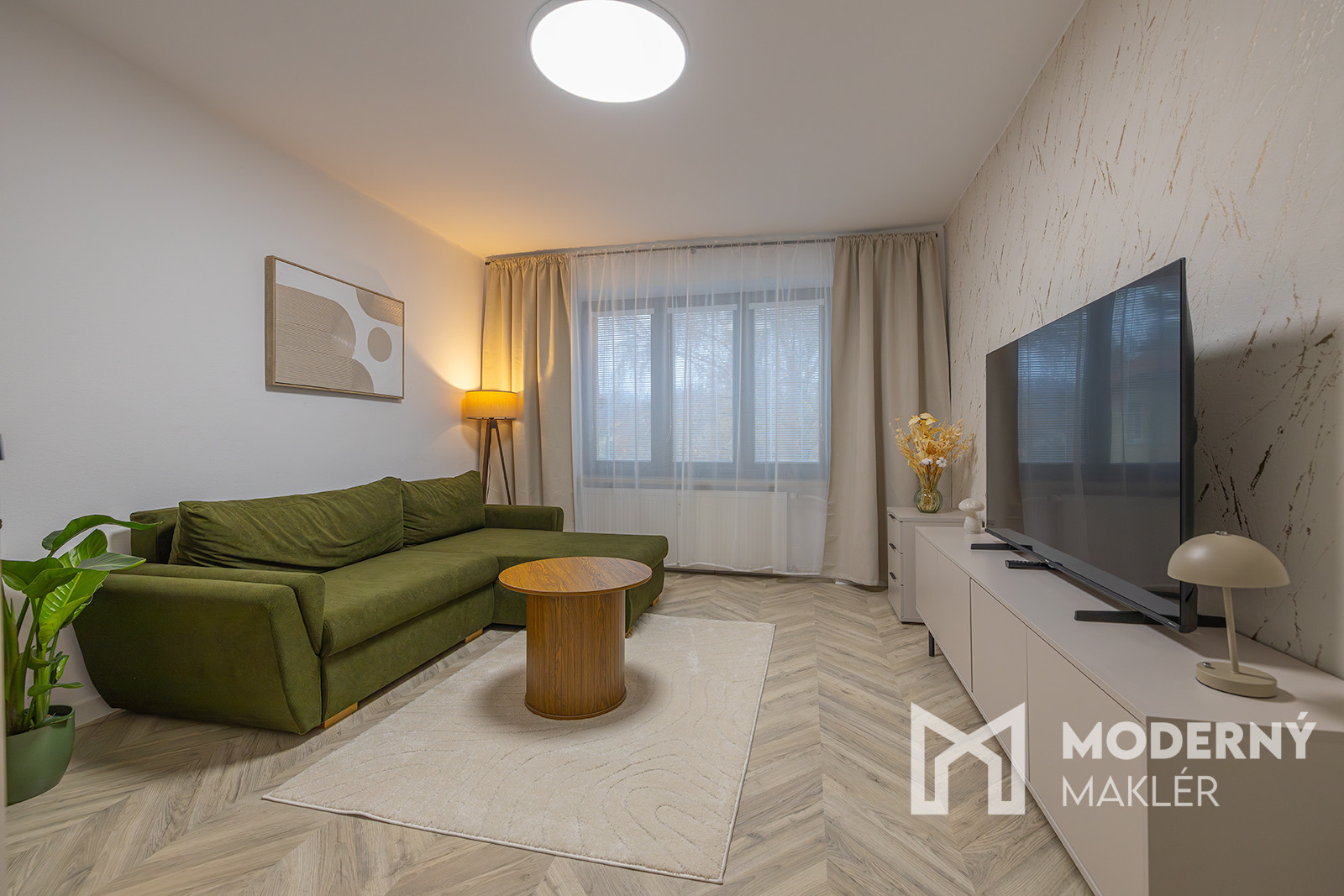 Byt je kompletne a štýlovo zariadený, s úplne novým vybavením a zariadením. Stačí sa nasťahovať len s osobnými vecami a okamžite si užívať komfort moderného bývania. V obývacej izbe sa nachádza gauč, kreslo, konferenčný stolík, TV skrinka, komoda, televízor. Spálňa disponuje veľkou vstavanou skriňou po celej dĺžke izby, novou manželskou posteľou s matracom, paplónmi, vankúšmi, posteľnou bielizňou a nočnými stolíkmi s lampičkami. V kuchyni nájdete novú kuchynskú linku so vstavanými spotrebičmi (umývačka riadu, rúra, sporák, digestor, mikrovlnka), chladničku s mrazničkou, jedálenský stôl so stoličkami a kompletné kuchynské vybavenie – taniere, poháre, šálky, príbory, panvice, hrnce a pod. V kúpeľni sa nachádza vaňa, umývadlo so skrinkou, toaleta a nová kombinovaná práčka so sušičkou. Komora je prispôsobená na využitie ako šatník - praktický úložný priestor na obuv, kabáty a sezónne veci.