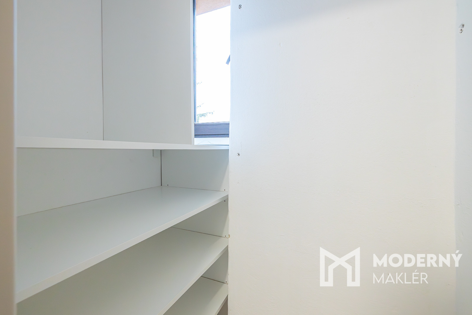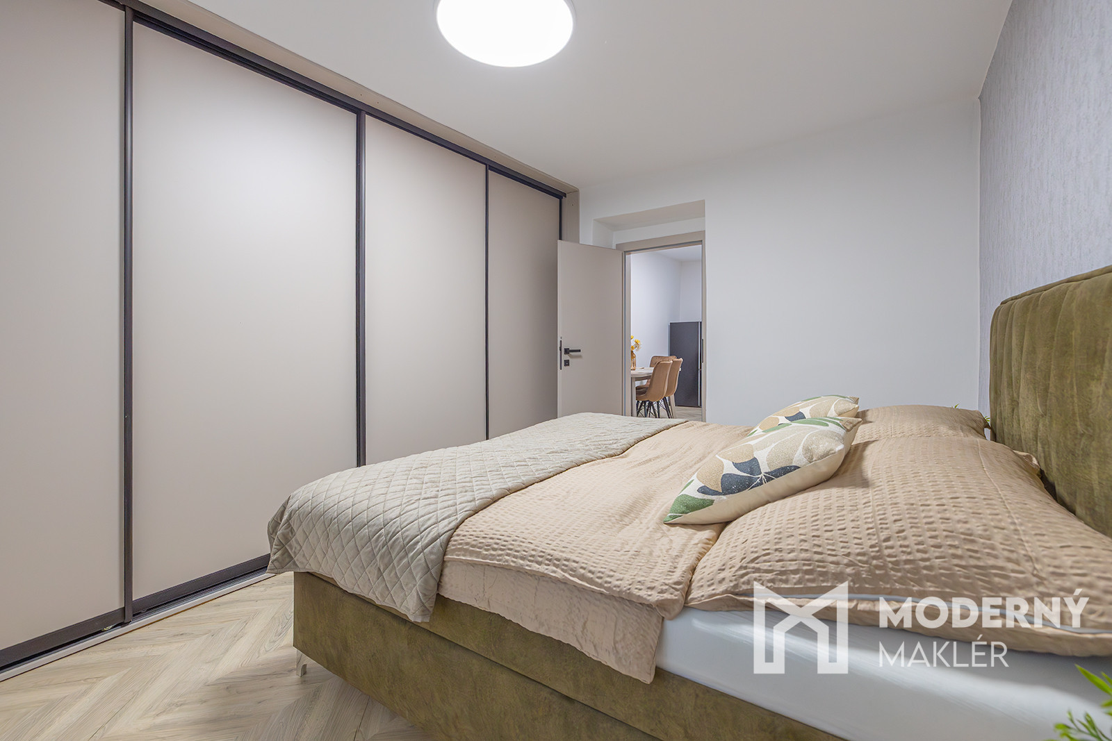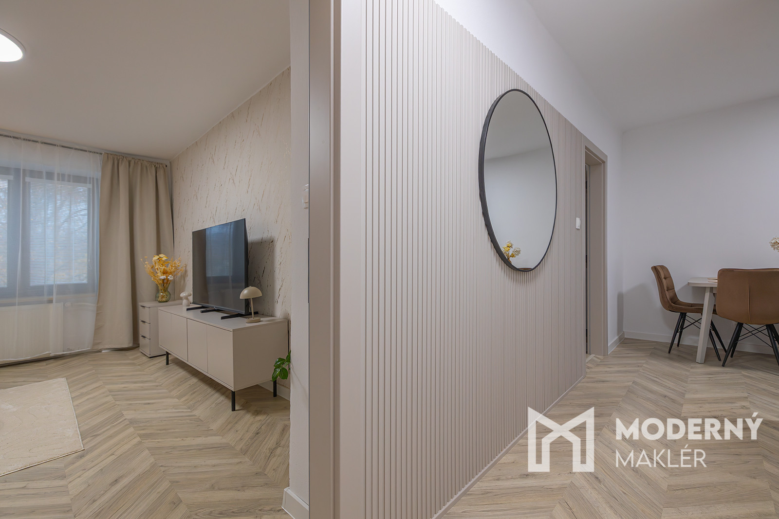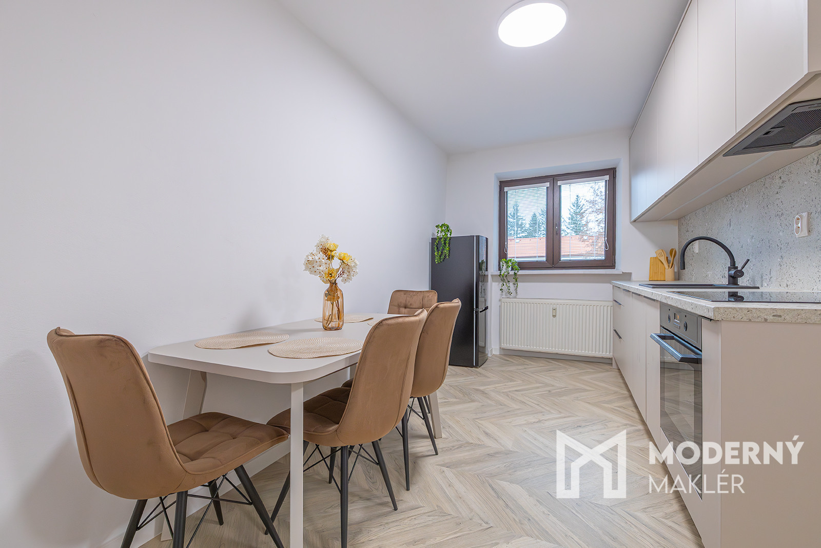Byt je kompletne a štýlovo zariadený, s úplne novým vybavením a zariadením. Stačí sa nasťahovať len s osobnými vecami a okamžite si užívať komfort moderného bývania. V obývacej izbe sa nachádza gauč, kreslo, konferenčný stolík, TV skrinka, komoda, televízor. Spálňa disponuje veľkou vstavanou skriňou po celej dĺžke izby, novou manželskou posteľou s matracom, paplónmi, vankúšmi, posteľnou bielizňou a nočnými stolíkmi s lampičkami. V kuchyni nájdete novú kuchynskú linku so vstavanými spotrebičmi (umývačka riadu, rúra, sporák, digestor, mikrovlnka), chladničku s mrazničkou, jedálenský stôl so stoličkami a kompletné kuchynské vybavenie – taniere, poháre, šálky, príbory, panvice, hrnce a pod. V kúpeľni sa nachádza vaňa, umývadlo so skrinkou, toaleta a nová kombinovaná práčka so sušičkou. Komora je prispôsobená na využitie ako šatník - praktický úložný priestor na obuv, kabáty a sezónne veci.