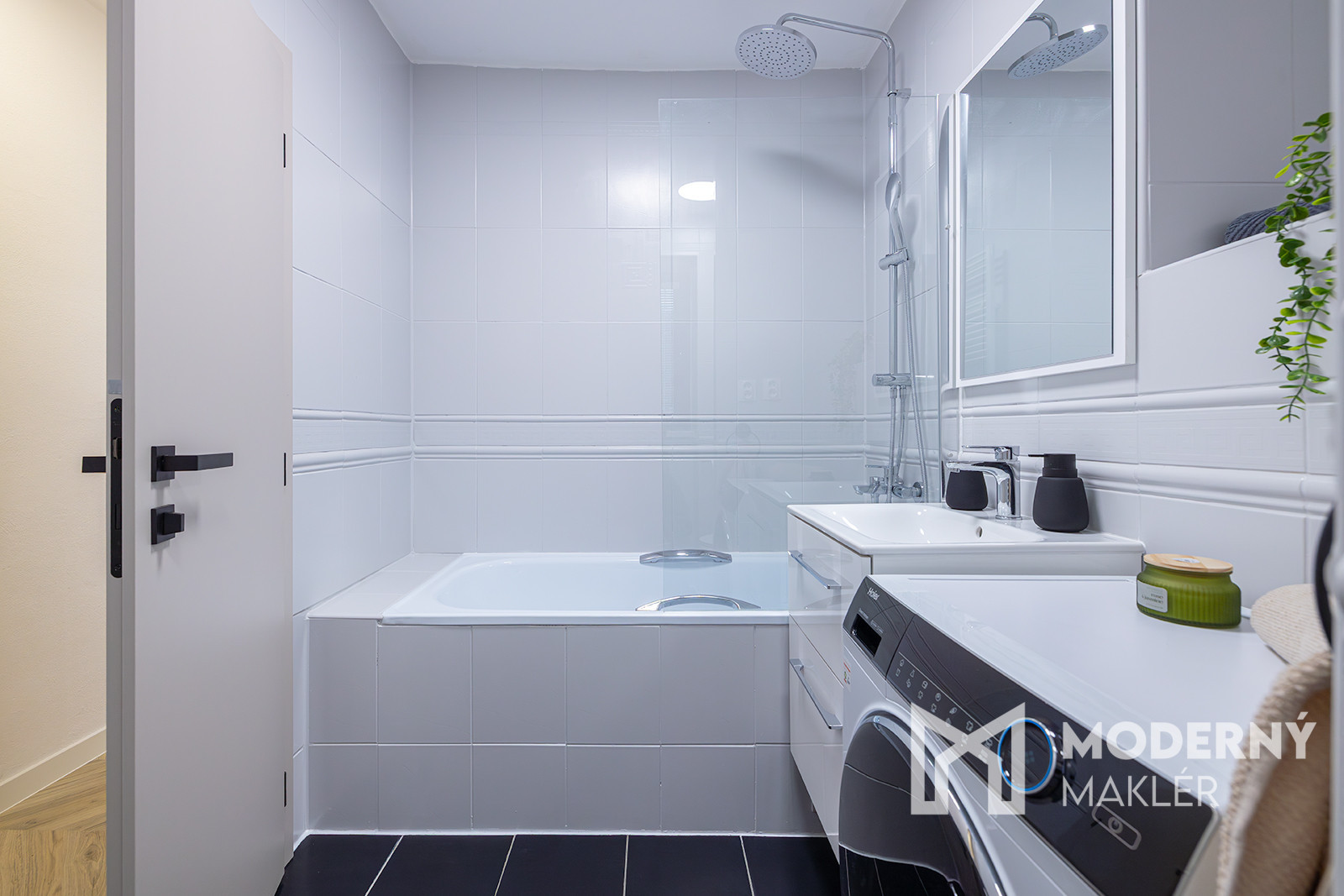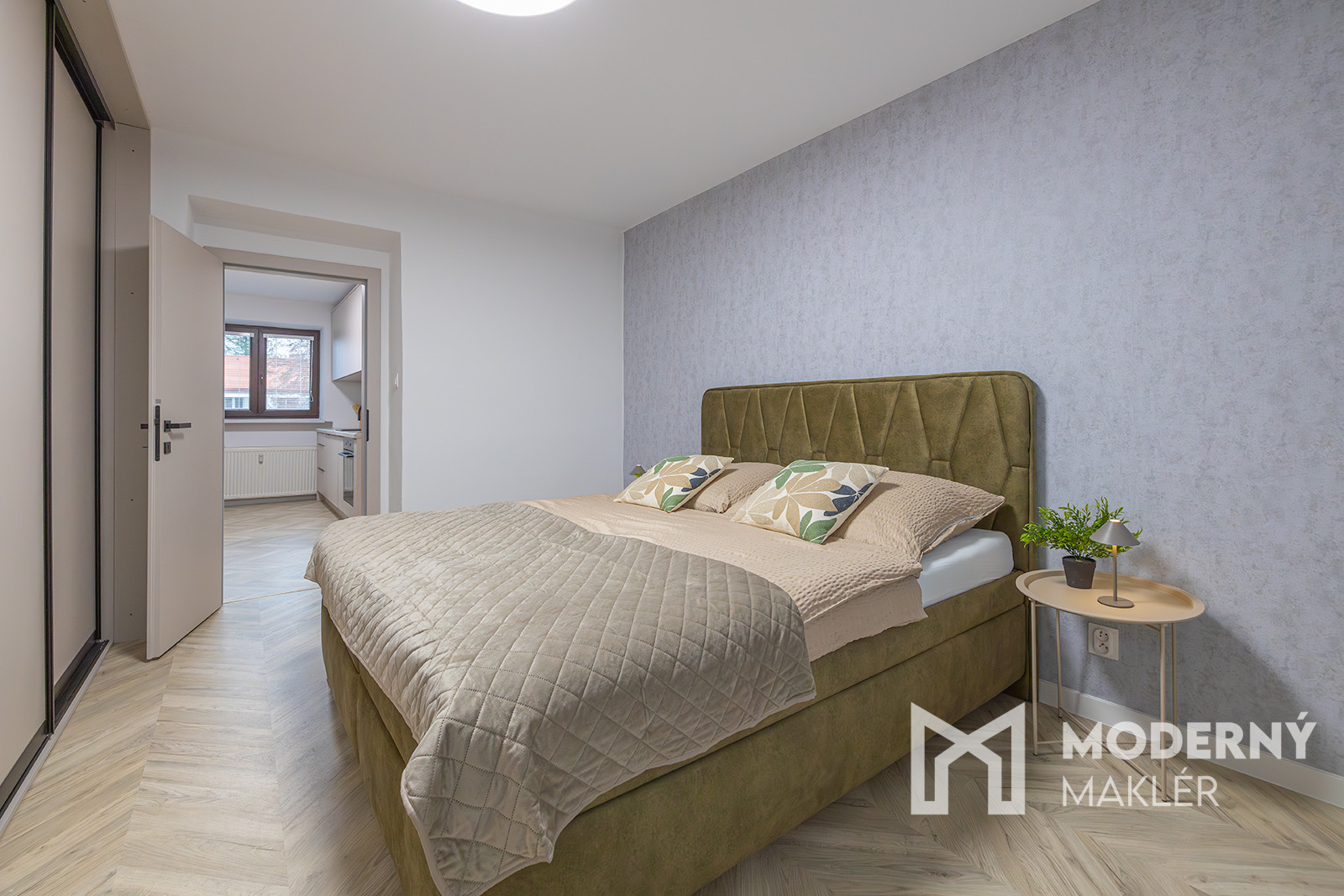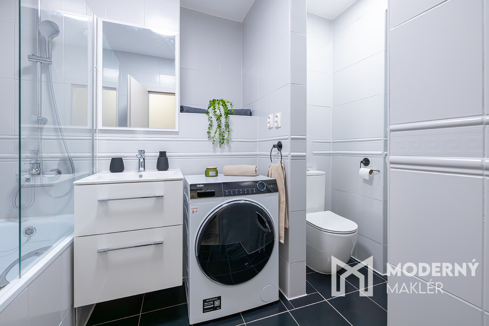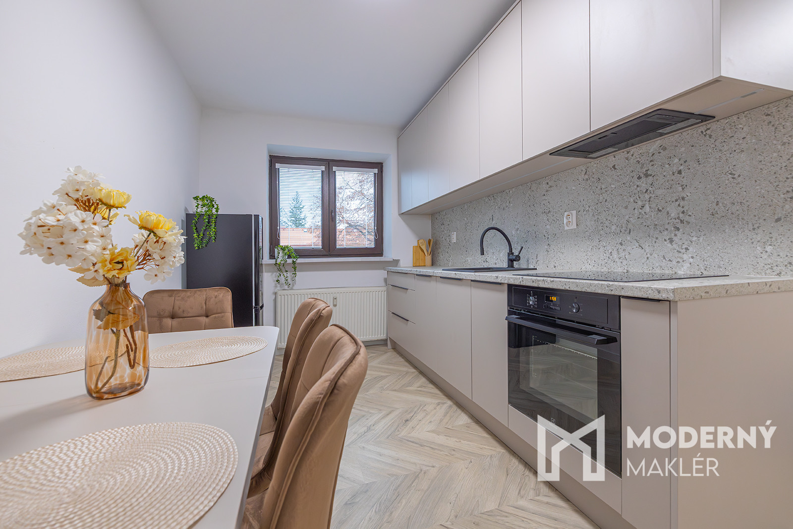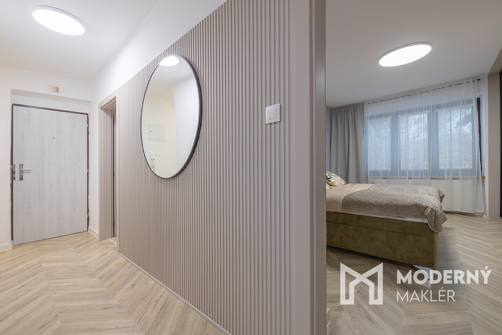 Byt je kompletne a štýlovo zariadený, s úplne novým vybavením a zariadením. Stačí sa nasťahovať len s osobnými vecami a okamžite si užívať komfort moderného bývania. V obývacej izbe sa nachádza gauč, kreslo, konferenčný stolík, TV skrinka, komoda, televízor. Spálňa disponuje veľkou vstavanou skriňou po celej dĺžke izby, novou manželskou posteľou s matracom, paplónmi, vankúšmi, posteľnou bielizňou a nočnými stolíkmi s lampičkami. V kuchyni nájdete novú kuchynskú linku so vstavanými spotrebičmi (umývačka riadu, rúra, sporák, digestor, mikrovlnka), chladničku s mrazničkou, jedálenský stôl so stoličkami a kompletné kuchynské vybavenie – taniere, poháre, šálky, príbory, panvice, hrnce a pod. V kúpeľni sa nachádza vaňa, umývadlo so skrinkou, toaleta a nová kombinovaná práčka so sušičkou. Komora je prispôsobená na využitie ako šatník - praktický úložný priestor na obuv, kabáty a sezónne veci.