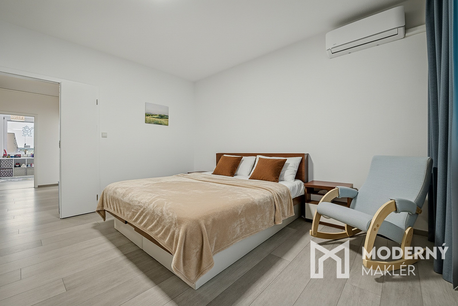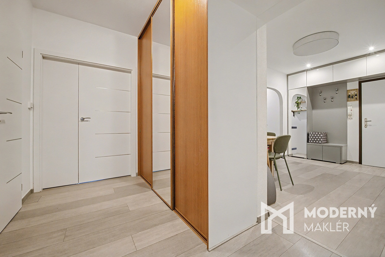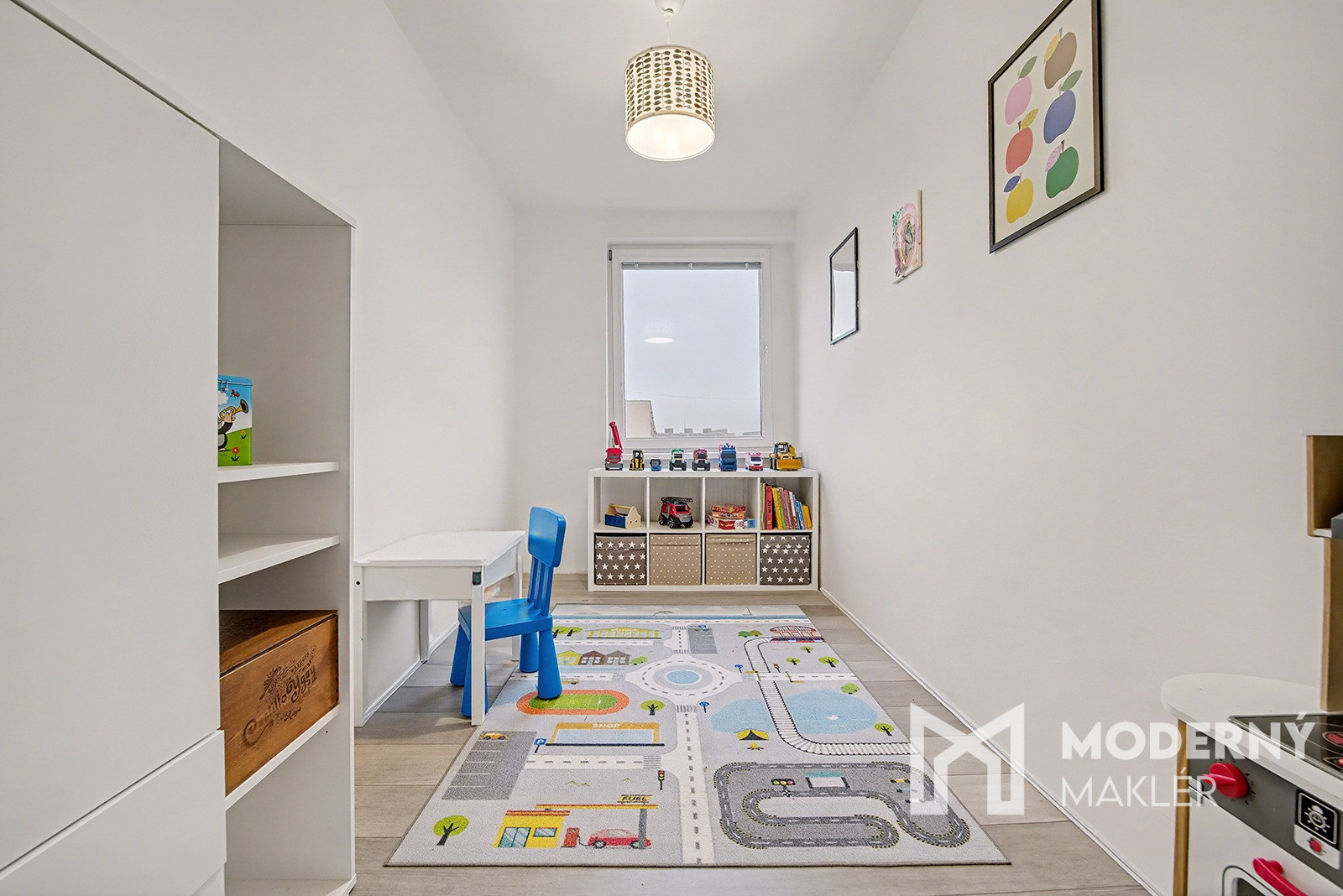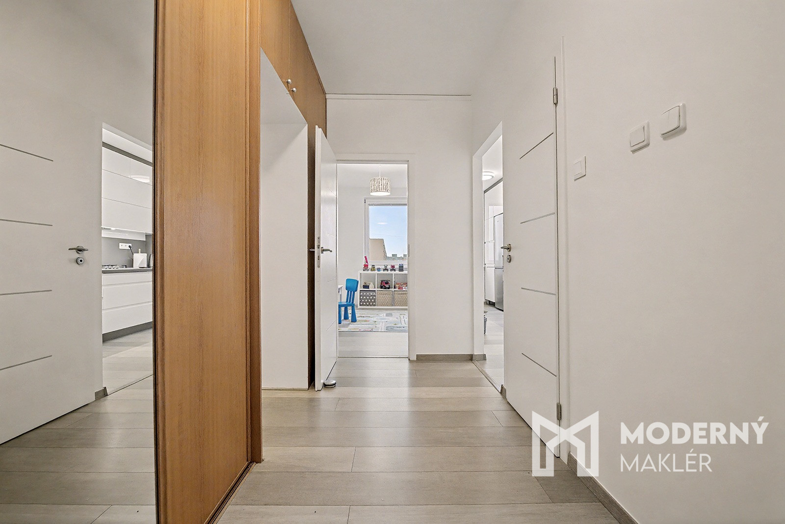 Byt sa skladá z priestrannej vstupnej chodby, ktorá je prepojená s hlavným vstupom do obývacej časti. V byte nájdete obývaciu izbu s výstupom na prvú loggiu, ktorá zabezpečuje prirodzené osvetlenie a príjemný kontakt s exteriérom. Zo vstupnej chodby pokračuje druhá chodba, z ktorej sú samostatné vstupy do jednotlivých miestností. Na ľavej strane sa nachádza detská izba, následne kuchyňa, ďalej samostatná toaleta a kúpeľňa. Na pravej strane je situovaný vstup do spálne s vlastným vstupom na druhú loggiu. Byt má západnú orientáciu a disponuje celkovo dvoma loggiami, ktoré poskytujú priestoru vzdušnosť a prirodzené svetlo.