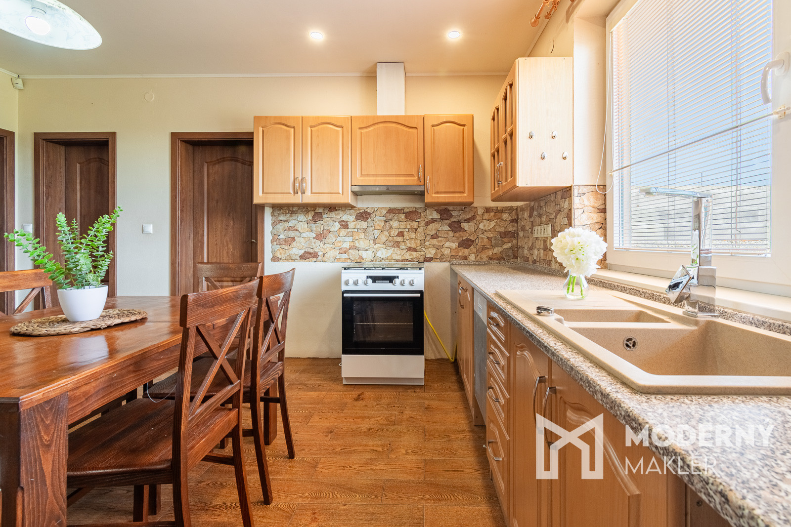 Dom sa predáva čiastočne zariadaný. Tvorí ho vstupná chodba, z ktorej sa vstupuje do priestrannej kuchyne spojenej s obývačkou. Otvorený priestor pôsobí svetlo a vzdušne, ideálny je na rodinný život aj spoločenské stretnutia. Ďalej sa v dome nachádzajú dve veľké nepriechodné izby, ktoré poskytujú dostatok súkromia a pohodlia. Komfort dopĺňa kúpeľňa vybavená vaňou aj sprchovým kútom, samostatné WC s umývadlom, technická miestnosť, praktický šatník a povala s rozlohou 57m2. Významným benefitom je aj samostatne stojaca hospodárska budova s rozlohou 40 m², ktorú je možné využiť na skladovanie alebo podľa individuálnych potrieb nového majiteľa.