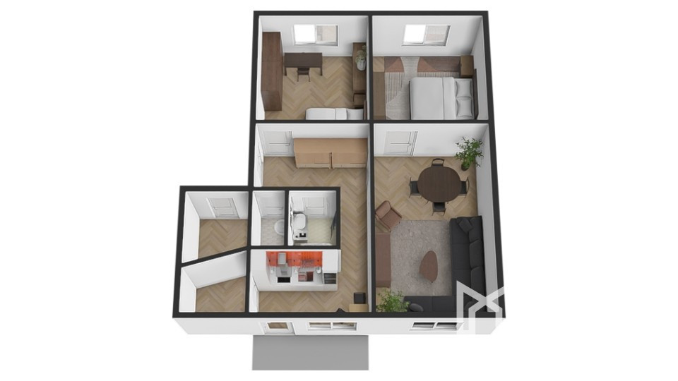 Nehnuteľnosť pozostáva zo vstupnej chodby, z ktorej sa plynulo dostanete do kuchyne, priestrannej obývačky a dvoch samostatných spální. K dispozícii je aj samostatná toaleta a kúpeľňa. Kuchyňa má výstup na balkón a priľahlú praktickú komoru, ktorá ponúka dodatočný úložný priestor. K bytu prislúcha aj murovaná pivnica umiestnená priamo pred vstupom. Obývačka spolu s kuchyňou sú orientované na západ a ponúkajú nádherný výhľad na Vysoké Tatry, zatiaľ čo dve spálne smerujú na východ.