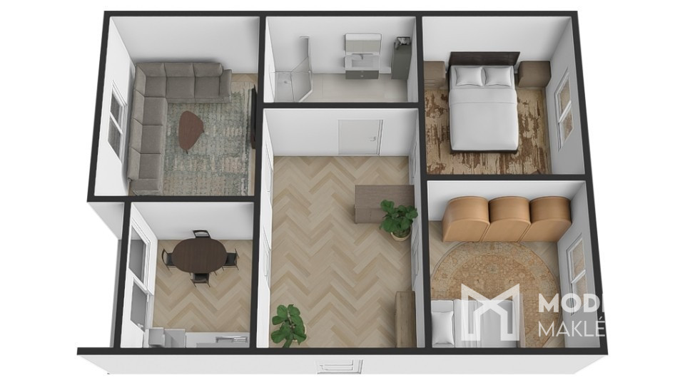 V byte zostáva kuchynská linka so spotrebičmi (sporák, digestor), vstavaná skriňa vo vstupnej chodbe. Byt sa skladá zo vstupnej chodby, ďalej z priestranná obývačka, ktorá tvorí srdce domova. V byte sa nacádzajú dve samostatné izby ideálne pre spálne alebo pracovňu, praktická kuchyňa určená na prípravu jedál a kúpeľňa s vaňou spojená s WC.