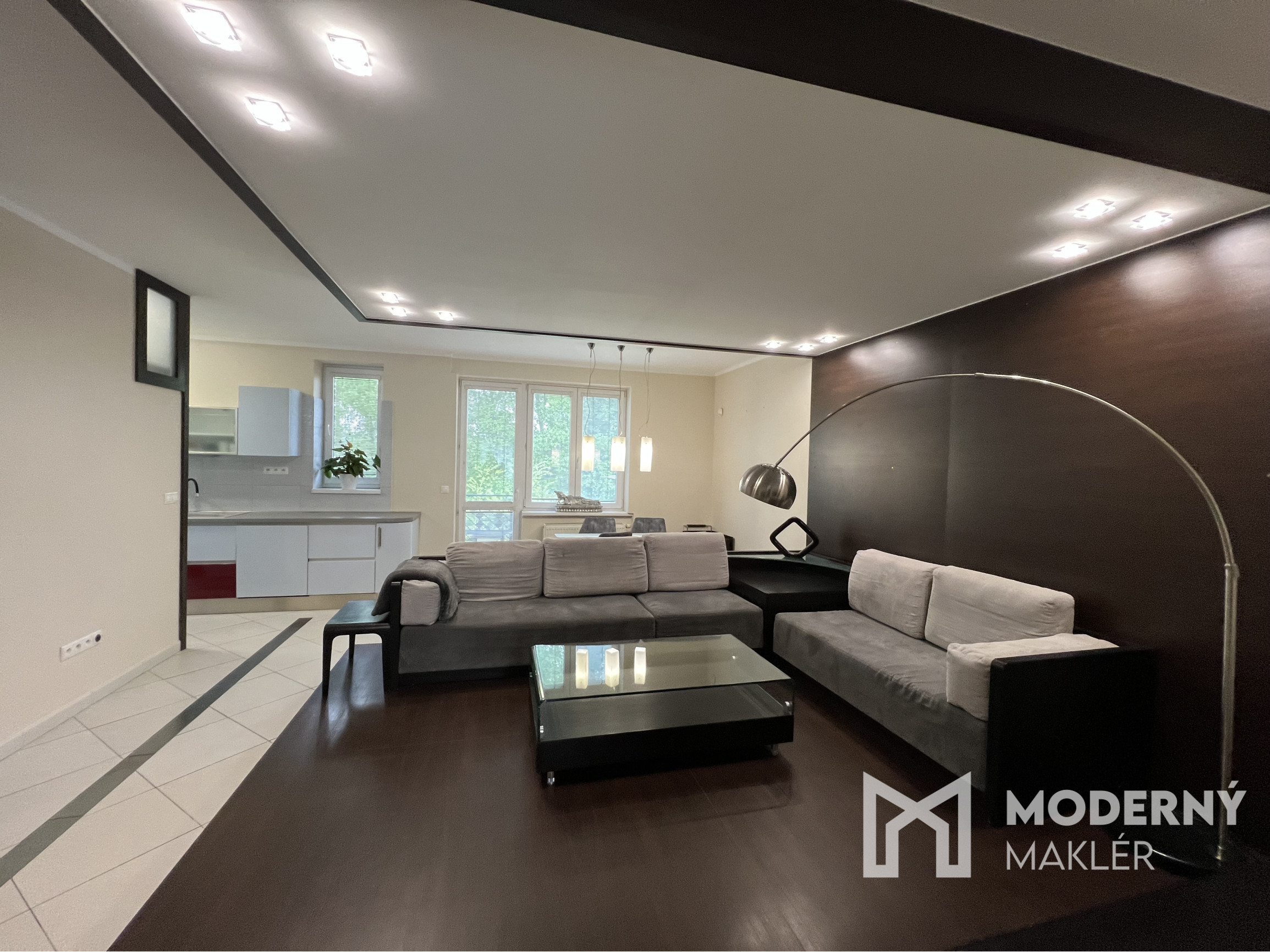 Hlavnú zónu bytu tvorí priestorovo maximálne veľkorysá obývacia izba - sedecia súprava, TV - internet + satelit, konferenčný stolík, malebné staré kachle, ktorá je spojená s jedálenskou časťou a kuchyňou - kuchynská linka na mieru-vstavané spotrebiče.