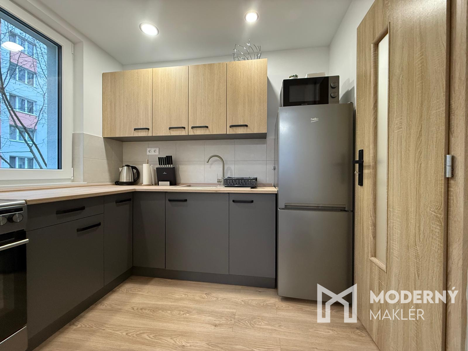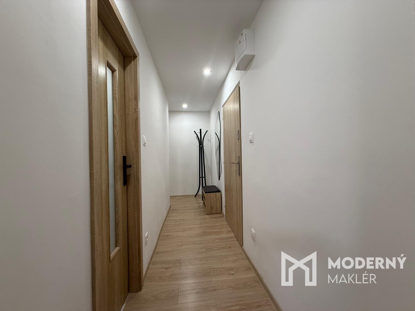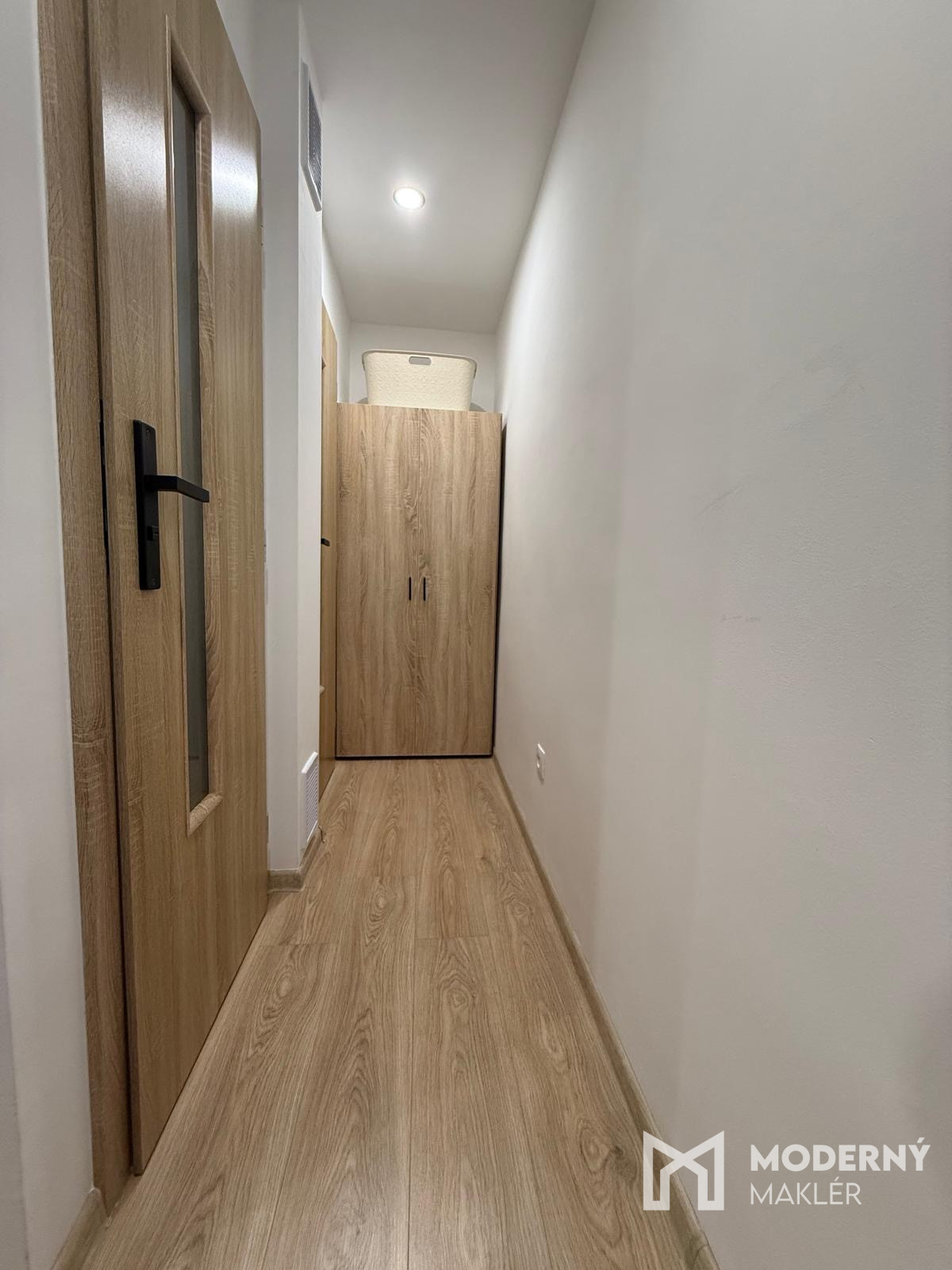 Nehnuteľnosť sa prenajíma kompletne zariadená a je pripravená na okamžité nasťahovanie. Vo vstupnej chodbe nájdete praktický vešiak, pohodlný sedák na prezúvanie a vstavaná skriňa s dostatočným priestorom. Kúpeľňa je vybavená sprchovým kútom, umývadlom so skrinkou, vešiakom a práčkou, pričom je k dispozícii aj samostatné WC. Obývacia izba ponúka pohodlný gauč, obývačkovú zostavu s úložným priestorom, konferenčný stolík a jedálenský stôl s dvoma stoličkami. Kuchyňa je kompletne vybavená chladničkou, mikrovlnnou rúrou, sporákom a plne zariadenou kuchynskou linkou vrátane kompletného drobného kuchynského inventára.