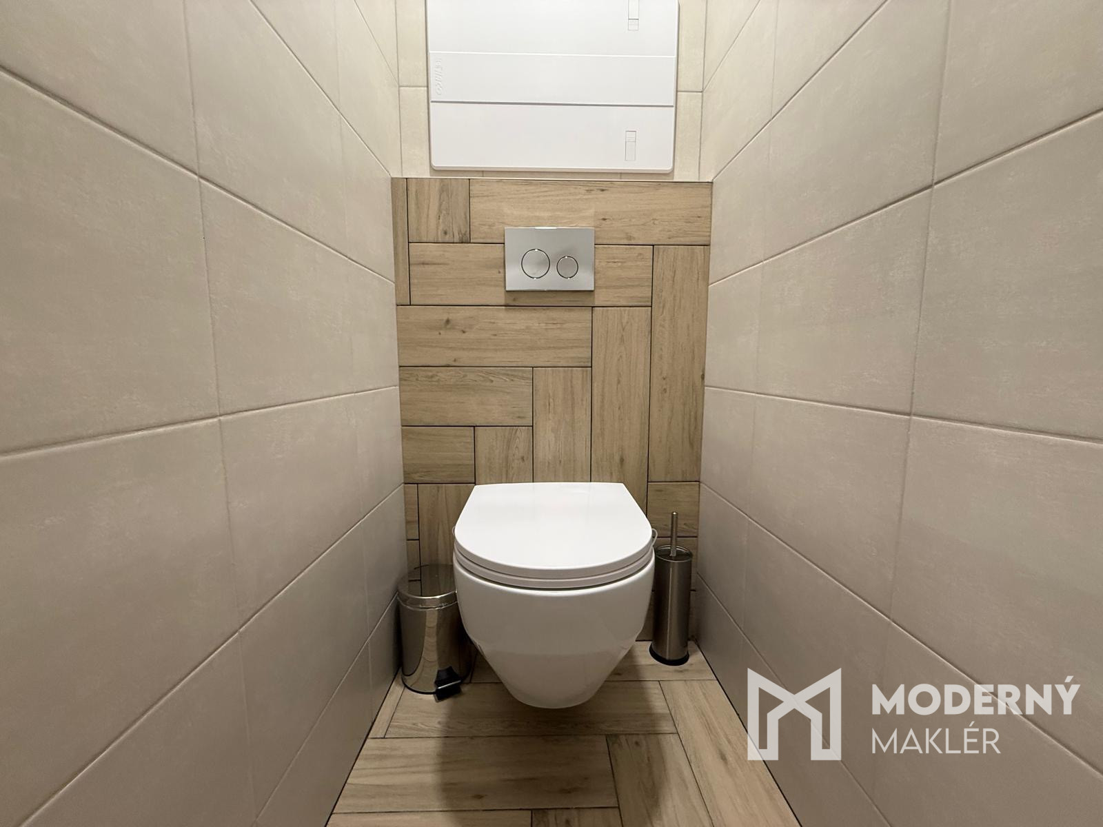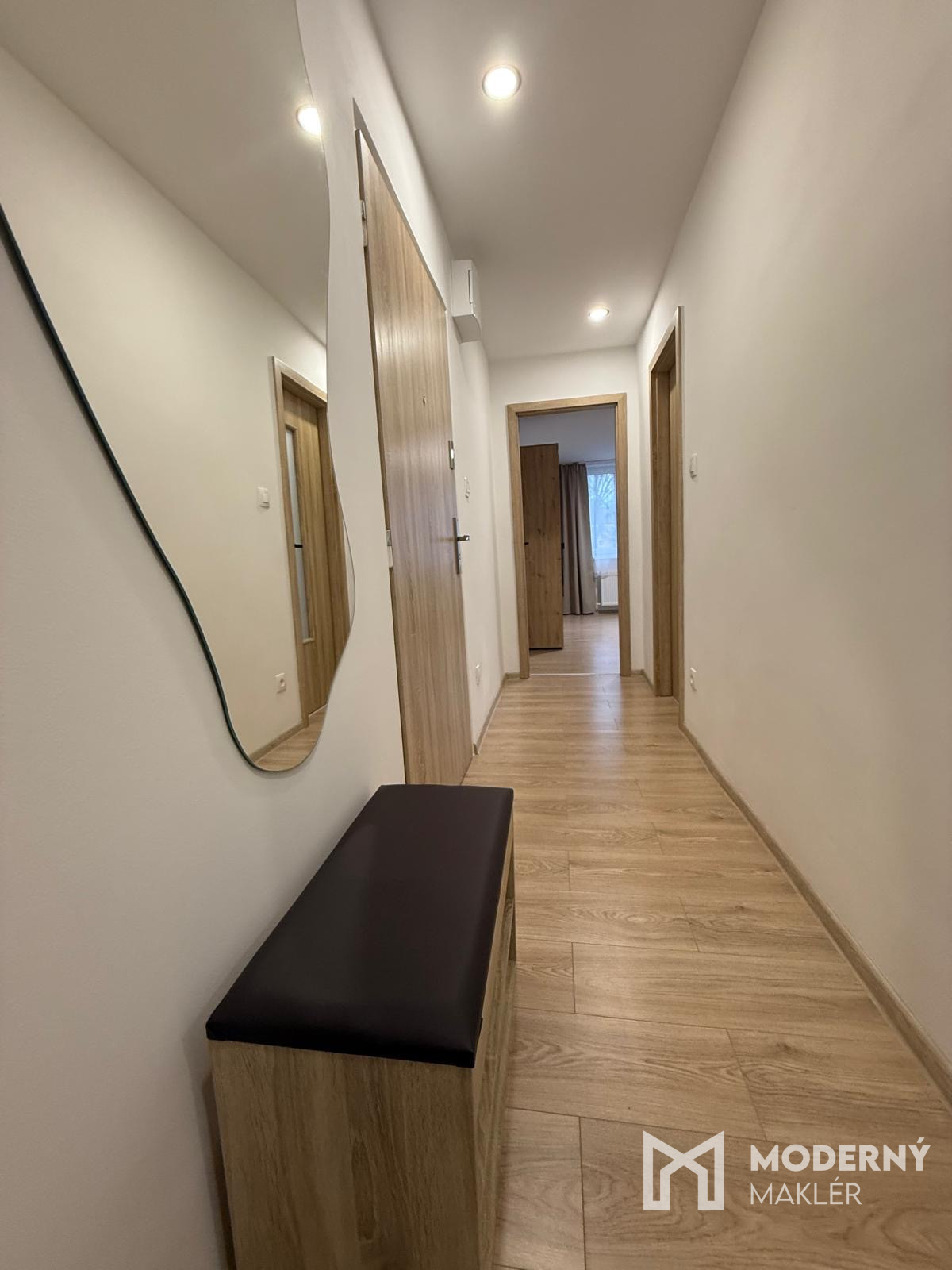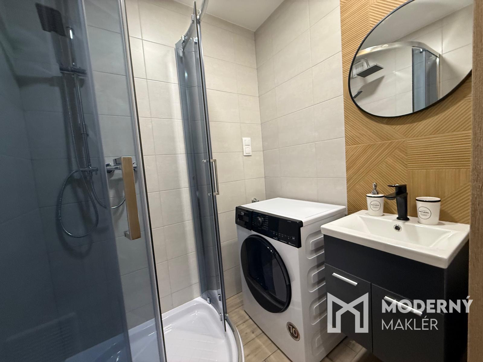 Nehnuteľnosť sa prenajíma kompletne zariadená a je pripravená na okamžité nasťahovanie. Vo vstupnej chodbe nájdete praktický vešiak, pohodlný sedák na prezúvanie a vstavaná skriňa s dostatočným priestorom. Kúpeľňa je vybavená sprchovým kútom, umývadlom so skrinkou, vešiakom a práčkou, pričom je k dispozícii aj samostatné WC. Obývacia izba ponúka pohodlný gauč, obývačkovú zostavu s úložným priestorom, konferenčný stolík a jedálenský stôl s dvoma stoličkami. Kuchyňa je kompletne vybavená chladničkou, mikrovlnnou rúrou, sporákom a plne zariadenou kuchynskou linkou vrátane kompletného drobného kuchynského inventára.