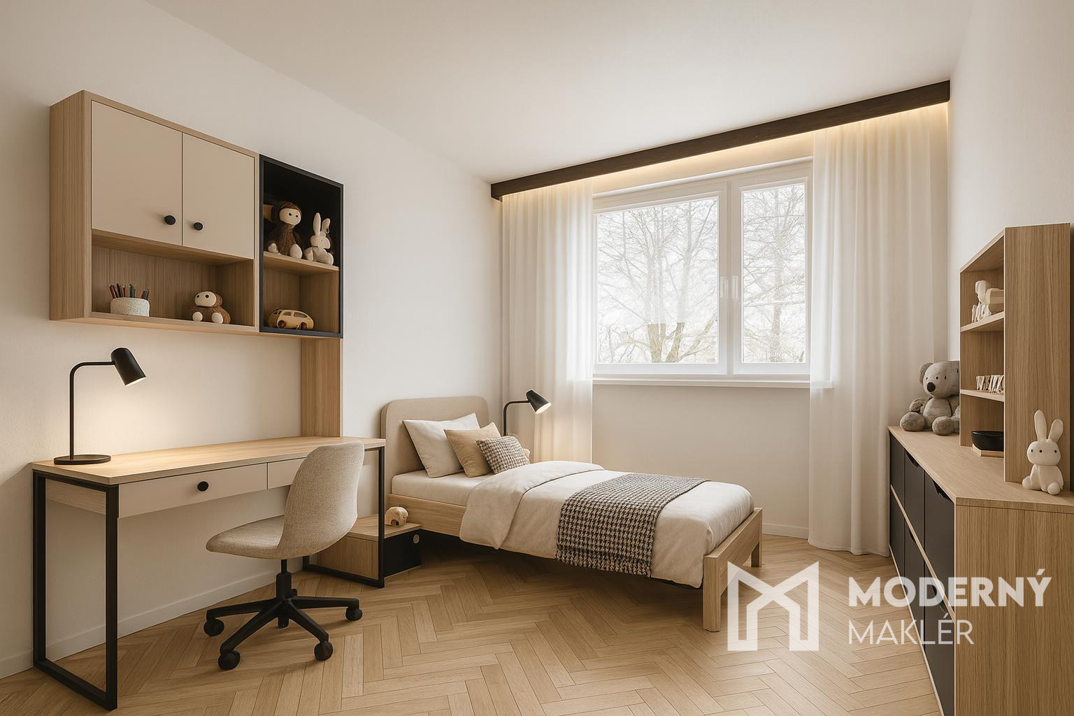 Byt sa skladá zo vstupnej chodby. Nachádza sa tu priestranná obývacia izba, kuchyňa, z ktorej máte priamy vstup na balkon. Ďalej nájdete samostatné WC a kupelňu pre väčšie pohodlie. Byt ponúka spálňu a detskú izbu, pričom detská izba má flexibilné riešenie a je možné ju rozdeliť na dve samostatné izby podľa vašich potrieb. Orientácia bytu je veľmi príjemná - kuchyňa s obývačkou smeruje na juh, čo zaručuje dostatok prirodzeného svetla počas celého dňa, zatiaľ čo spálňa s detskou izbou je orientovaná na sever, čo poskytuje pokojné prostredie na odpočinok.