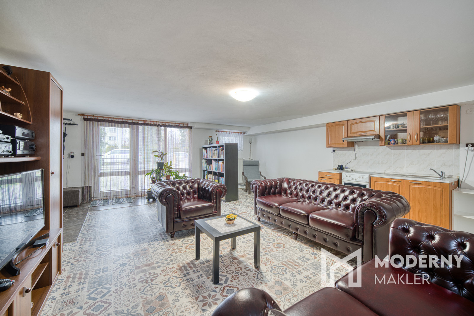 V suteréne sa nachádza veľká práčovňa so sprchovacím kútom, samostatné WC, technická miestnosť, komora, izba so šatníkom vhodná aj ako hosťovská izba a priestranná obytná miestnosť s veľkým francúzskym oknom a priamym vstupom na dvor.
