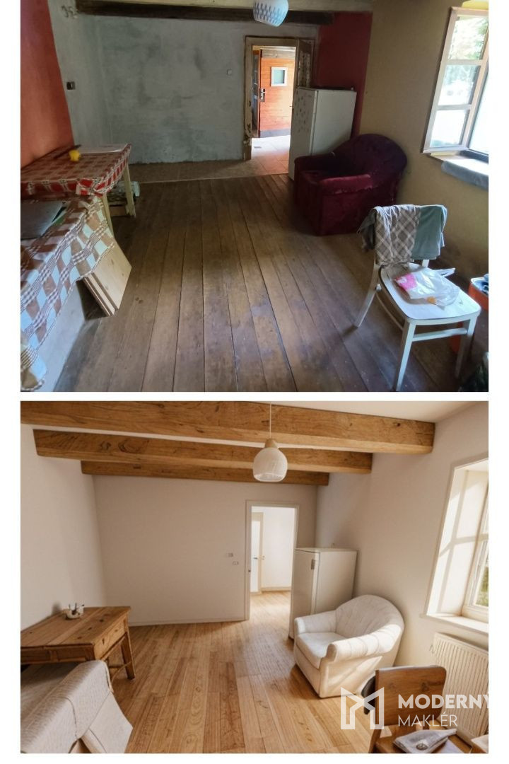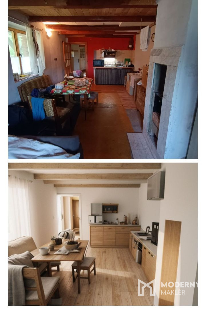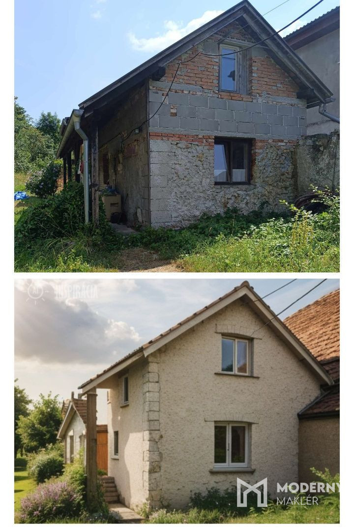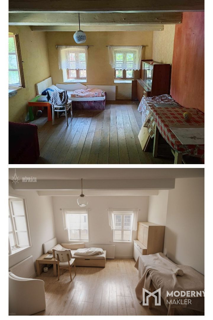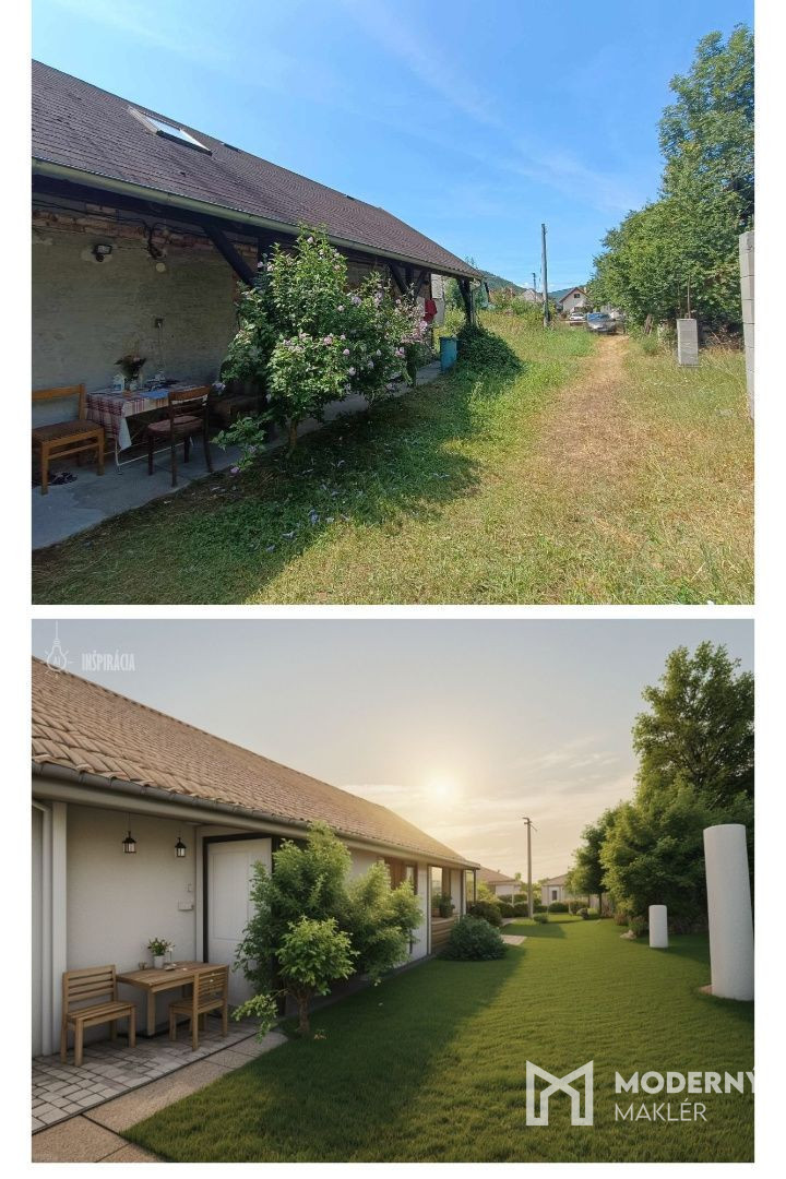 Ponúkame Vám na predaj starú dobovú chalupu /pozostávajúcu z 2 malých domčekov/, ktorá môže slúžiť po rekonštrukcii ako rekreačný domček v obci Slatina nad Bebravou. Chalupa prešla čiastočnou rekonštrukciou, ktorá zahrnula komplet novú strechu, elektroinštaláciu, napojenie domu na obecný vodovod. Odpad je zvedený do žumpy. Dispozične chalupu tvorí: vstupná chodba, z ktorej je vchod do kúpeľne spojenej s wc. Ďalej sa v dome nachádza samostatná izba a jedna veľká priestranná miestnosť - momentálne využívaná ako kuchyňa spojená s obývacou časťou. Vchod na povalu domu je cez vonkajšie schodisko. Tu je možnosť do budúcna z-obytniť podkrovie. Vstup do domu je cez spoločný dvor - je tu možnosť vybudovať si samostatný vchod, chalupa sa nachádza v zadu na pozemku, čo poskytuje dostatok súkromia. Pozemok pod domom aj záhrada sú nevysporiadané /sú 2 žijúci vlastníci, zvyšnú časť spravuje SPF - vieme zabezpečiť právnu pomoc s vyporiadaním/. Celková výmera pozemku je 3598m2, s toho podiel predávajúceho je 706m2. Momentálne je chalupa využívaná ako rekreačný dom. Vo foto-dokumentácii Vám prinášame aj náhľad možnej prípadnej rekonštrukcie. Cena 34 400 €. Obhliadku si môžete zabezpečiť na 0949 171 917. prípadne e-mailom: puterkova@spektrumreality.sk