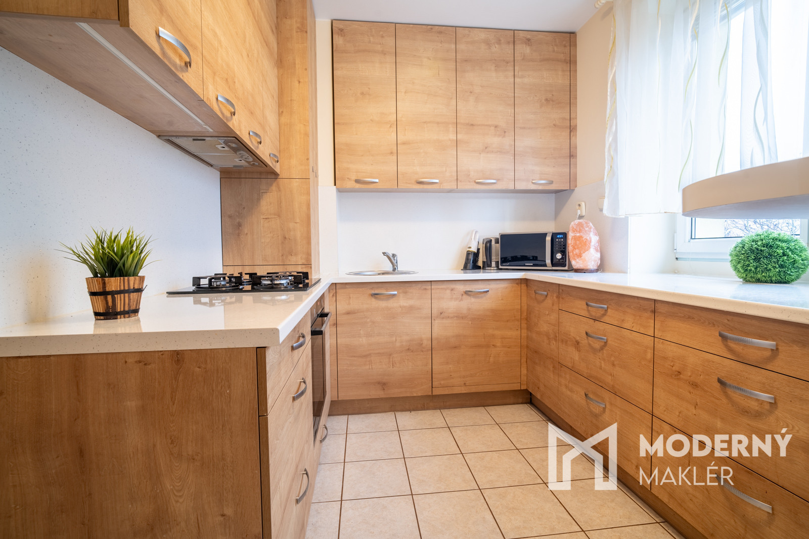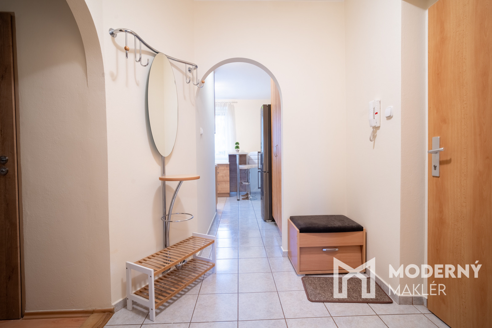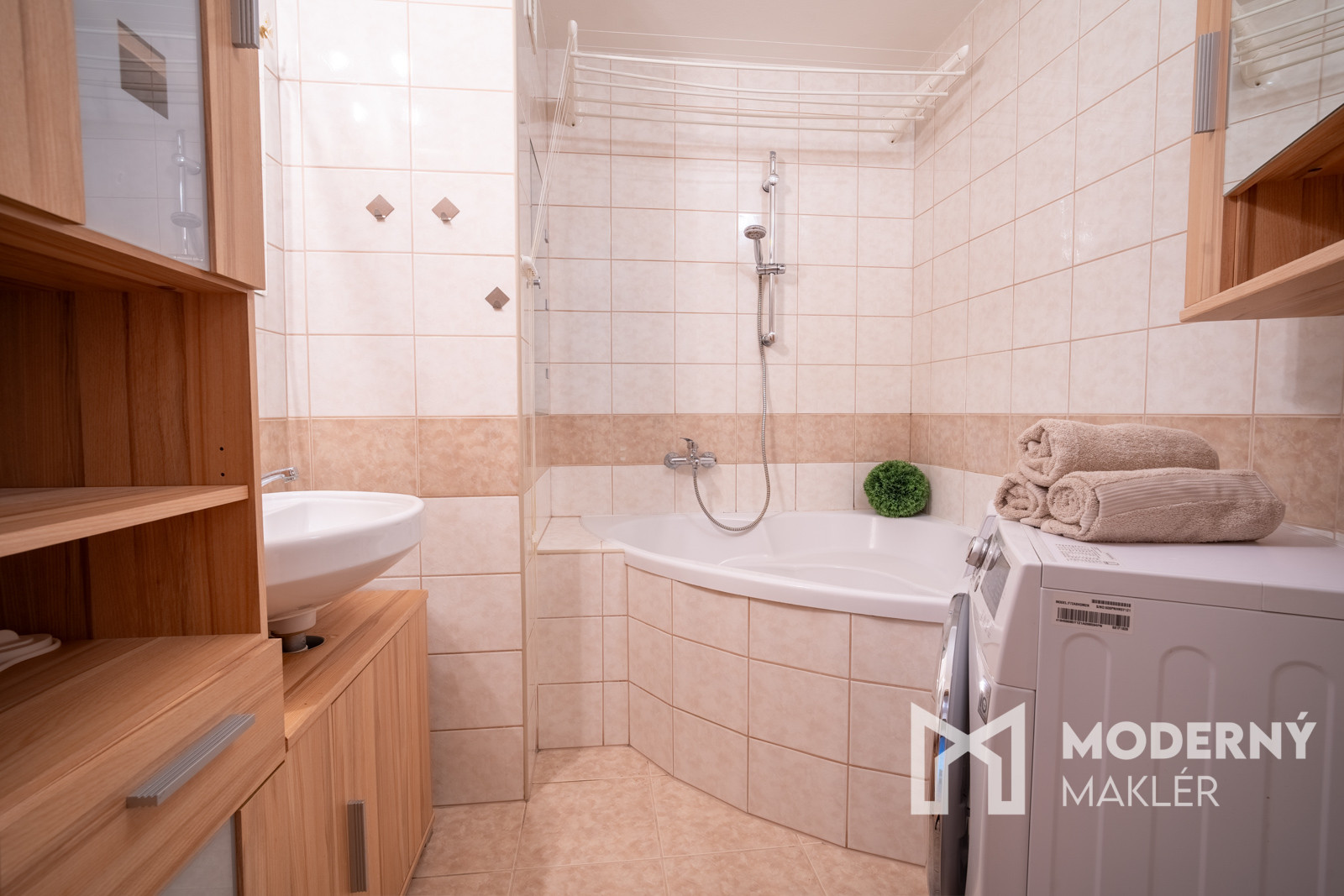 Nehnuteľnosť sa prenajíma kompletne zariadená. Kuchyňa je vybavená kompletnou kuchynskou linkou vrátane všetkých spotrebičov a potrebného vybavenia. Obývacia miestnosť ponúka jedálenský stôl s pohodlnými štyrmi stoličkami, veľkú rohovú sedaciu súpravu doplnenú samostatným kreslom a konferenčným stolíkom, obývačkovou zostavou nábytku, klimatizáciou a televízorom. V kúpeľni nájdete prakticky umiestnenú práčku. Spálňa je zariadená veľkou manželskou posteľou s nočnými stolíkmi a praktickou skriňovou zostavou. Takisto aj v spálni sa nachádza televízor a klimatizácia. Druhá izba slúži ako multifunkčný priestor s jednolôžkovou posteľou, skrinkami a pracovným stolom so stoličkou, ideálnym pre prácu z domu alebo ako hosťovská izba. Všetky šatníky sú vybavené účelným vstavaným úložným priestorom pre maximálne využitie disponibilného miesta.