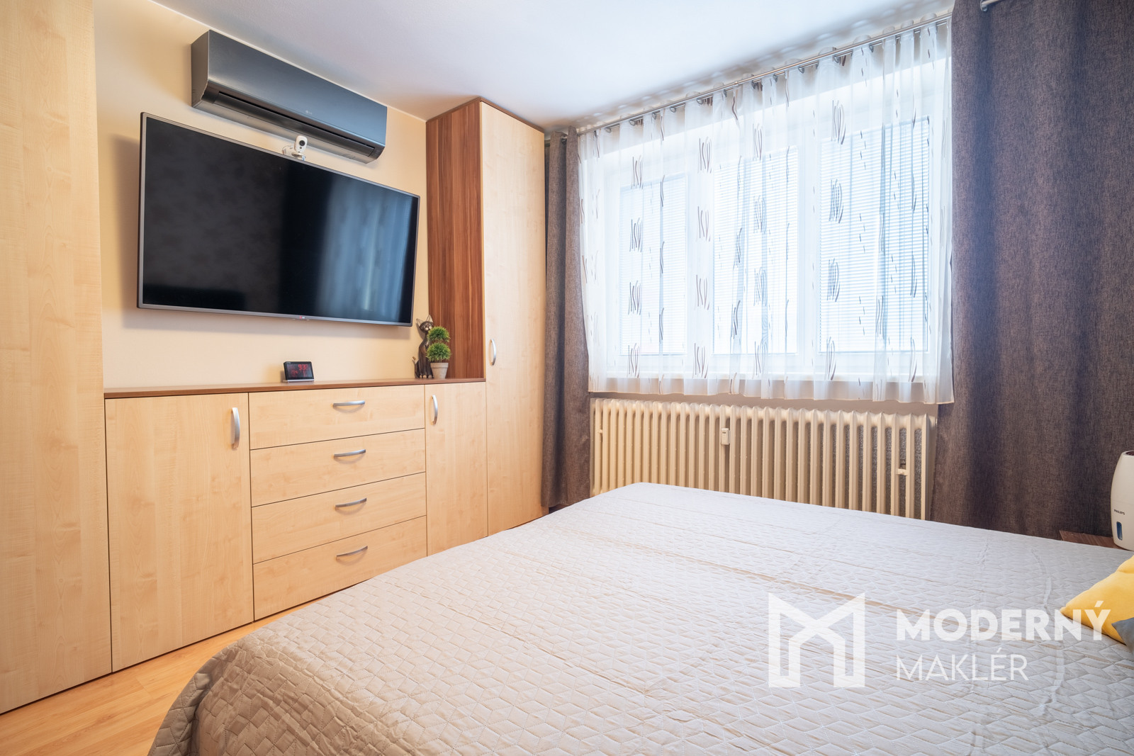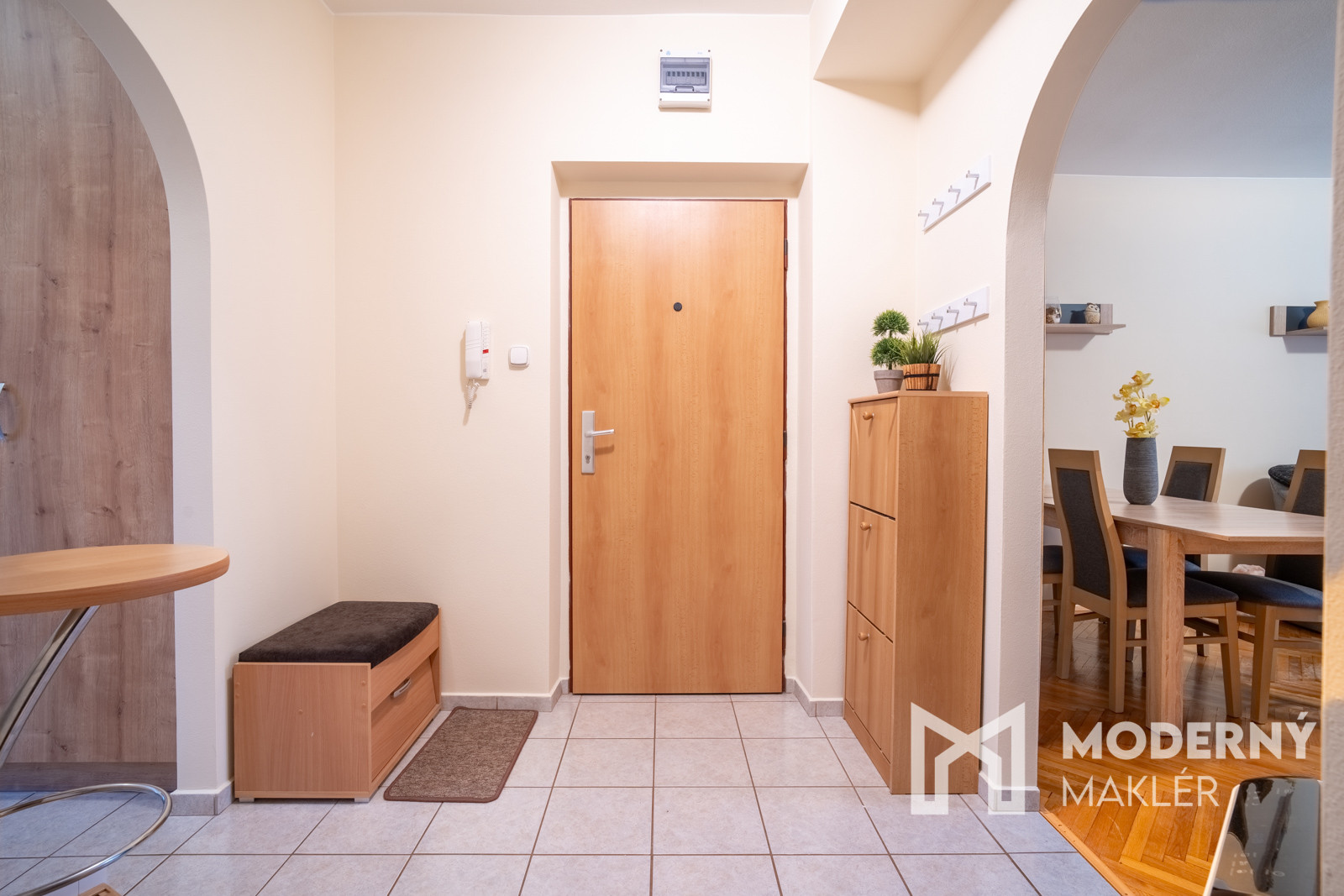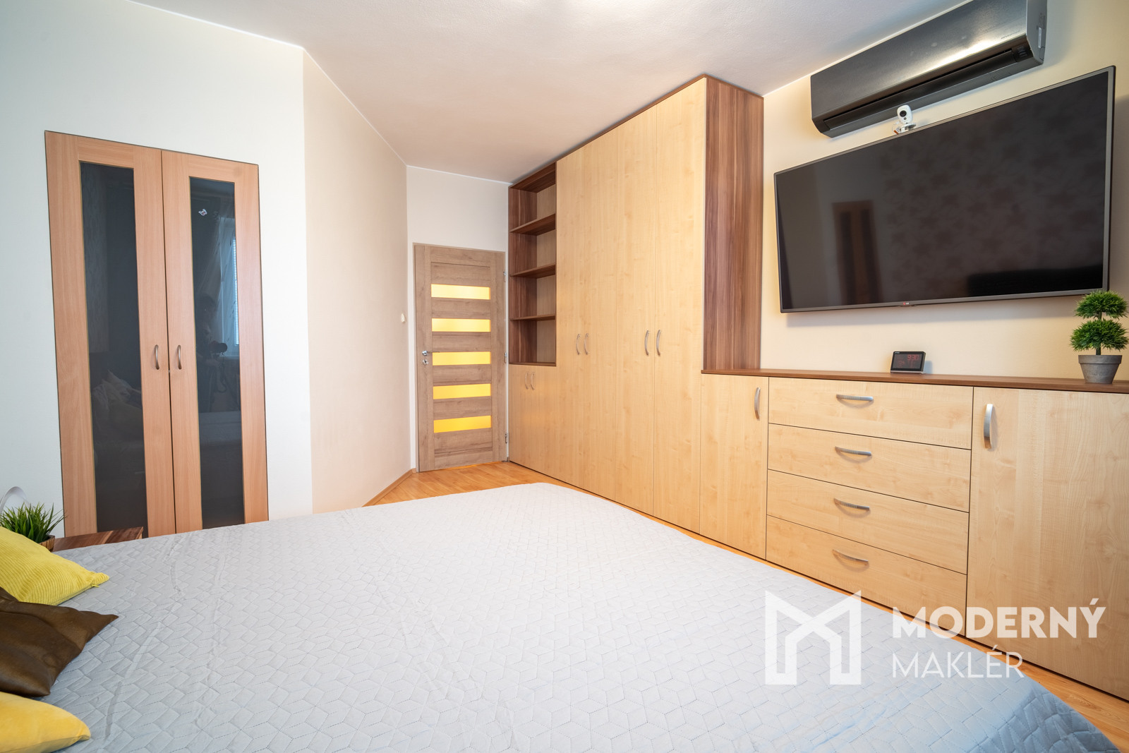 Nehnuteľnosť sa prenajíma kompletne zariadená. Kuchyňa je vybavená kompletnou kuchynskou linkou vrátane všetkých spotrebičov a potrebného vybavenia. Obývacia miestnosť ponúka jedálenský stôl s pohodlnými štyrmi stoličkami, veľkú rohovú sedaciu súpravu doplnenú samostatným kreslom a konferenčným stolíkom, obývačkovou zostavou nábytku, klimatizáciou a televízorom. V kúpeľni nájdete prakticky umiestnenú práčku. Spálňa je zariadená veľkou manželskou posteľou s nočnými stolíkmi a praktickou skriňovou zostavou. Takisto aj v spálni sa nachádza televízor a klimatizácia. Druhá izba slúži ako multifunkčný priestor s jednolôžkovou posteľou, skrinkami a pracovným stolom so stoličkou, ideálnym pre prácu z domu alebo ako hosťovská izba. Všetky šatníky sú vybavené účelným vstavaným úložným priestorom pre maximálne využitie disponibilného miesta.