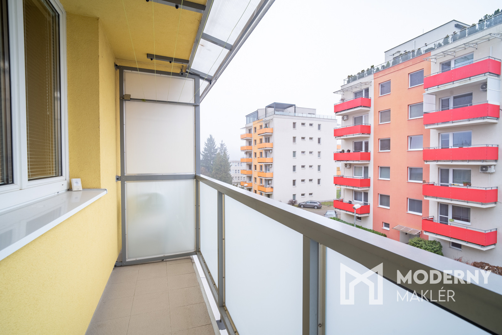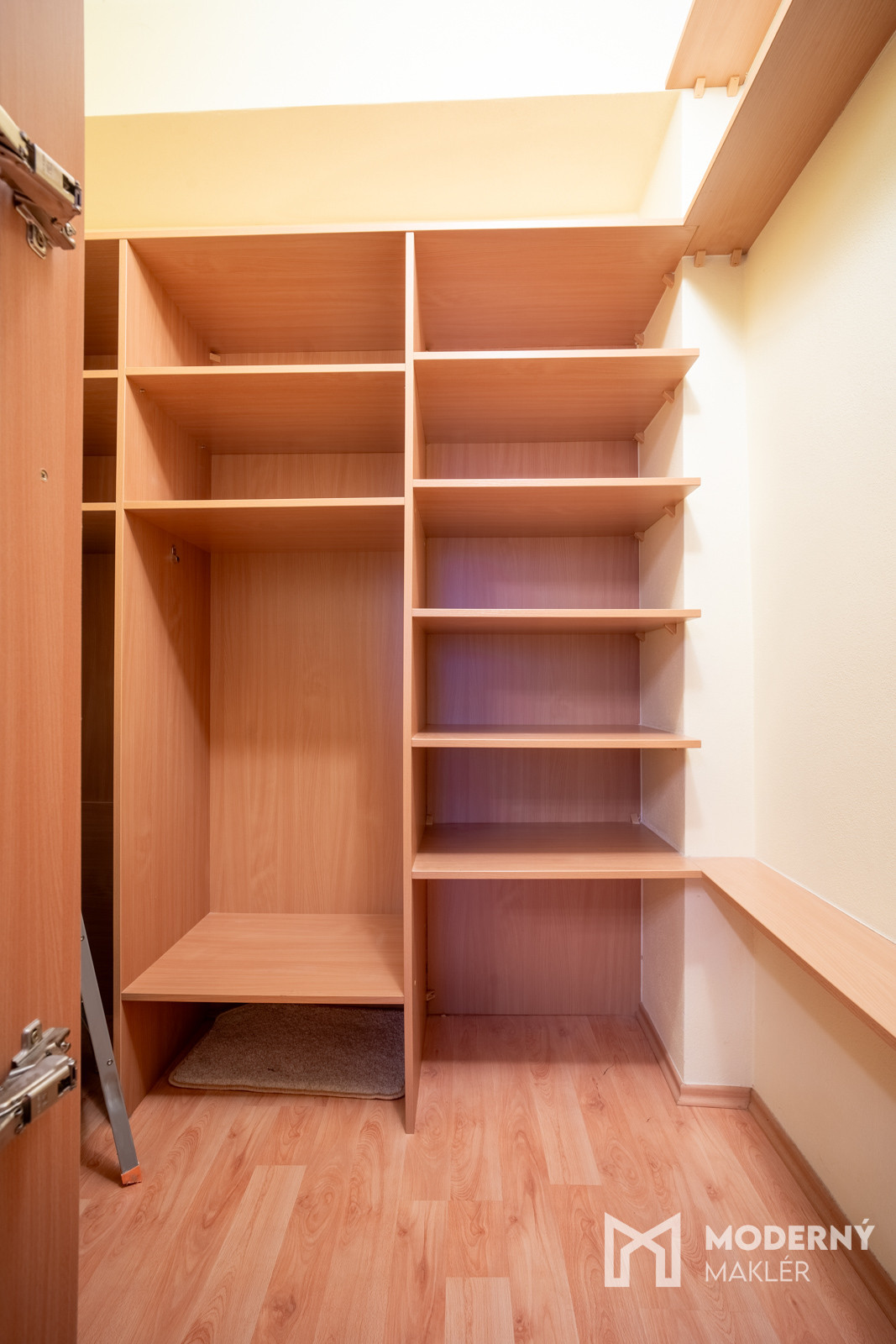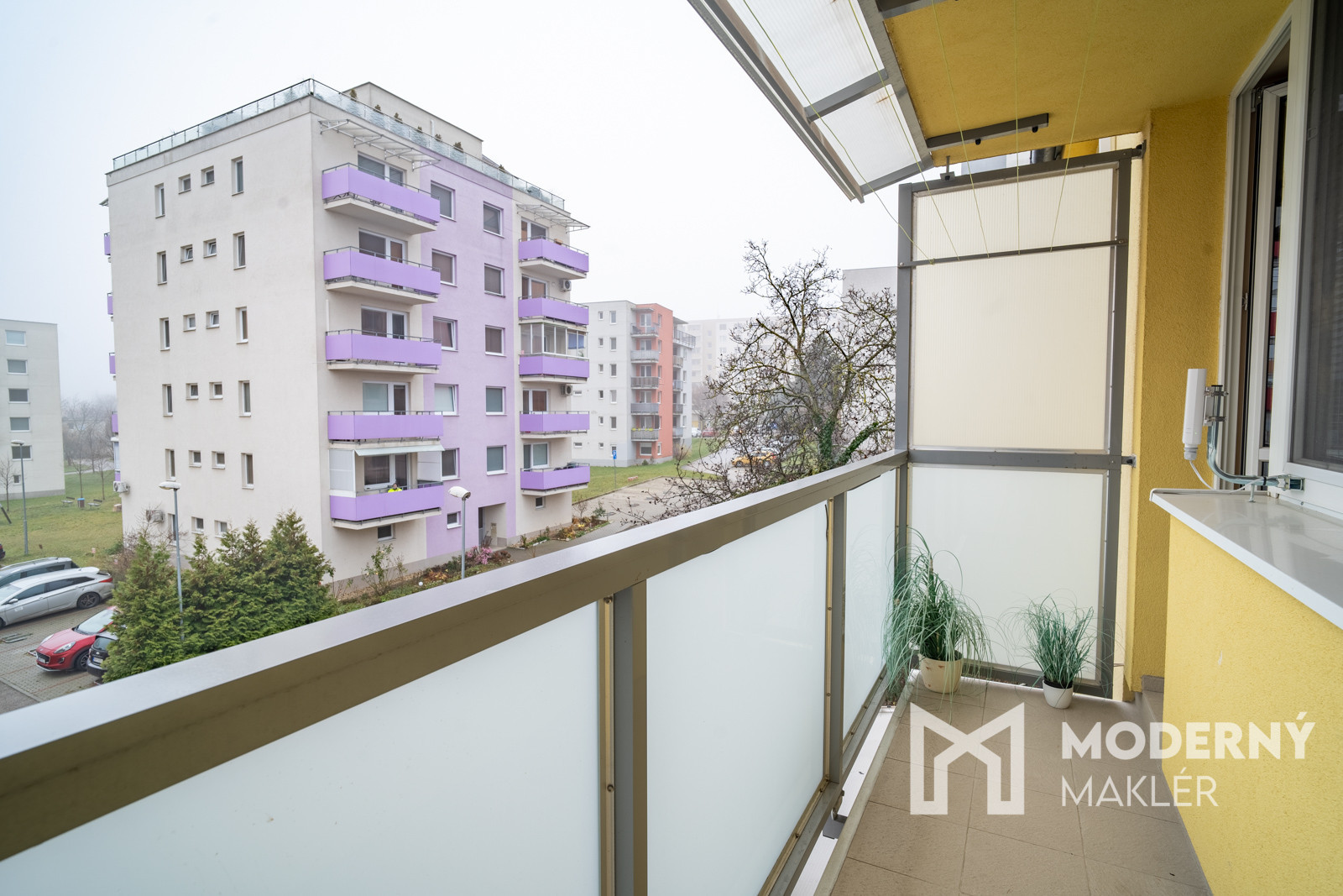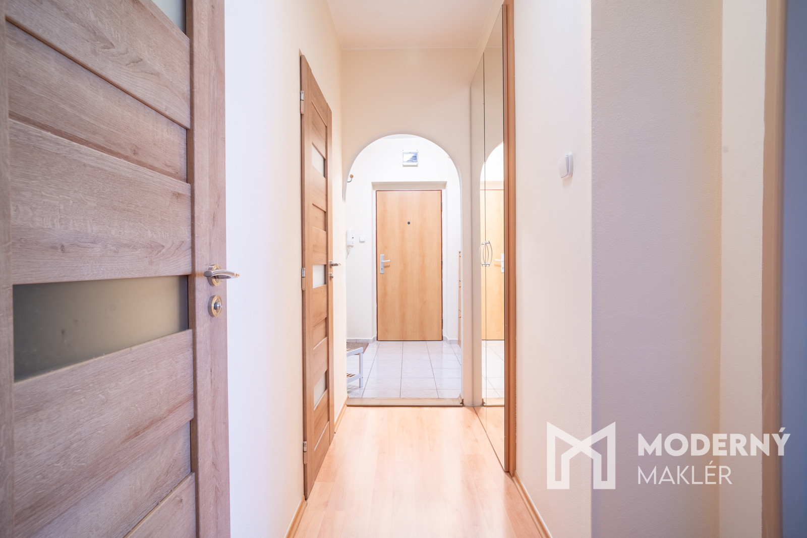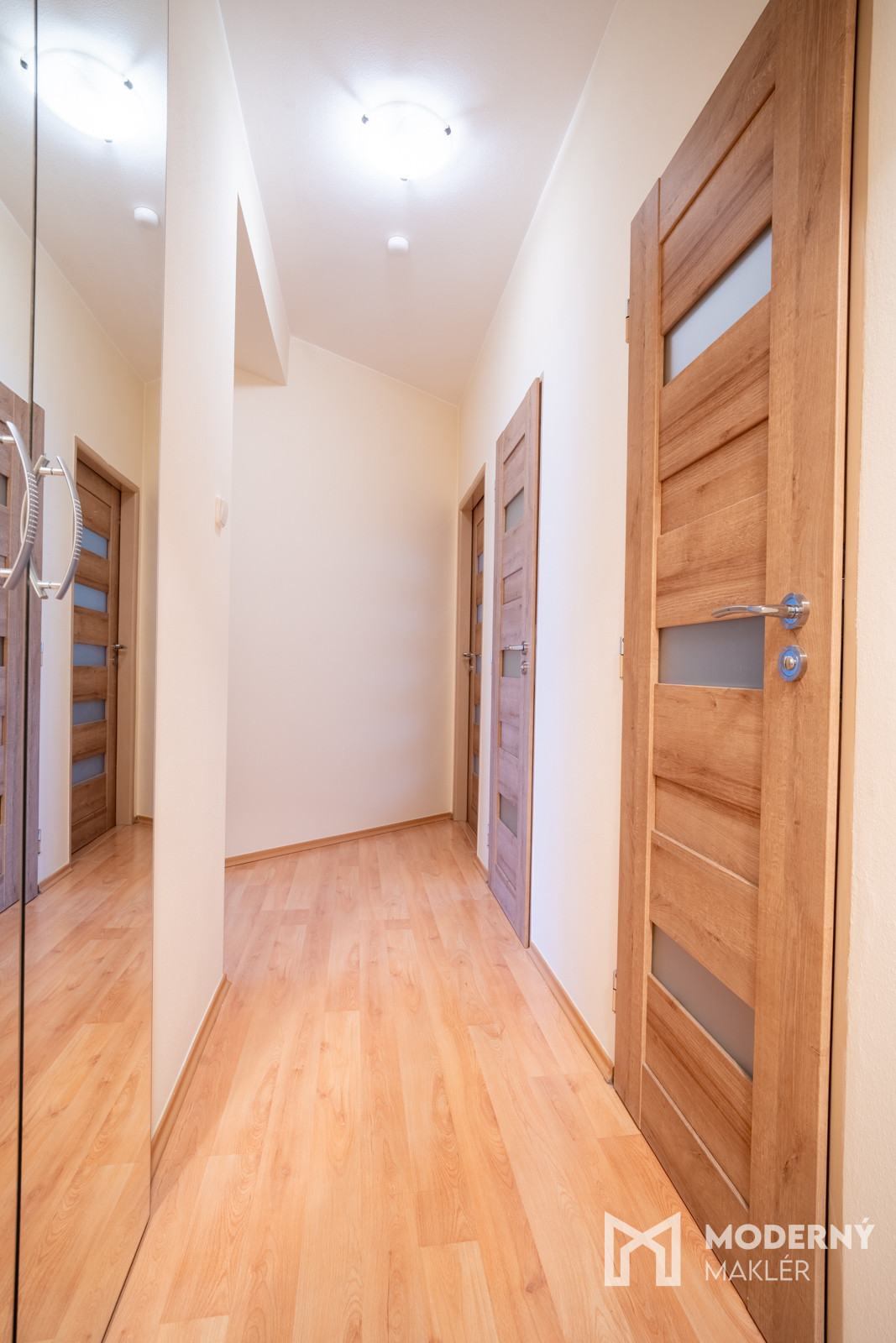 Byt sa skladá zo vstupnej chodby, ktorá tvorí centrálny priestor celého bytu. Vpravo zo vstupnej chodby sa nachádza rohová kuchyňa s menšou krytou loggiou. Vľavo z chodby je situovaná veľká priestranná obývacia miestnosť s veľkým balkónom. Vstupná chodba prirodzene prechádza do ďalšej chodby, z ktorej sa dostanete do kúpeľne vybavennej rohovou vaňou a práčkou, ako aj do samostatného WC. Na konci chodby sa po oboch stranách nachádzajú dve samostatné izby. Každá z izieb disponuje vlastným veľkým priestranným šatníkom a dostatkom úložného priestoru.