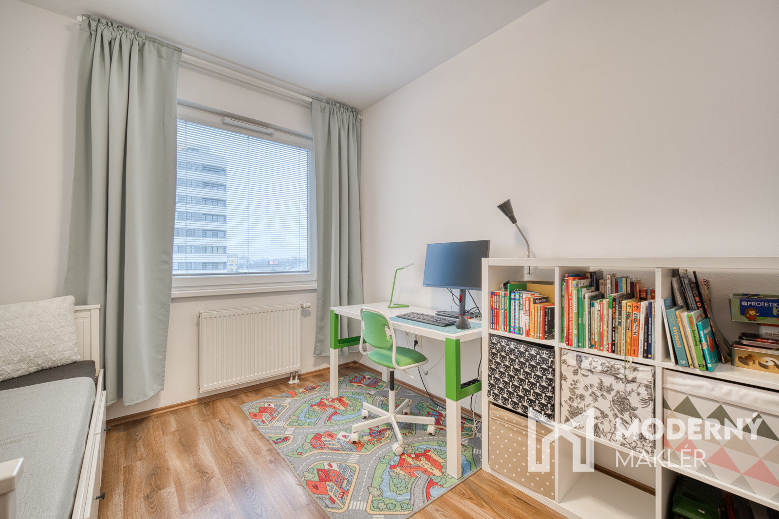 Nehnuteľnosť sa predáva kompletne zariadená a ponúka komfortné bývanie bez potreby ďalších investícií. Kuchyňa je vybavená kvalitnou kuchynskou linkou so vstavanými spotrebičmi, medzi ktoré patrí umývačka riadu, indukčná varná doska, elektrická rúra a digestor, nechýba ani chladnička s mrazničkou. Na kuchyňu nadväzuje jedálenská časť so stolom a stoličkami, ktorá poskytuje dostatok priestoru pre rodinu aj hostí. Obývacia izba je zariadená sedacou súpravou, konferenčným stolíkom, knižnicou, obývačkovou stenou a kreslom, čím vytvára príjemné miesto na oddych. Spálňa disponuje manželskou posteľou, vstavanou skriňou a komodou, ktoré zabezpečujú dostatok úložného priestoru. Pracovňa alebo študentská izba je vybavená posteľou, komodou, písacím stolom a stoličkou, takže je vhodná na prácu aj štúdium. V kúpeľni sa nachádza vaňa, zrkadlová skrinka s umývadlom a práčka. Vstupná chodba je prakticky riešená vešiakovou zostavou. Byt je tak pripravený na okamžité nasťahovanie a pohodlné bývanie.
