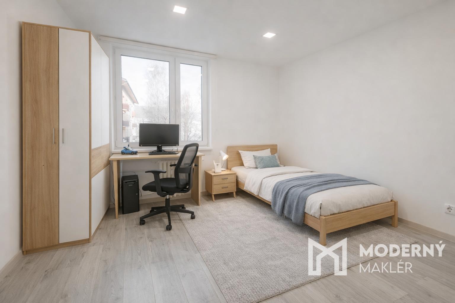 Byt sa skladá zo vstupnej chodby. Nachádza sa tu prakticky riešený priestor s dvoma špajzami, ktoré poskytujú dostatok úložného miesta. K dispozícii je moderná vybavená kúpeľňa so sprchovým kútom a samostatné WC pre väčšie pohodlie. Byt disponuje s novou kuchyňou a samostatnou priestrannou obývačkou s výstupom na zasklený balkón, ktorý rozširuje obytný priestor a poskytuje príjemné miesto na relaxáciu. V bytovej jednotke sa ďalej nachádza spálňa a svetlá detská izba.