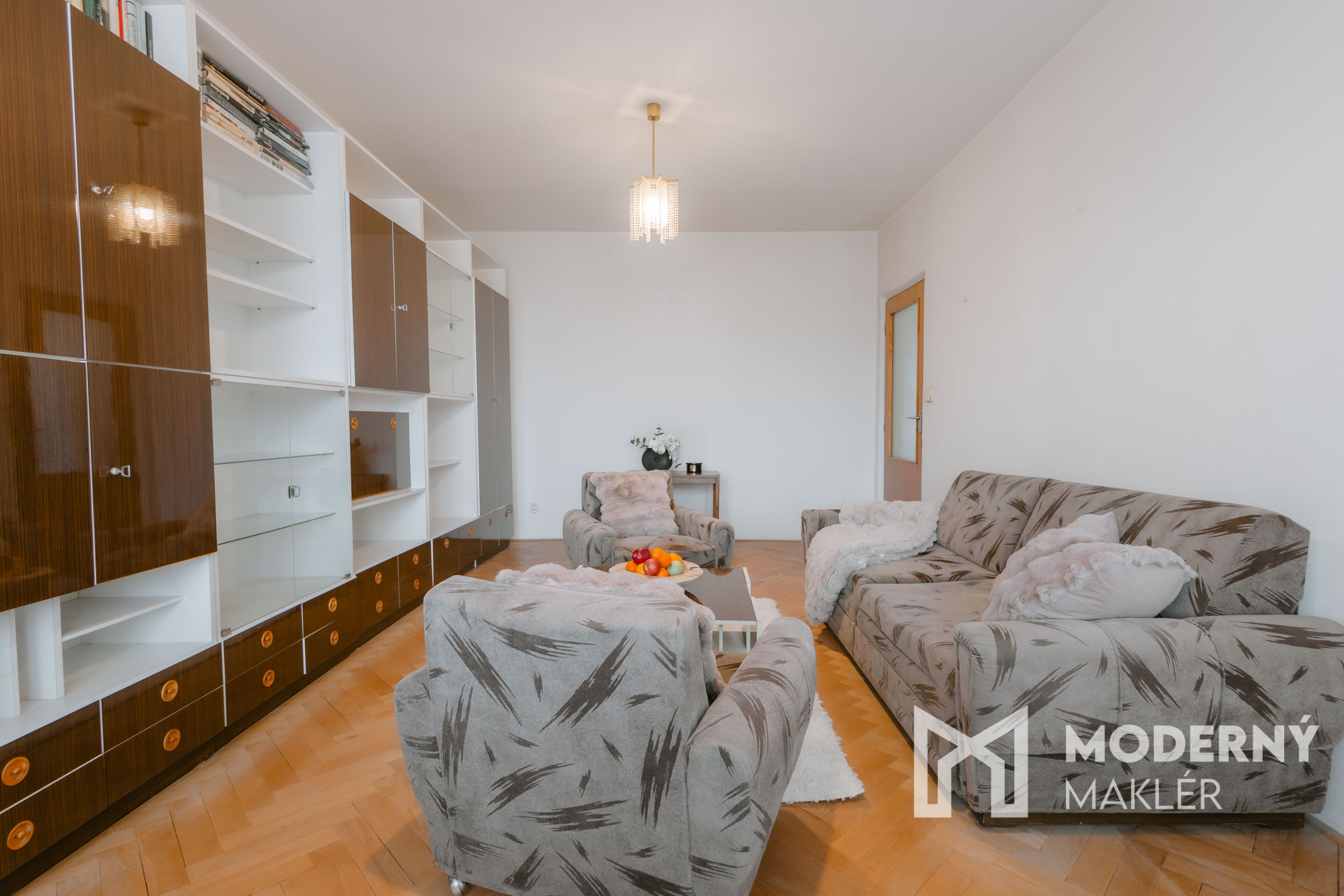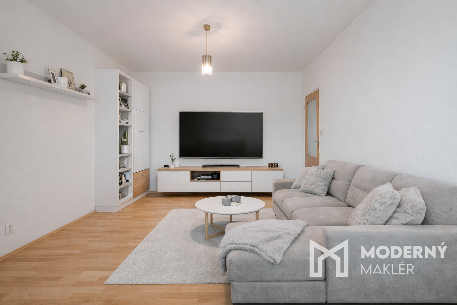 Byt pozostáva z priestrannej vstupnej chodby, ktorá vedie do jednotlivých miestností. Nájdete tu samostatné WC, detskú izbu s výstupom na loggiu, obývaciu izbu takisto s výstupom na loggiu, spálňu, kuchyňu s výstupom na balkón, samostatnú kúpeľňu s vaňou a špajzu, ktorá poskytuje praktický úložný priestor.