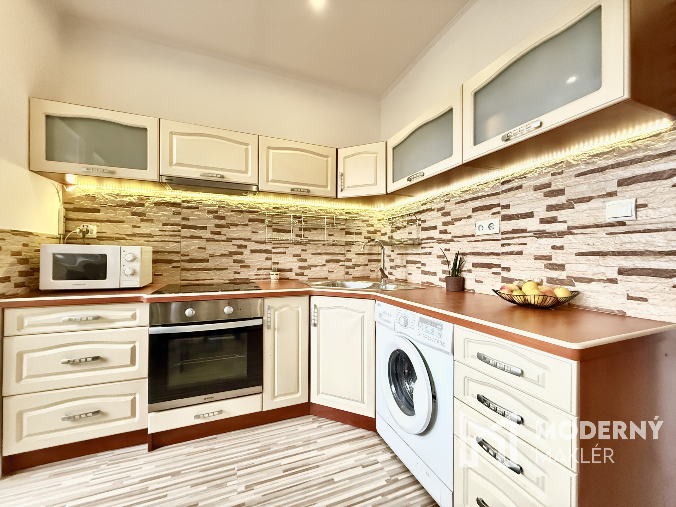 Byt sa prenajíma kompletne zariadený. Vo vstupnej chodbe sa nachádza vstavaná rolldor skriňa. Kuchyňa je kompletne vybavená spotrebičmi (práčka, indukčná varná doska, elektrická rúra, mikrovlnná rúra, chladnička), barovým pultom s dvoma barovými stoličkami. V izbe je gauč, sklápacie lôžko, police a rámy na obrazy na stene, policový regál a skrinka pod televízor. Loggia je vybavená policovým regálom a stolom so stoličkou. Kúpeľňa je zariadená umývadlom so skrinkou, zrkadlom, sprchovacím kútom a policovou skrinkou. Na chodbe pred bytom je možnosť využiť priestranné skrinky pre dodatočný úložný priestor a v suteréne sa nachádza pivnica.