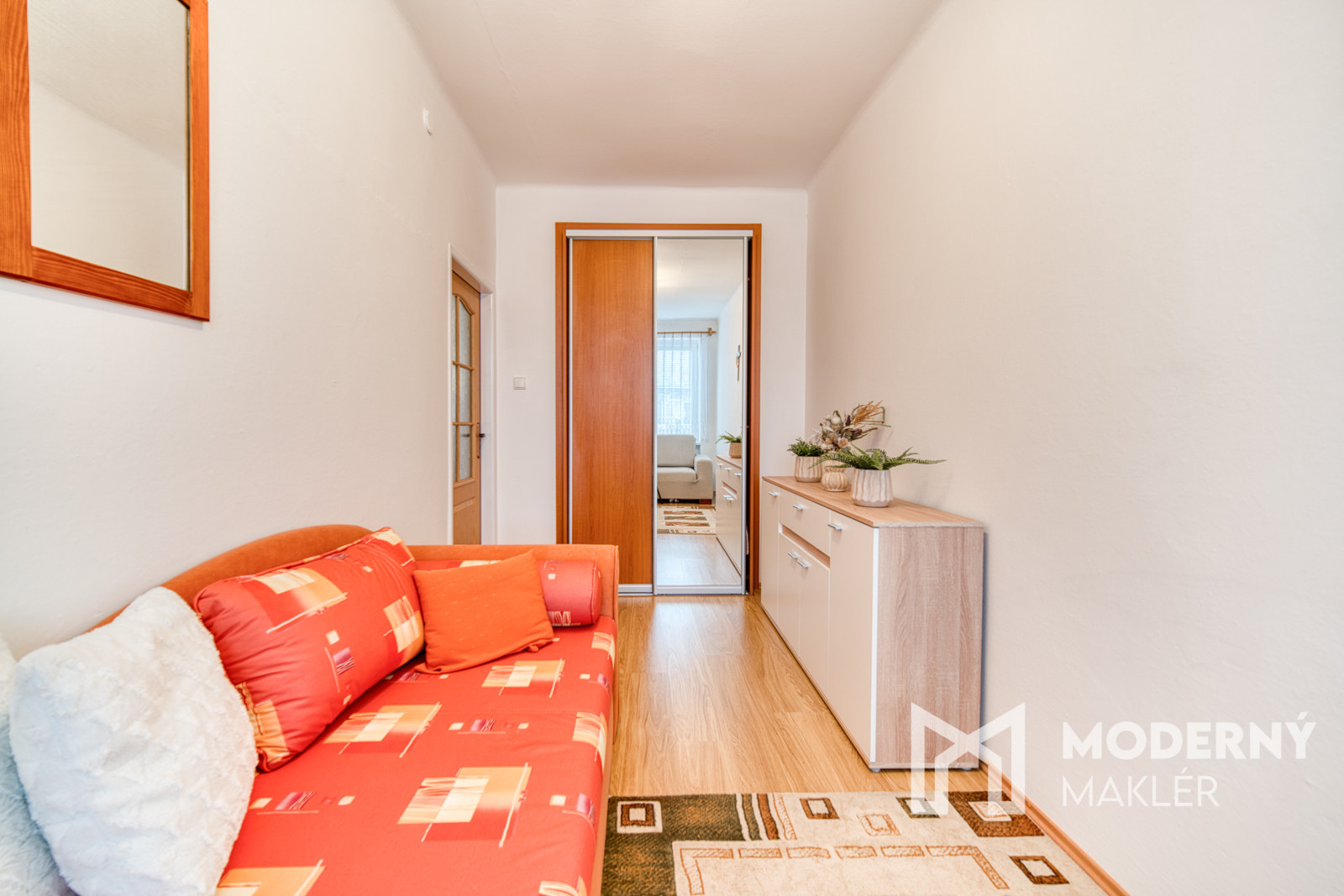 V izbe vás očakáva vstavaná skriňa na mieru, komoda a dve rozkladacie pohovky, ktoré poskytujú priestor pre oddych aj návštevy. Spálňa vás očarí svojou priestrannosťou, dvoma veľkými skriňami, pohodlnou posteľou a nočnými stolíkmi, ktoré dotvárajú harmonickú atmosféru pre kvalitný spánok.