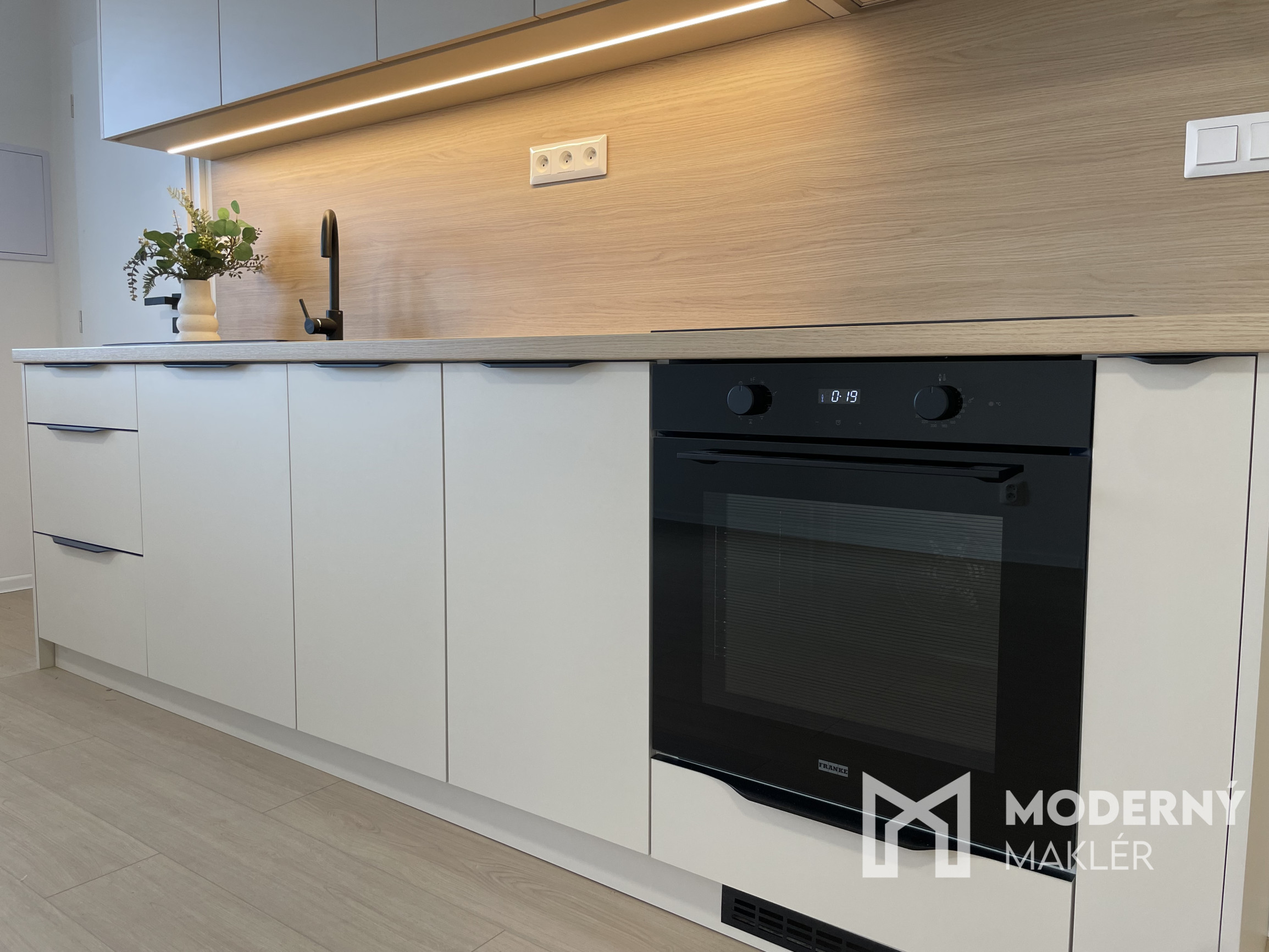 Byt sa prenajíma čiastočne zariadený. Kúpeľňa je vybavená umývadlom, skrinkou a zrkadlom, sprchovým kútom a WC. Kuchyňa je zariadená kuchynskou linkou so spotrebičmi, ktoré zahŕňajú indukčnú varnú dosku, digestor a elektrickú rúru.