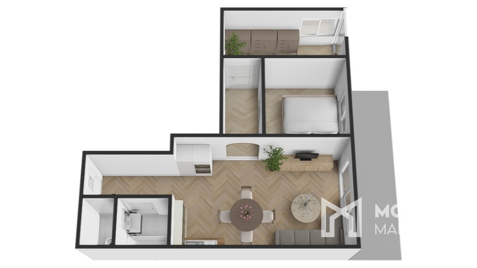 Byt sa nachádza na 2. poschodí a ponúka premyslene rozdelený priestor pre pohodlné bývanie. Vstupom sa dostanete do vstupnej chodby, ktorá spája všetky miestnosti bytu. Nájdete tu samostatnú toaletu pre väčšie pohodlie a kúpeľňu vybavenú vaňou a umývadlom so skrinkou. Hlavnou časťou bytu je priestranná kuchyňa spojená s obývacou časťou, z ktorej máte priamy vstup na terasu - ideálne miesto na relaxáciu či stolovanie vonku. Byt ďalej disponuje chodbou, ktorá vedie do spálne a detskej izby, čím poskytuje súkromie a pokoj pre odpočinok. Výhodou je južná orientácia, ktorá zabezpečuje dostatok prirodzeného svetla počas celého dňa.