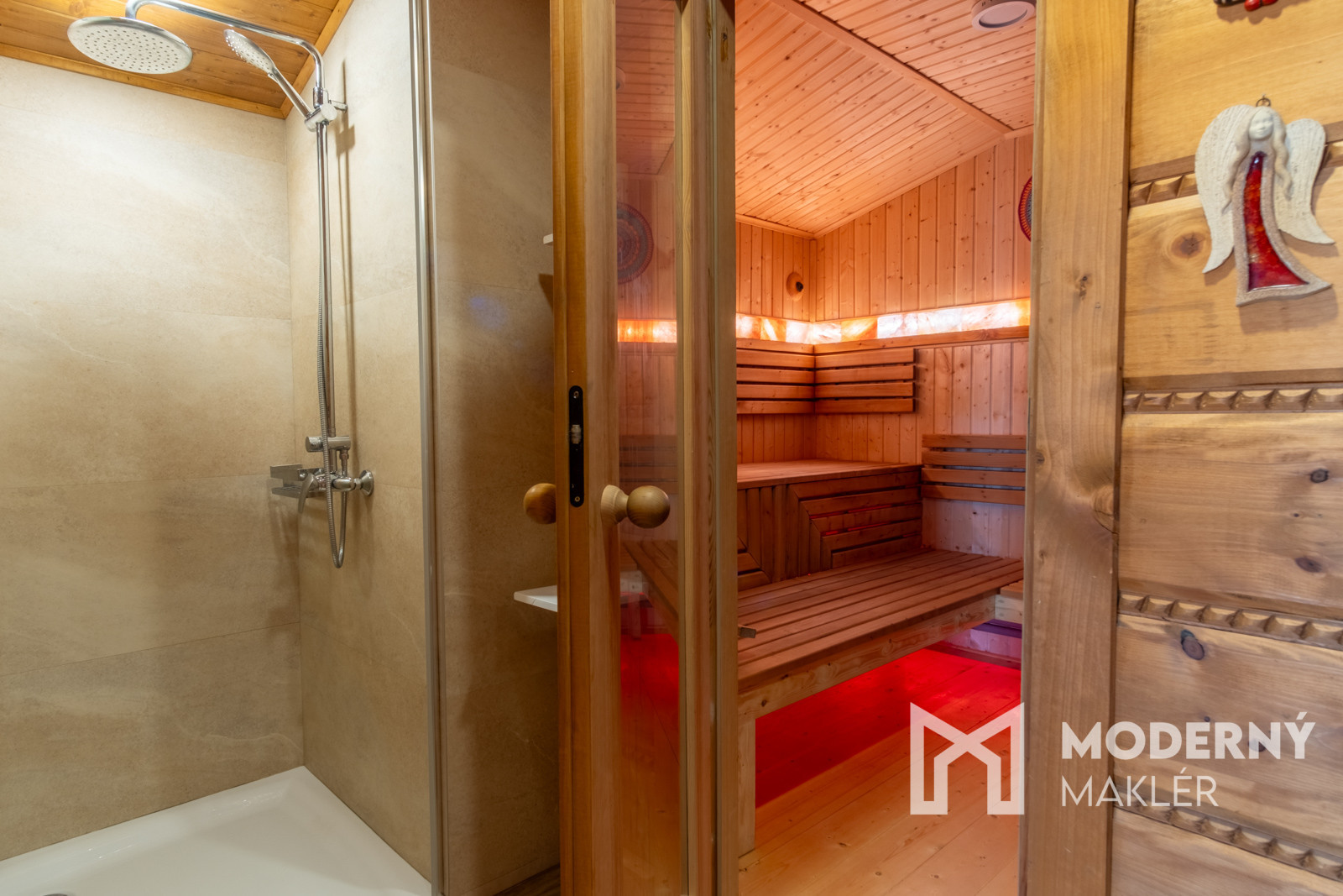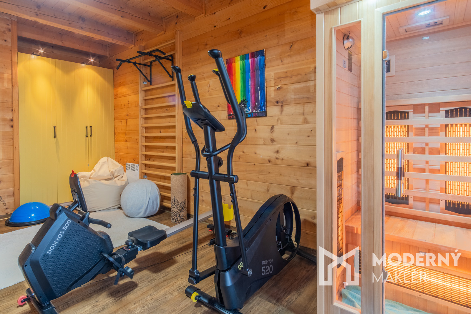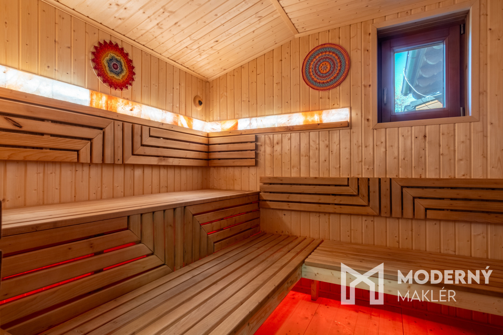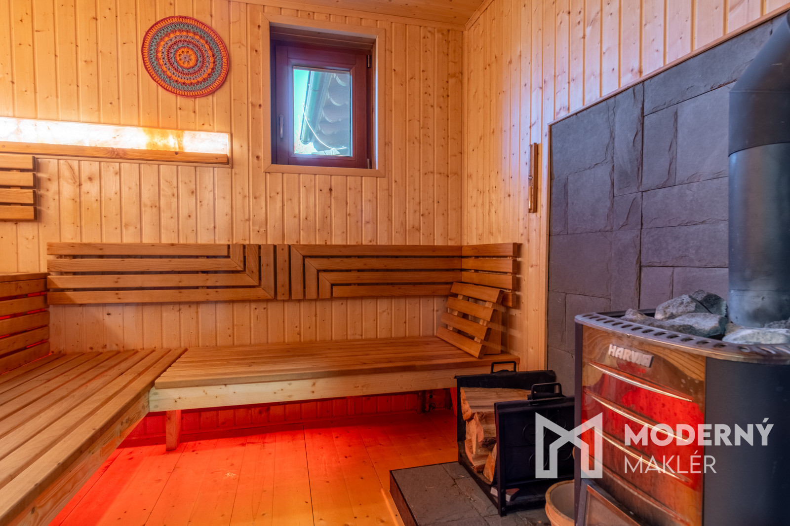 Dom bol navrhnutý s dôrazom na maximálny komfort, funkčnosť a súkromie pre všetkých členov rodiny. Už pri vstupe vás privíta priestranné zádverie, ktoré plynule prechádza do svetlej obývacej izby spojenej s kuchyňou a jedálňou. Tento otvorený priestor pôsobí vzdušne a útulne zároveň a jeho dominantu tvorí krbová pec, ktorá v chladnejších mesiacoch dotvára príjemnú atmosféru domova. Dom disponuje štyrmi spálňami, pričom dve z nich majú vlastnú kúpeľňu. Samostatne sa v dome nachádza aj toaleta pre hostí, špajza a hlavná kúpeľňa s práčovňou. Pre dokonalý oddych a regeneráciu slúžia dve sauny – fínska a infrasauna, zatiaľ čo zimná záhrada poskytuje pokojné útočisko na relax počas celého roka.