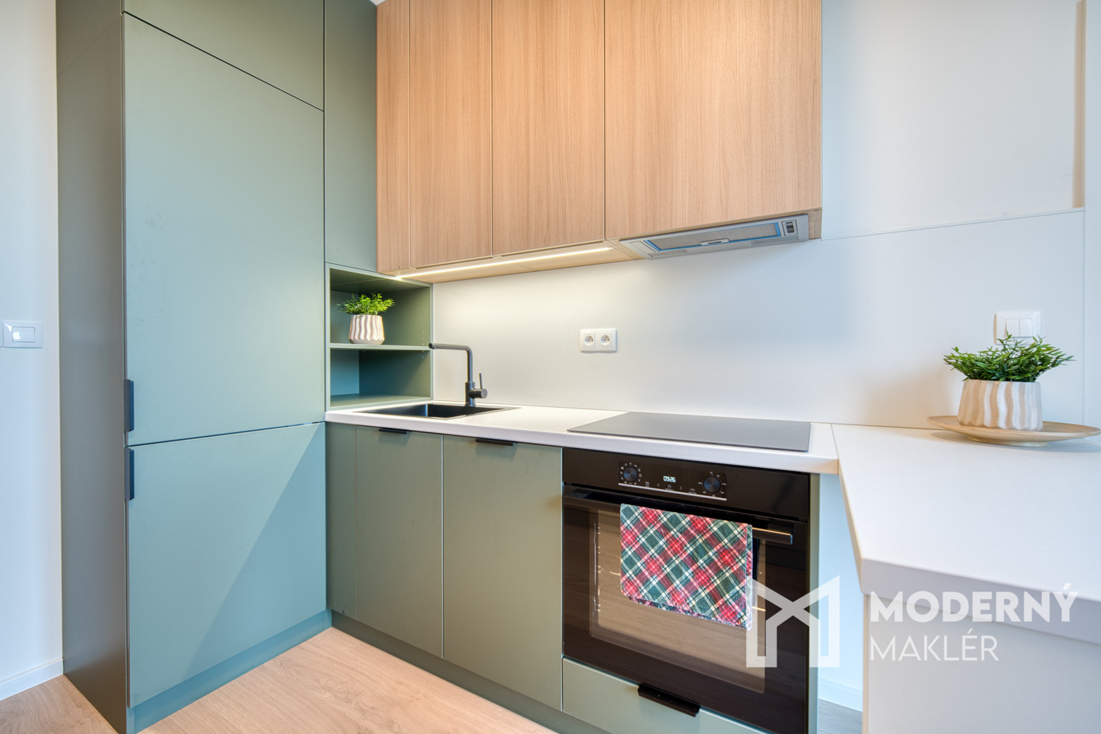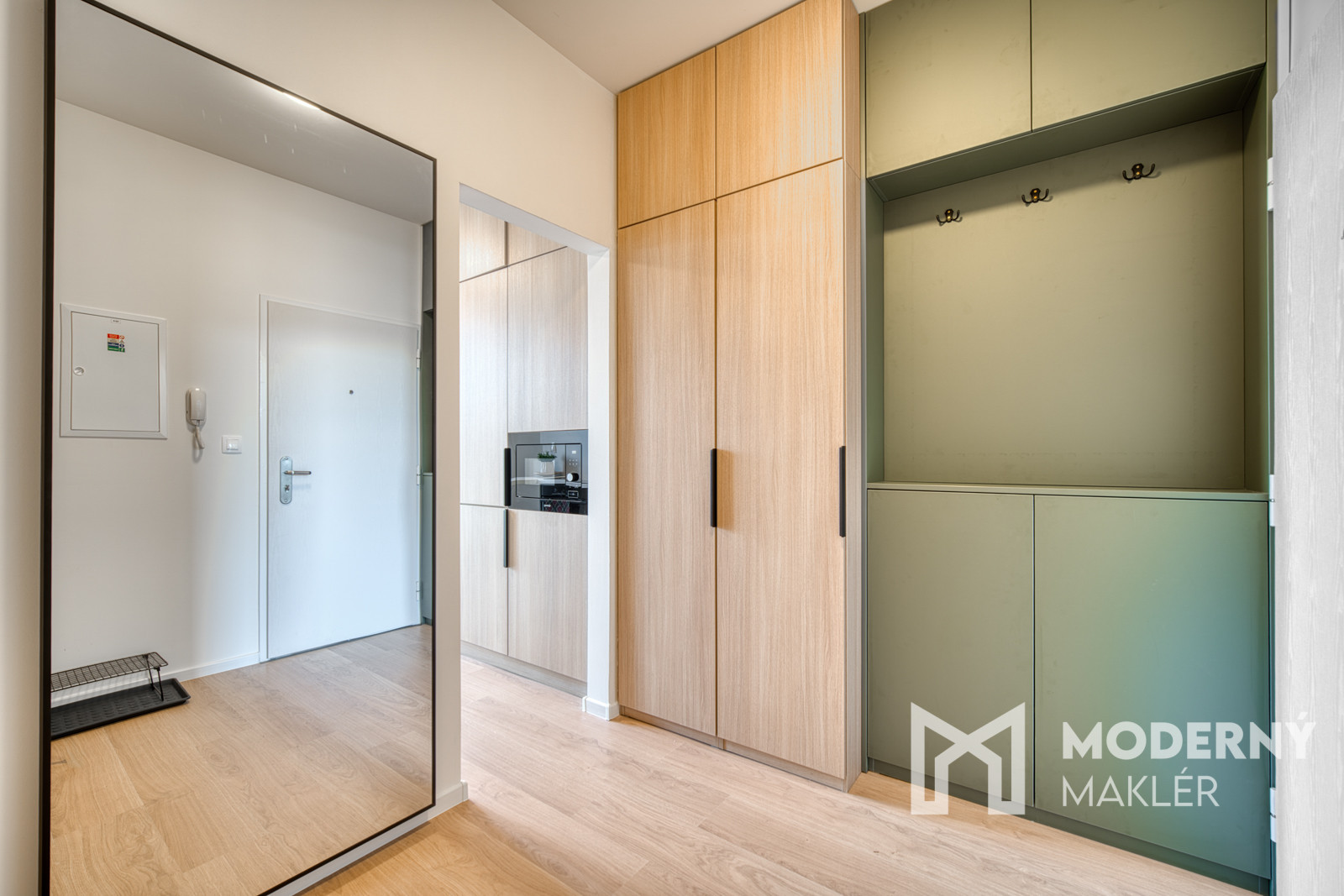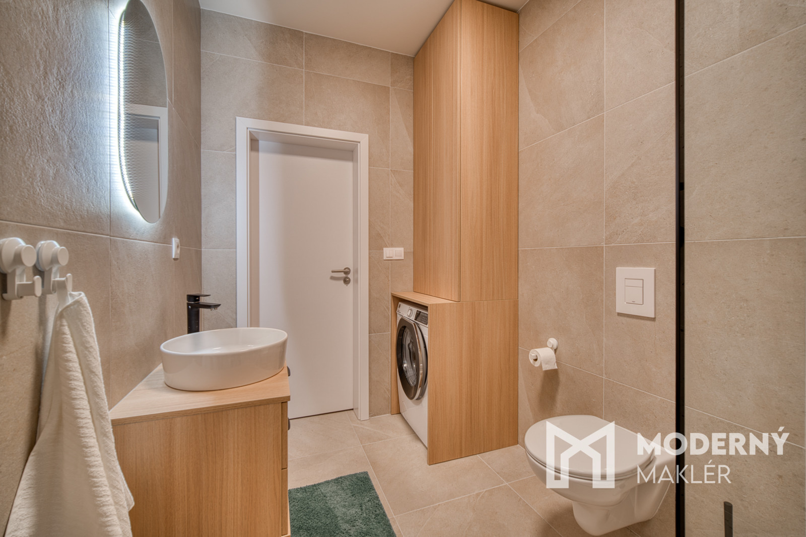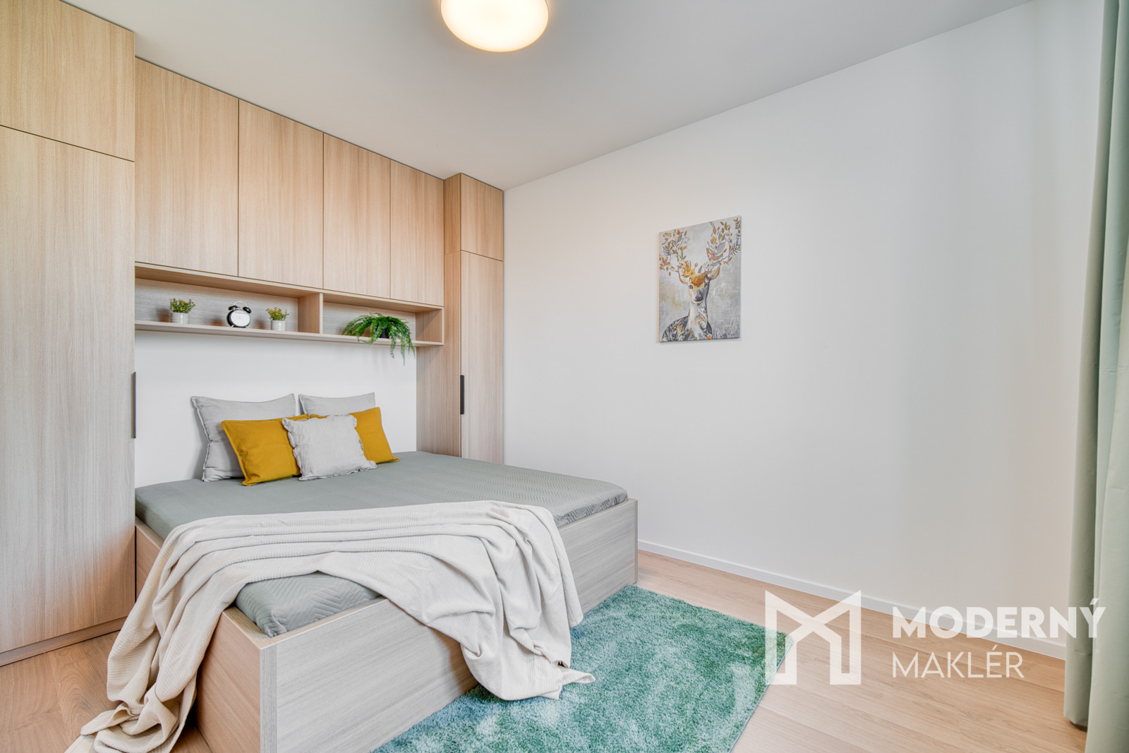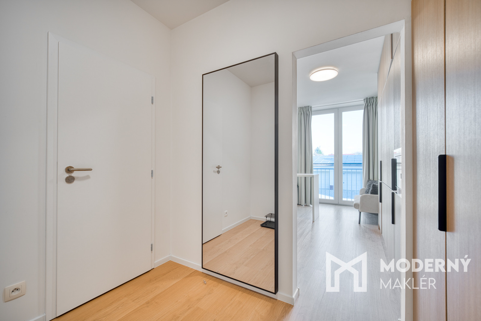 Byt sa prenajíma kompletne zariadený. Na chodbe sa nachádza vstavaný nábytok na mieru a zrkadlo. Kúpeľňa je vybavená nábytkom na mieru, práčkou, skrinkou s umývadlom a zrkadlom. Kuchyňa je zariadená kuchynskou linkou so spotrebičmi vrátane chladničky s mrazničkou, sklo-keramickej varnej dosky, elektrickej rúry, umývačky riadu, mikrovlnnej rúry a digestora, doplnená barovým pultíkom, taktiež sa tu nachádza pohovka. Spálňa je zariadená manželskou posteľou a úložným systémom na mieru. Byt je vybavený optickým internetom.