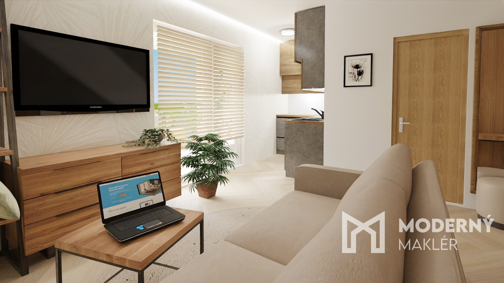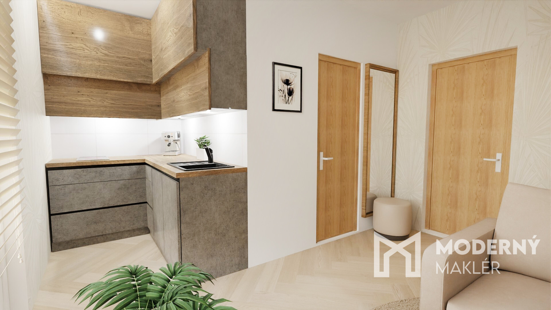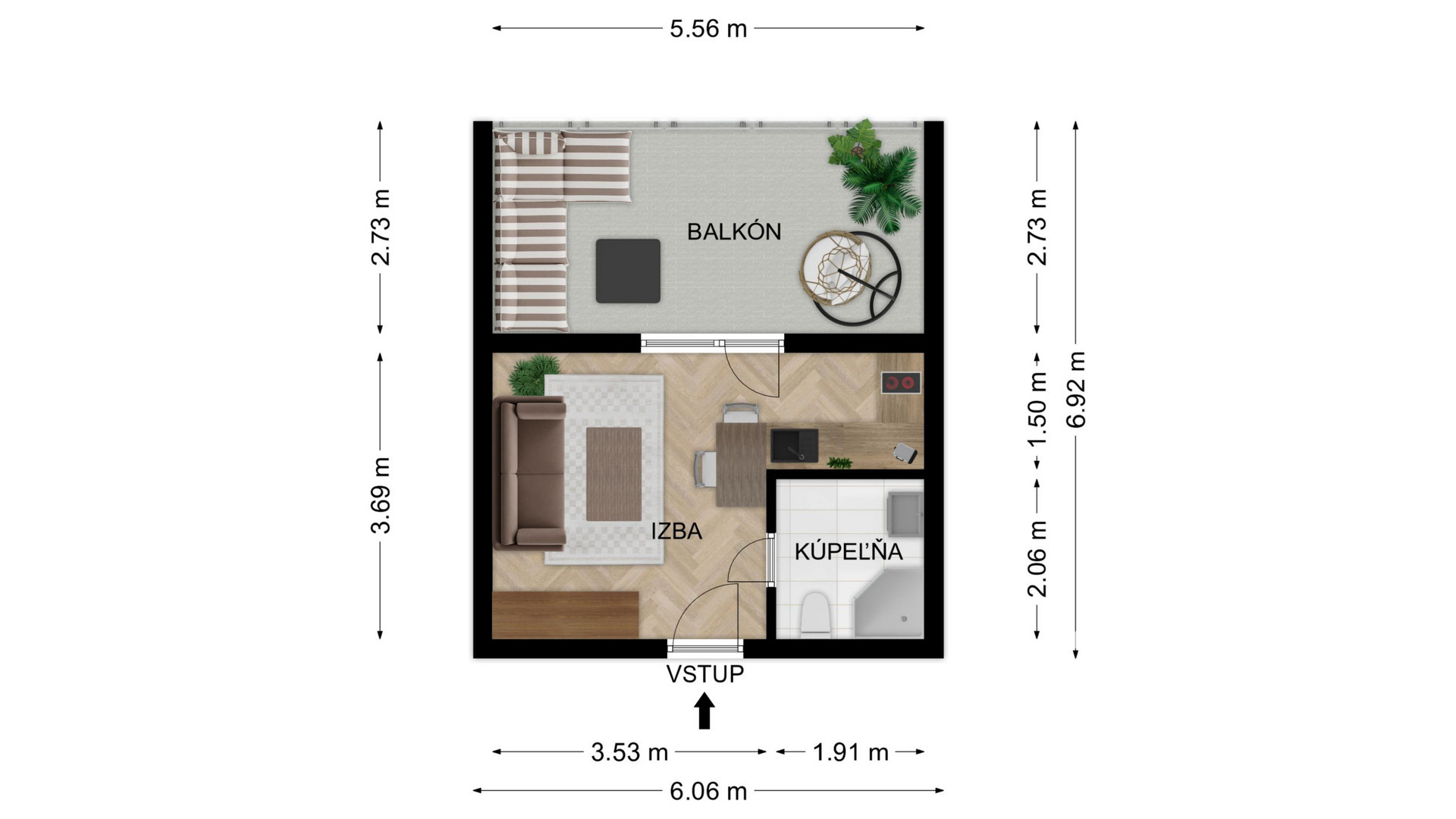 Do bytu vchádzame cez vstupnú predsieň, po ľavej strane sa nachádza priestor na kuchyňu, oproti vstupu nájdeme priestrannú obývaciu miestnosť a po pravej strane sa nachádza kúpeľňa s WC a samostatná spálňa.