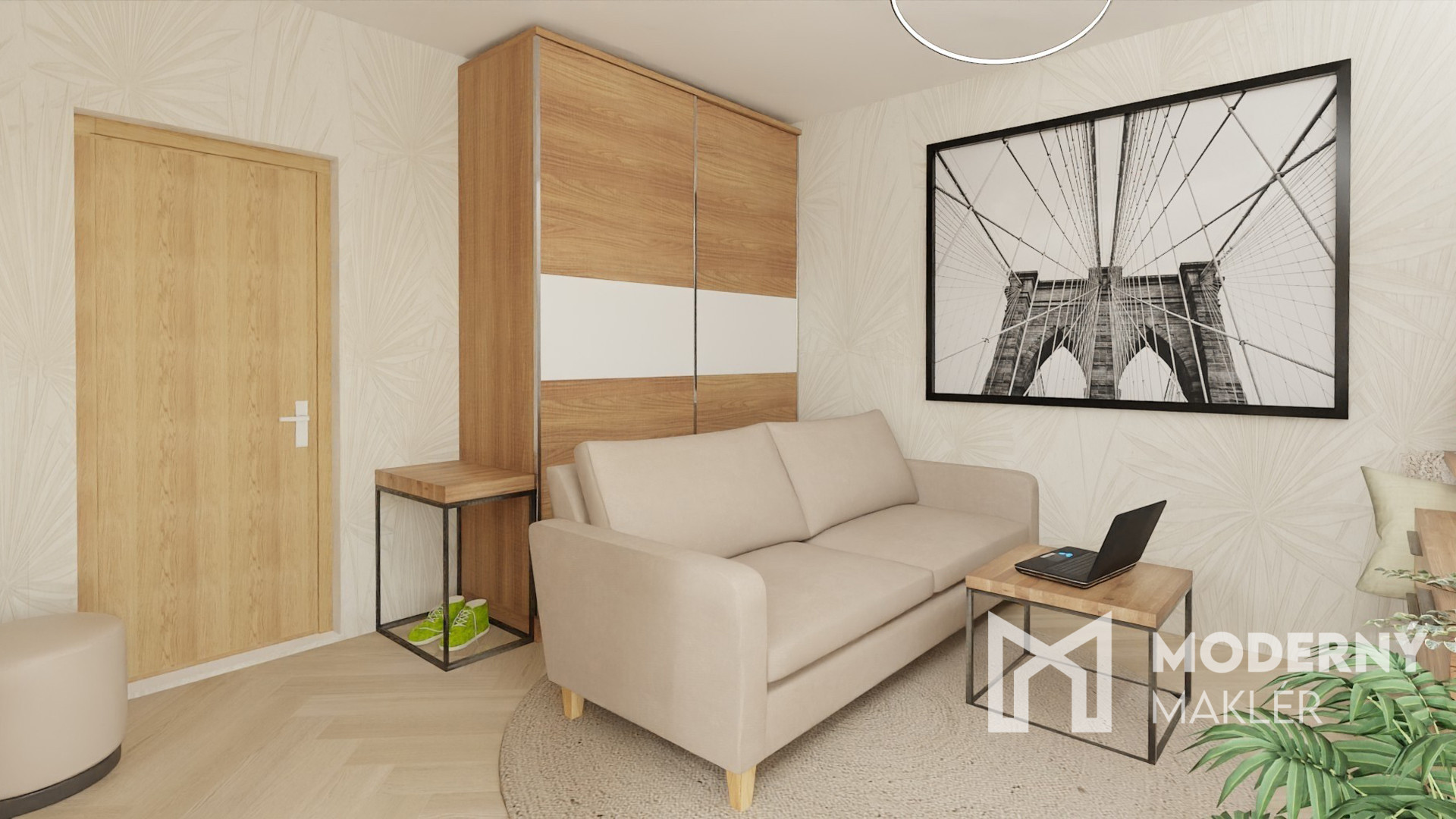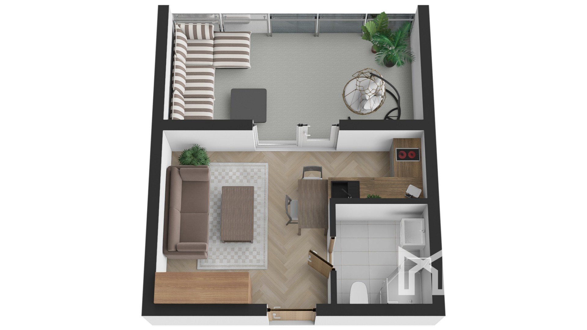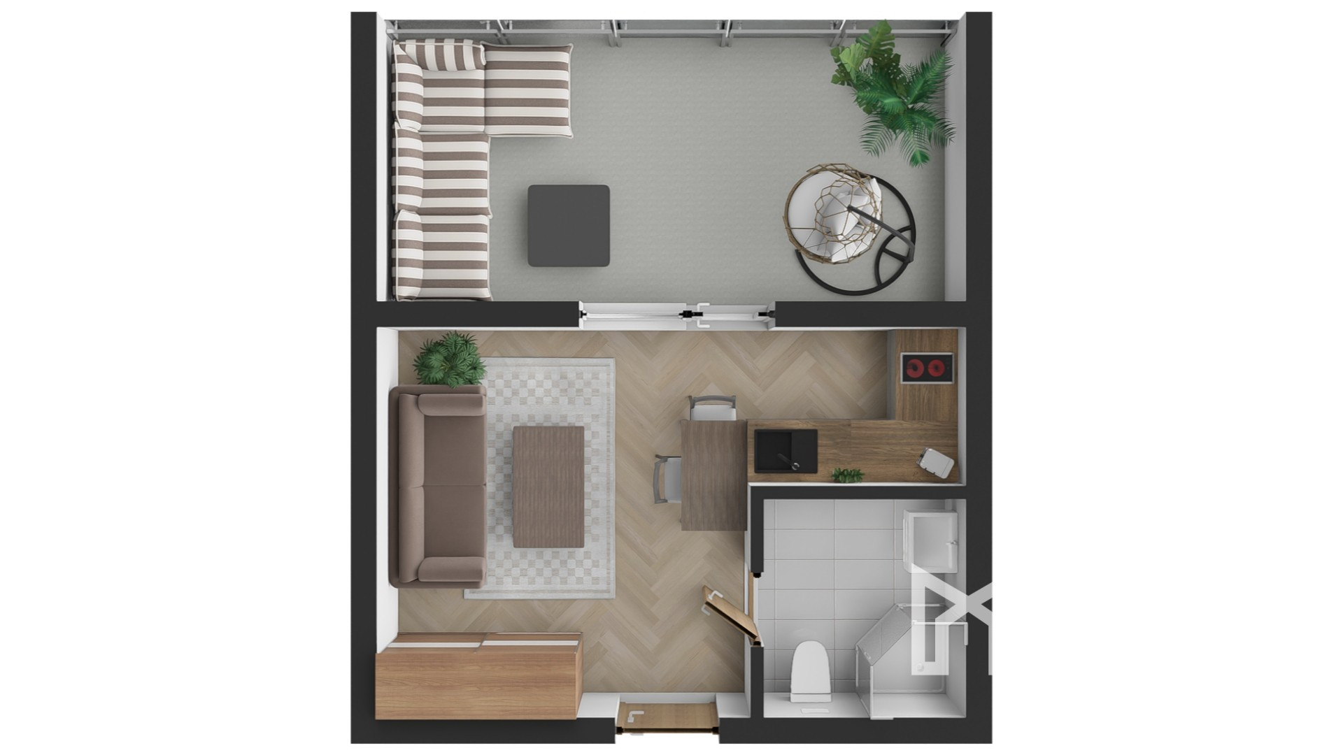 Do bytu vchádzame cez vstupnú predsieň, po ľavej strane sa nachádza priestor na kuchyňu, oproti vstupu nájdeme priestrannú obývaciu miestnosť a po pravej strane sa nachádza kúpeľňa s WC a samostatná spálňa.