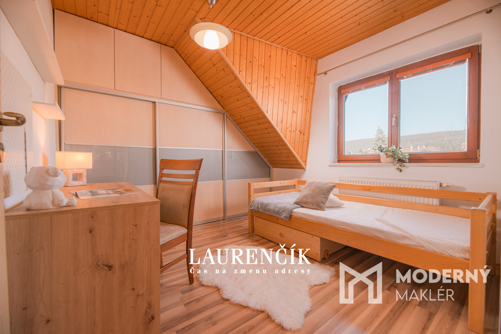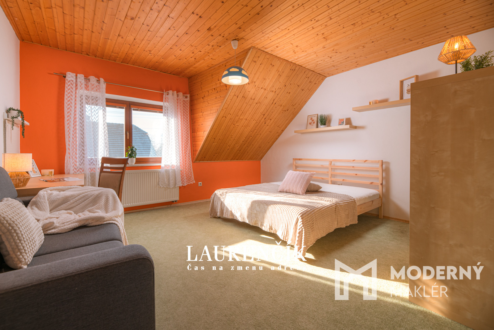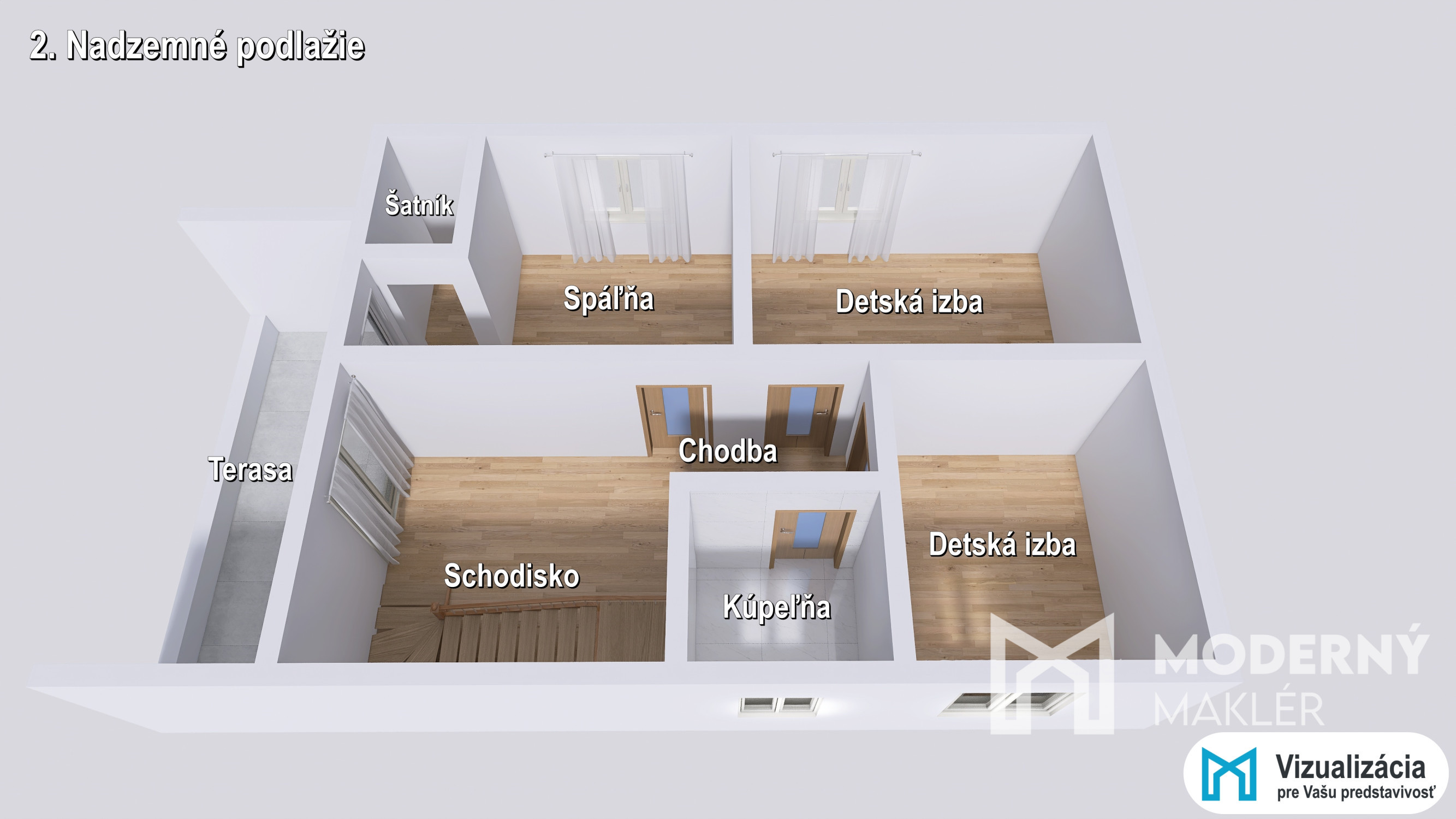 Druhé podlažie tvorí nočná časť s tromi samostatnými izbami a kúpeľňou, ktorá zvyšuje komfort rodinného bývania. Vďaka dobre navrhnutej dispozícii a priestranným miestnostiam dom pôsobí vzdušne, prakticky a umožňuje pohodlné každodenné fungovanie celej rodiny.
