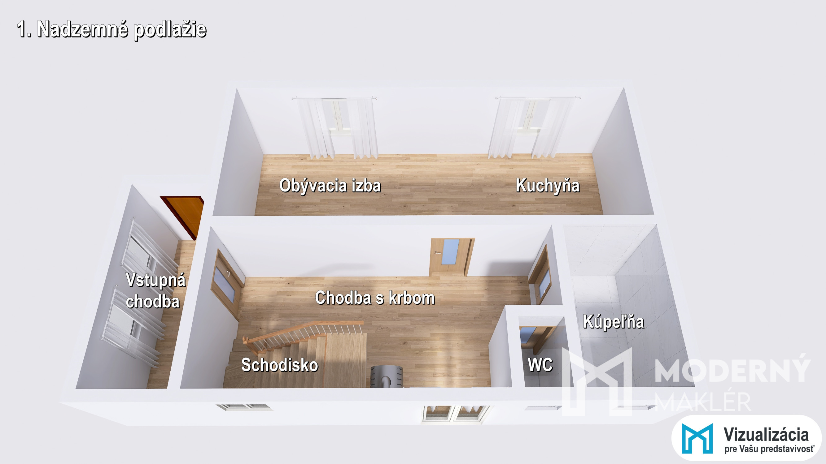 Dom pozostáva z prakticky riešených podlaží, ktoré ponúkajú komfortné rodinné bývanie. Na prvom podlaží sa nachádza vstupná chodba, obývacia izba spojená s kuchyňou a jedálenskou časťou, kúpeľňa a samostatné WC.