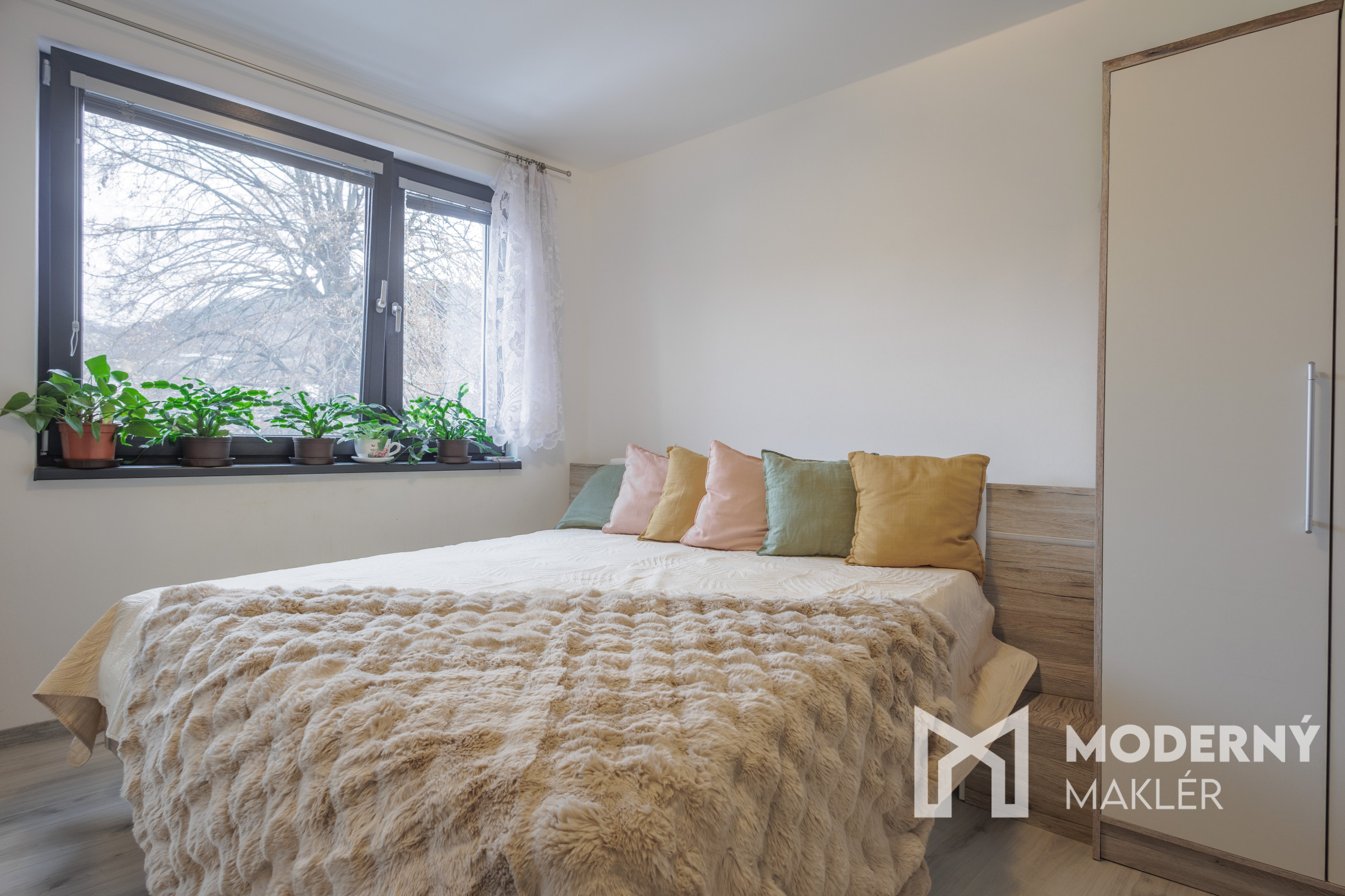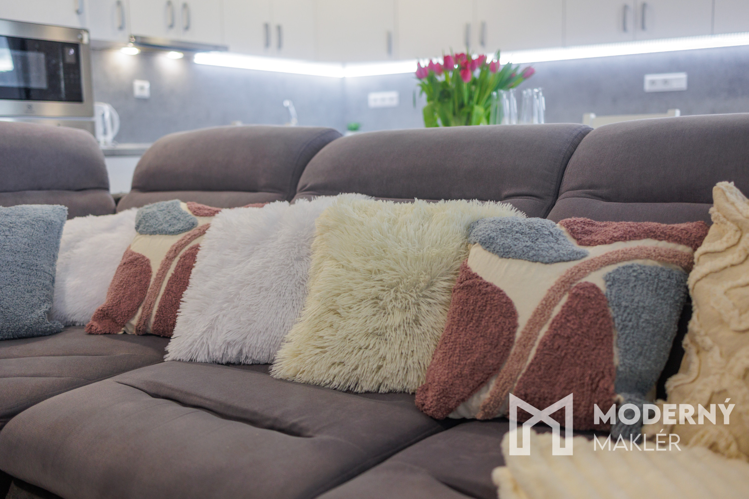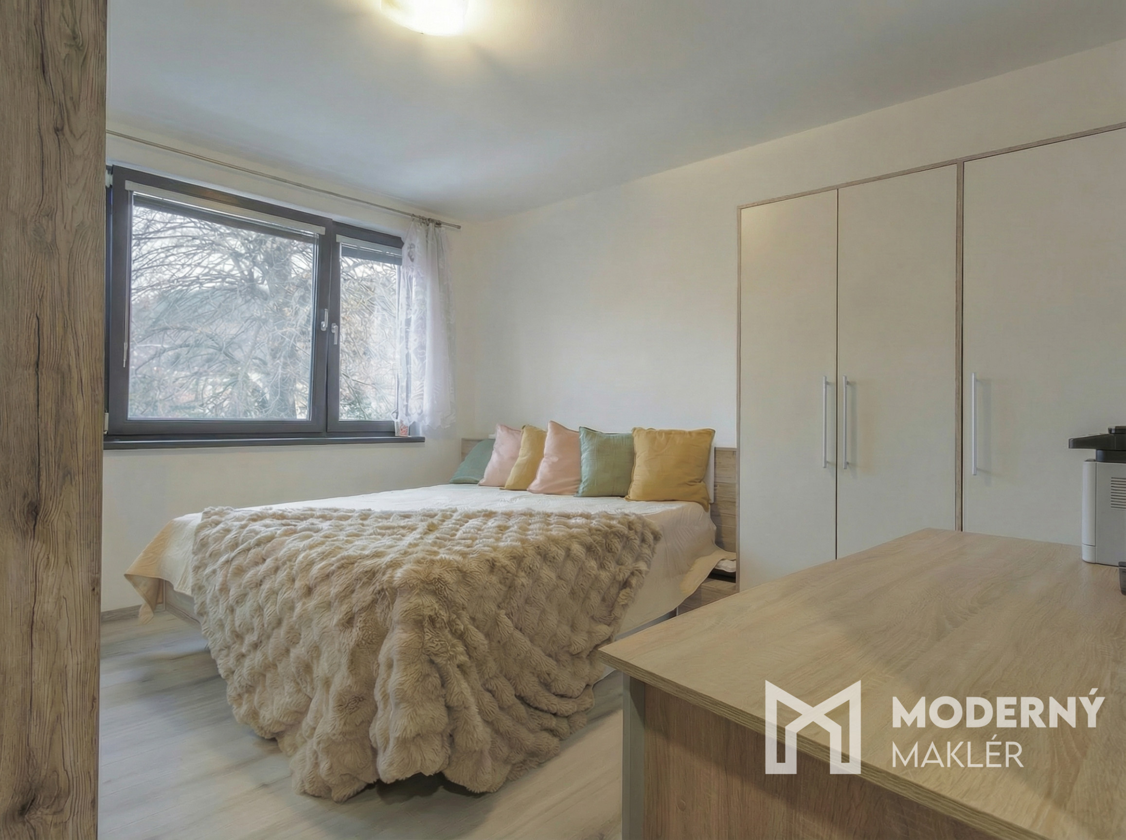 Dispozícia bytu je premyslená a veľmi praktická. Po vstupe do bytu sa nachádza chodba s dostatkom priestoru na úložné riešenia. Byt disponuje samostatnou toaletou, čo výrazne zvyšuje komfort bývania. K dispozícii je priestranná kúpeľňa s vaňou a druhou toaletou. Dve samostatné, nepriechodné izby poskytujú súkromie a flexibilitu využitia – či už ako spálňa, detská izba alebo pracovňa. Dominantou bytu je veľká obývacia izba prepojená s kuchyňou, z ktorej je priamy výstup na veľkorysú loggiu, ideálnu na relax alebo posedenie. Praktickým bonusom je aj priestranná špajza, ktorá ponúka dostatok úložného priestoru. K bytu patrí aj pivnica.