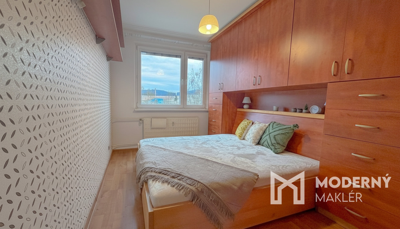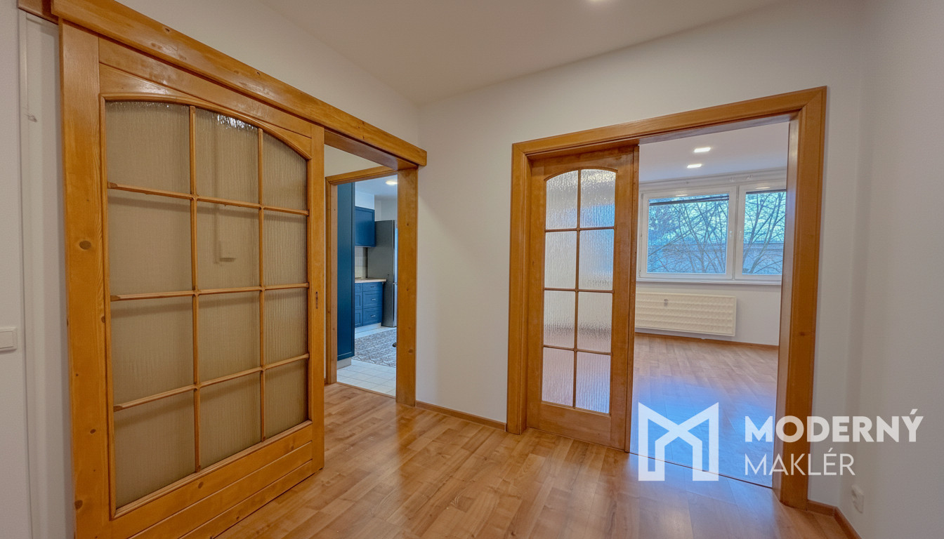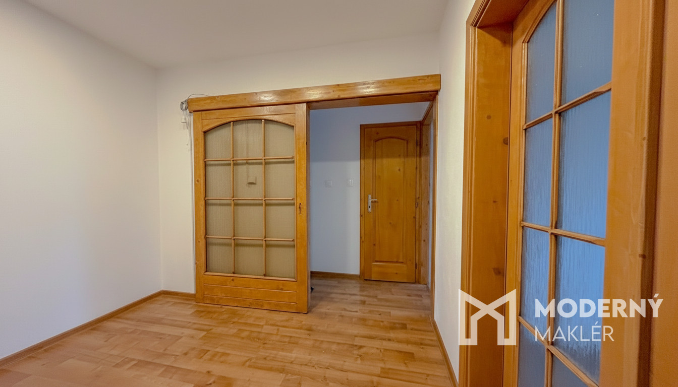 Nehnuteľnosť sa skladá z priestrannej vstupnej chodby, ktorá zabezpečuje príjemný vstup do celého bytu. Nájdete tu samostatnú kuchyňu s presklennou loggiou, ktorá ponúka dodatočný priestor a možnosť vonkajšieho posedenia. Byt disponuje samostatným WC pre pohodlie obyvateľov a kúpeľňou so sprchovým kútom. V byte sa nachádza hlavná spálňa, detská izba a obývačka.
