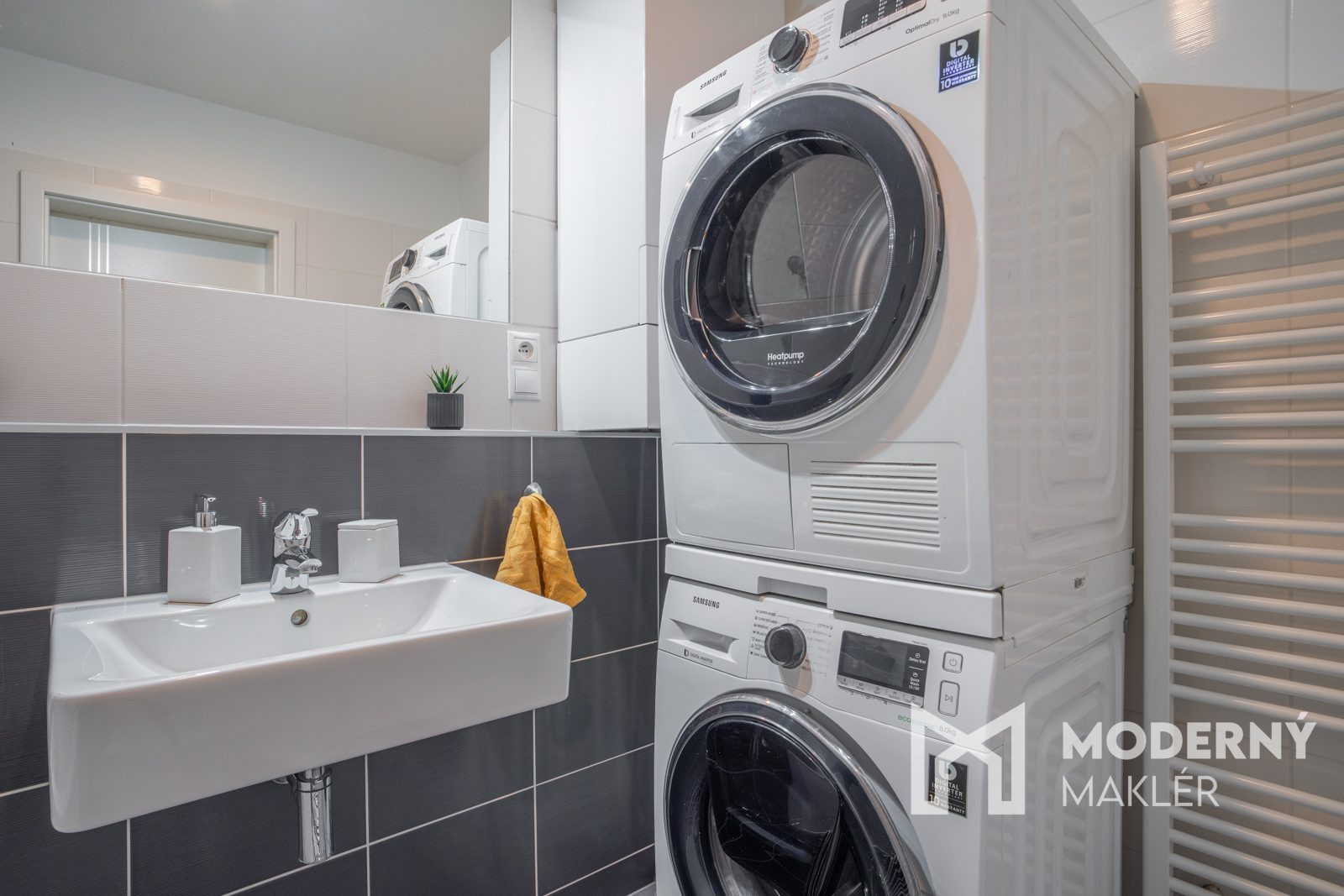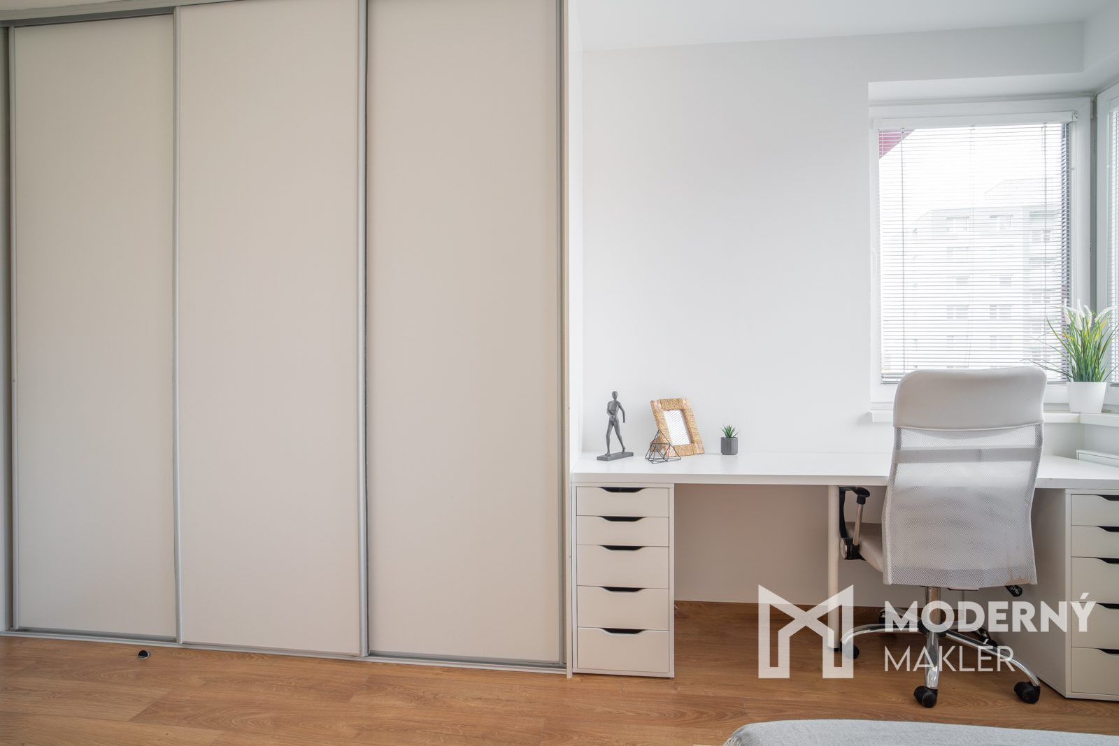 Byt sa prenajíma kompletne zariadený – v kuchyni sa nachádza kuchynská linka vrátane vstavaných spotrebičov (chladnička s mrazničkou, sklo-keramická varná doska, elektrická rúra, mikrovlnná rúra, digestor) a jedálenský stôl so stoličkami. Obývacia izba je zariadená rohovou sedacou súpravou, konferenčným stolíkom a obývacou stenou. V spálni nájdete manželskú posteľ s matracmi, vstavanú skriňu, písací stôl a komodu. Na chodbe je vešiaková zostava pozostávajúca z komody, skrinky, vešiakového panelu a nástenných skriniek. Ďalšie zariadenie bytu tvorí tiež práčka, sušička a balkónový stolík so stoličkami. V byte je umiestnený vlastný plynový kotol s interiérovým termostatom slúžiaci na vykurovanie a ohrev teplej vody a tiež optické pripojenie.