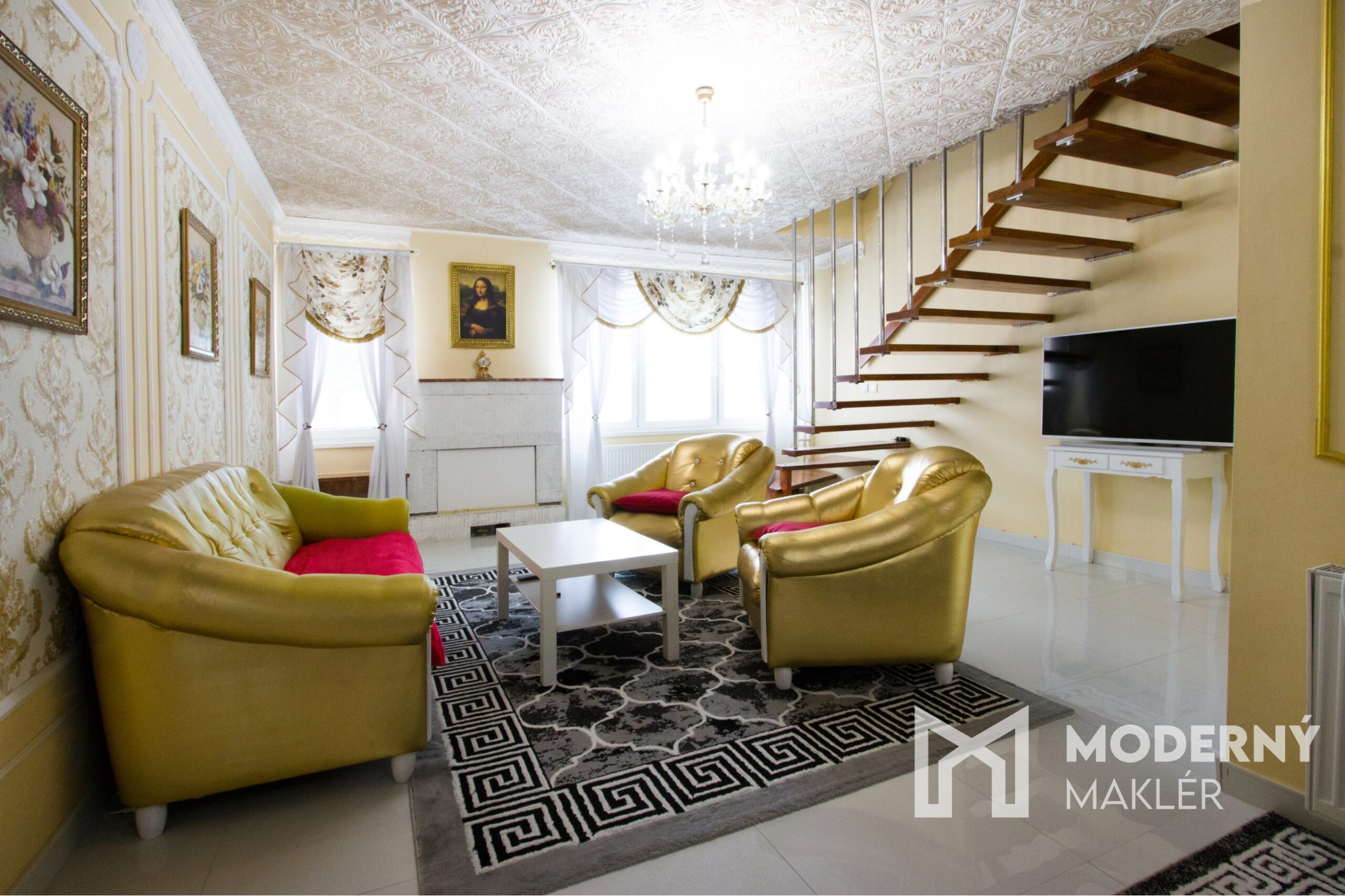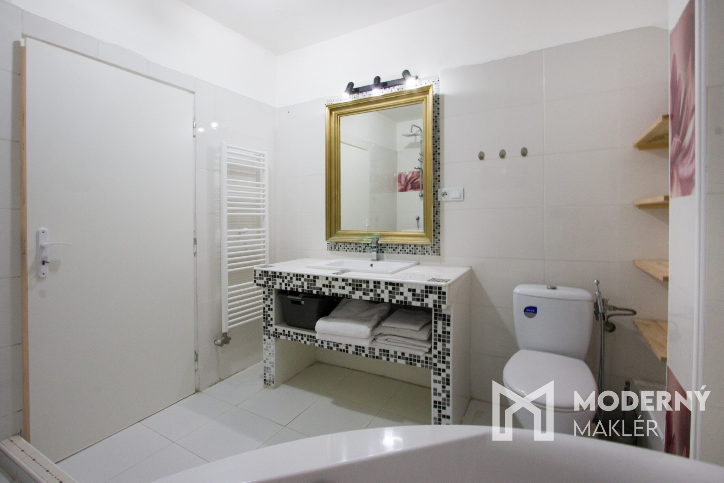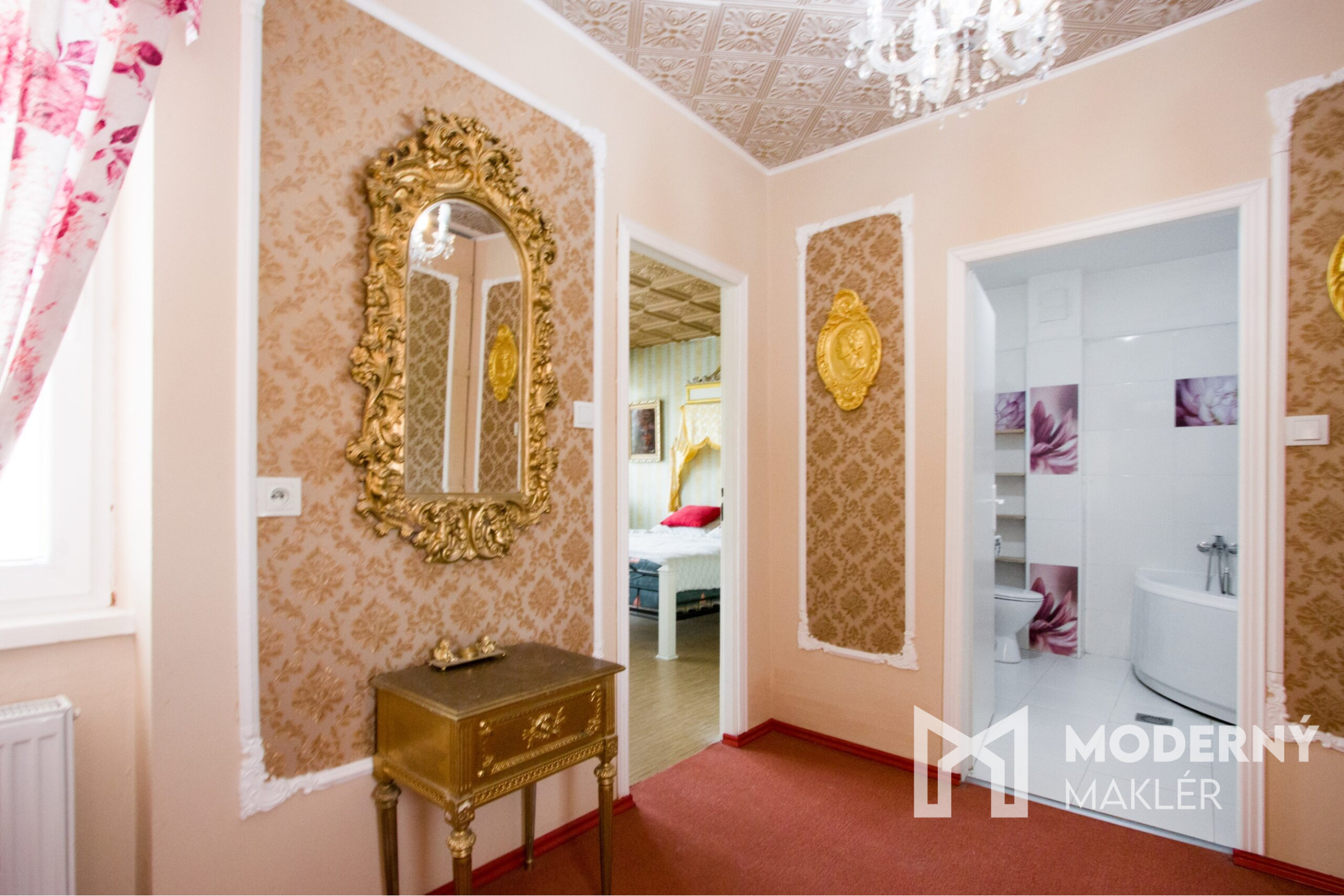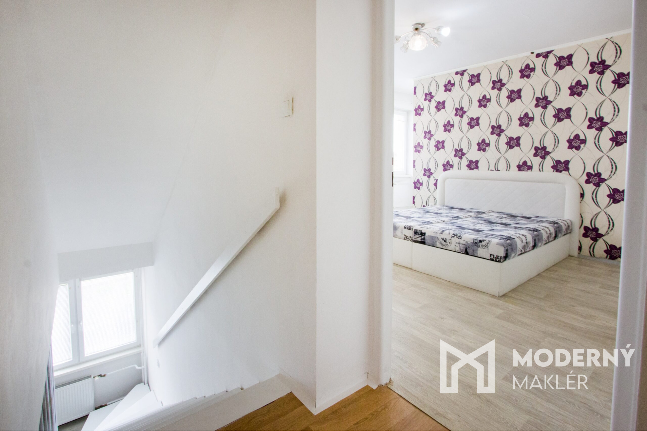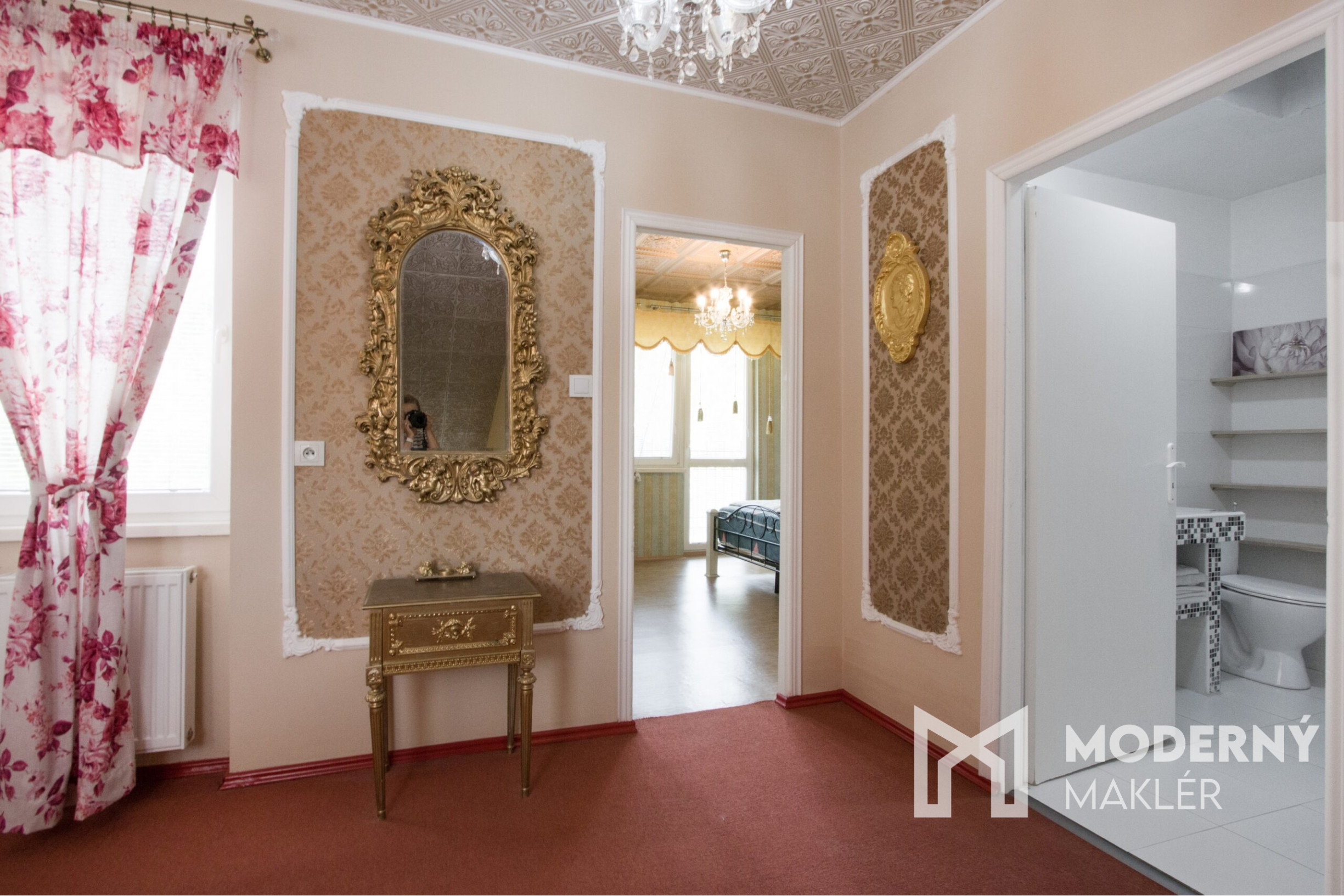 Nehnuteľnosť sa skladá z dvoch bytových jednotiek. V prvom byte nájdete na prízemí vstupnú chodbu, samostatnú toaletu, kuchyňu s komorou, pracovňu, ktorá môže slúžiť aj ako šatník a priestrannú obývaciu izbu s krbom. Na poschodí sa nachádza moderná zrekonštruovaná kúpeľňa s veľkou vaňou a spálňa s výstupom na loggiu a do záhrady.
