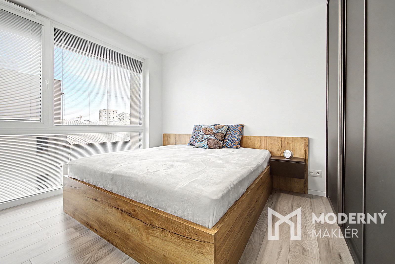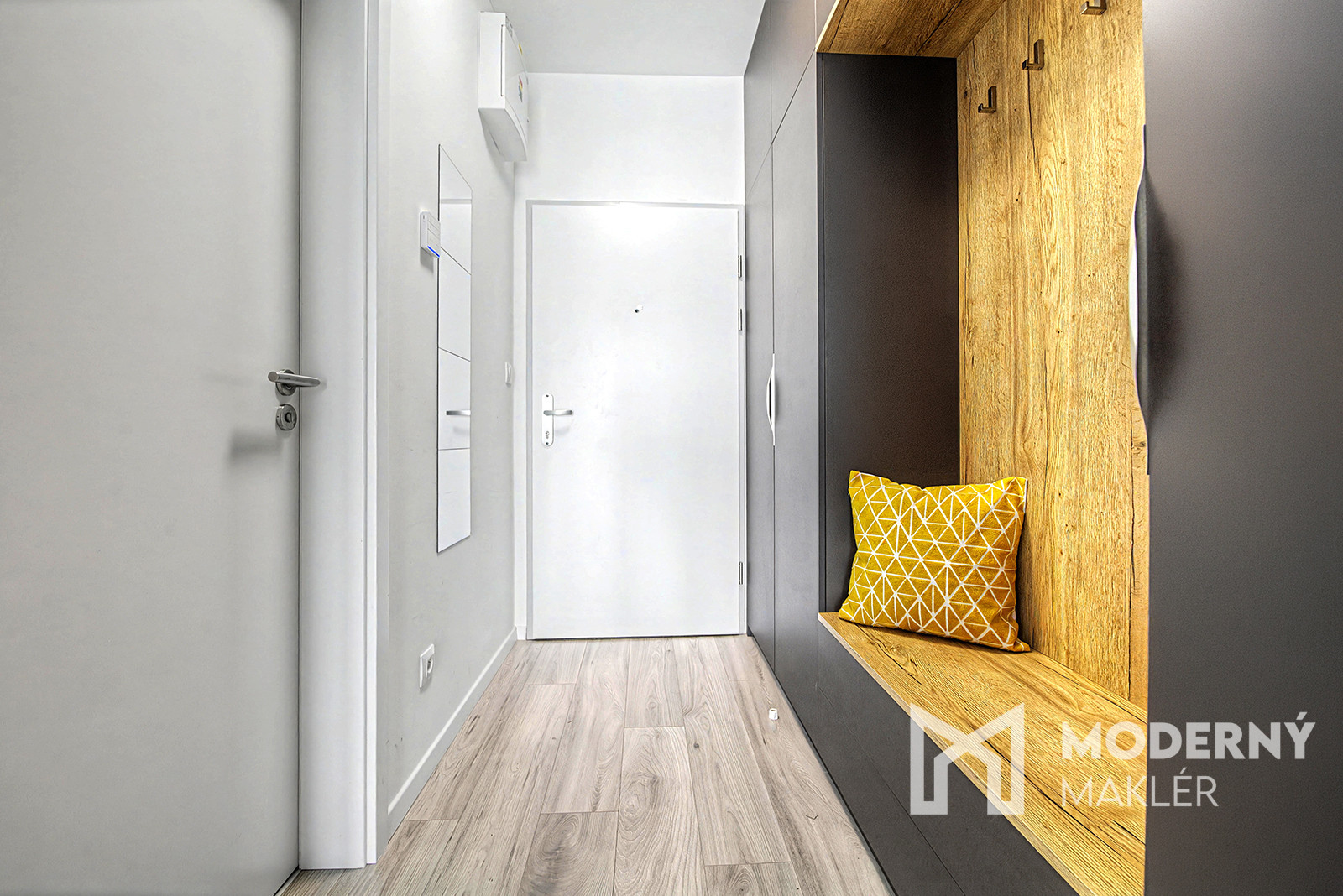 Byt sa skladá zo vstupnej chodby, z ktorej sa po pravej strane nachádza samostatná toaleta. Z chodby je vstup do veľkorysého denného priestoru, kde je kuchynská časť elegantne spojená s jedálenskou časťou a obývacím priestorom. Zo spoločného denného priestoru sú samostatné vstupy do spálne a detskej izby, ktorá môže slúžiť aj ako pracovňa a má východ na balkón orientovaný na juhozápad. Z denného priestoru je taktiež prístup do kúpeľne. Príjemná juhozápadná orientácia a francúzske okná zabezpečujú dostatok prirodzeného svetla počas celého dňa.