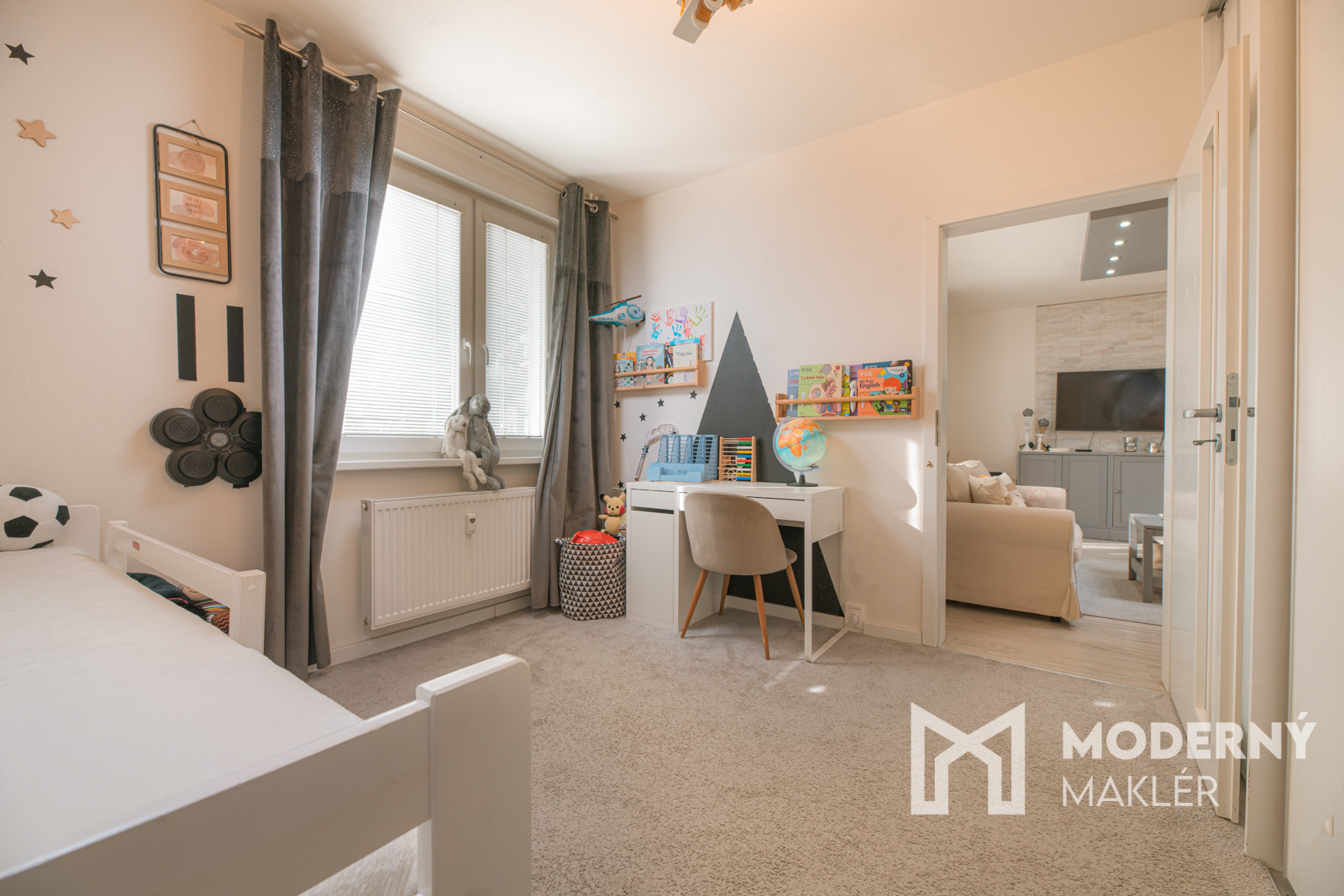 Byt sa skladá zo vstupnej chodby so šatníkom a komorou, ktorá poskytuje praktické úložné priestory hneď pri vchode. Nájdete tu samostatnú kuchyňu s oknom, ktorá zabezpečuje prirodzené osvetlenie a vetranie počas varenia. Obývacia izba má výstup na balkón a priamy vstup do detskej izby, čo vytvára príjemnú prepojenosť rodinných priestorov. Z chodby je prístup na samostatné WC a kúpeľňu s vaňou. Byt taktiež ponúka samostatný vstup do dvoch izieb - spálne a aktuálnej pracovne, ktoré poskytujú súkromie a funkčnosť pre odpočinok aj prácu. Nehnuteľnosť je orientovaná na východnú stranu.