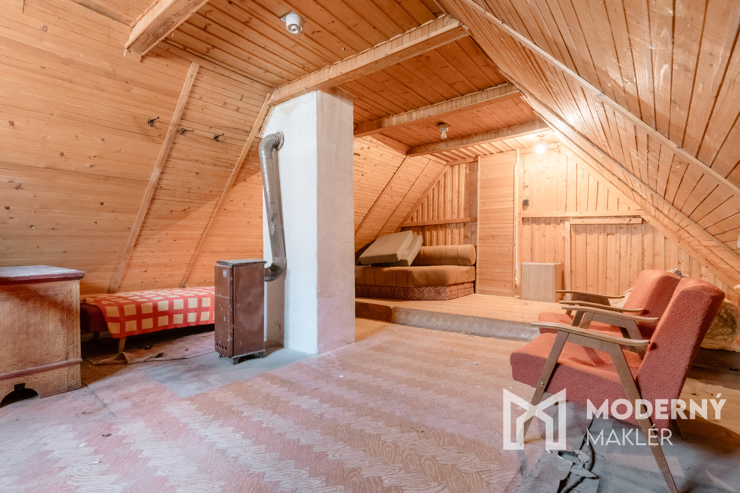 Chata sa rozprestiera na dvoch podlažiach. Vstup do chaty vedie cez vstupnú chodbu, z ktorej sa dostanete na priestrannú terasu. Na prízemí sa nachádza po pravej strane toaleta, kúpeľňa a technická miestnosť. Po ľavej strane je umiestnená obývacia časť s kuchyňou. Zo vstupnej chodby vedú schody na horné podlažie. Na druhom poschodí nájdete priestrannú miestnosť a ďalšiu spálňu s dvoma posteľami. Nehnuteľnosť má slnečnú orientáciu, ktorá zabezpečuje príjemné prirodzené osvetlenie počas celého dňa.
