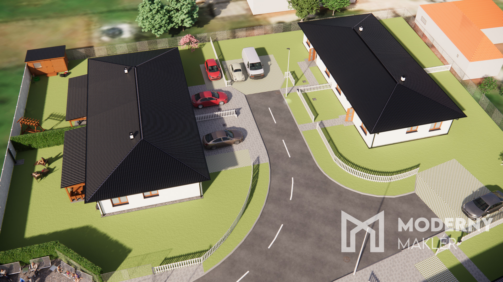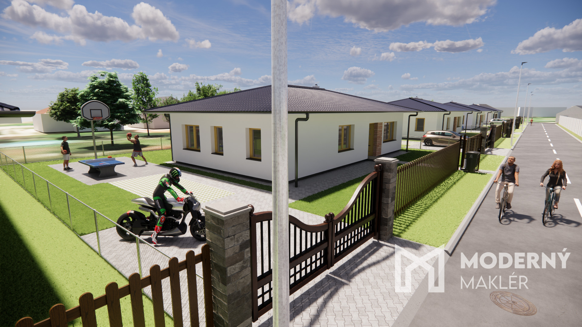 - Oplotenie zo zeleného poplastovaného pletiva z bočných strán pozemku, pričom predná strana domu zostáva bez oplotenia.