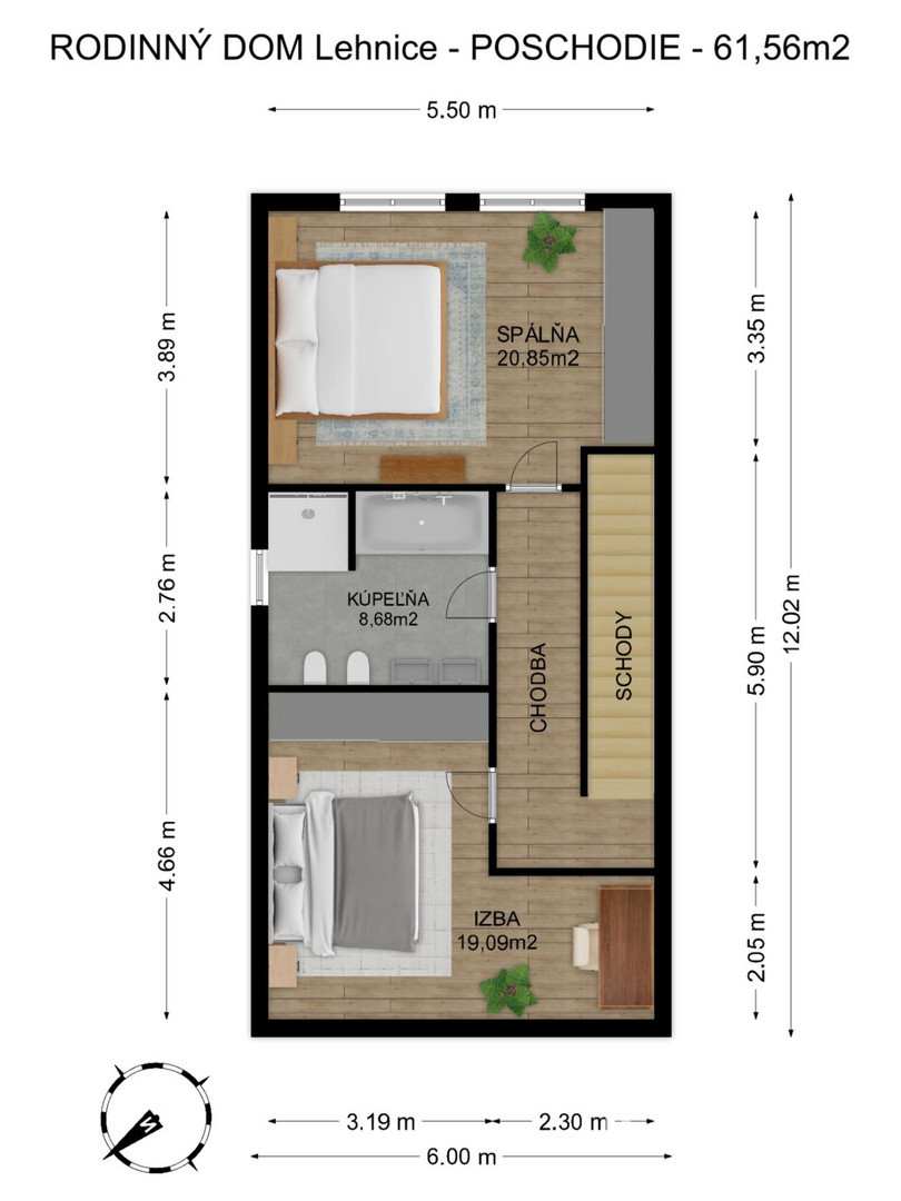 Dom sa skladá z dvoch poschodí s premysleným rozložením priestorov. Na prízemí sa nachádza vstupná chodba. Ďalej tu nájdete samostatnú toaletu so sprchovacím kútom pre pohodlie hostí, praktickú hosťovskú izbu a priestrannú obývaciu izbu spojenú s kuchyňou, ktorá tvorí srdce domova. Zo spoločenských priestorov máte prístup na terasu s dvorom, čo zaručuje optimálne prírodné osvetlenie počas dňa. Na prízemí sa tiež nachádza technická miestnosť s kotlom a ohrievačom vody. Na druhom poschodí, kam sa dostanete po schodisku z prízemia, sa nachádza veľká detská izba ideálna pre rodiny s deťmi. Priestranná spálňa ponúka dostatočný priestor a možnosť vybudovania šatníka pre maximálne pohodlie. Poschodie dopĺňa kúpeľňa s predprípravou na vaňu, sprchový kút a umývadlo. Vykurovanie domu je zabezpečené podlahovým vykurovaním. V každej miestnosti bude termostat na praktické ovládanie vykurovania.