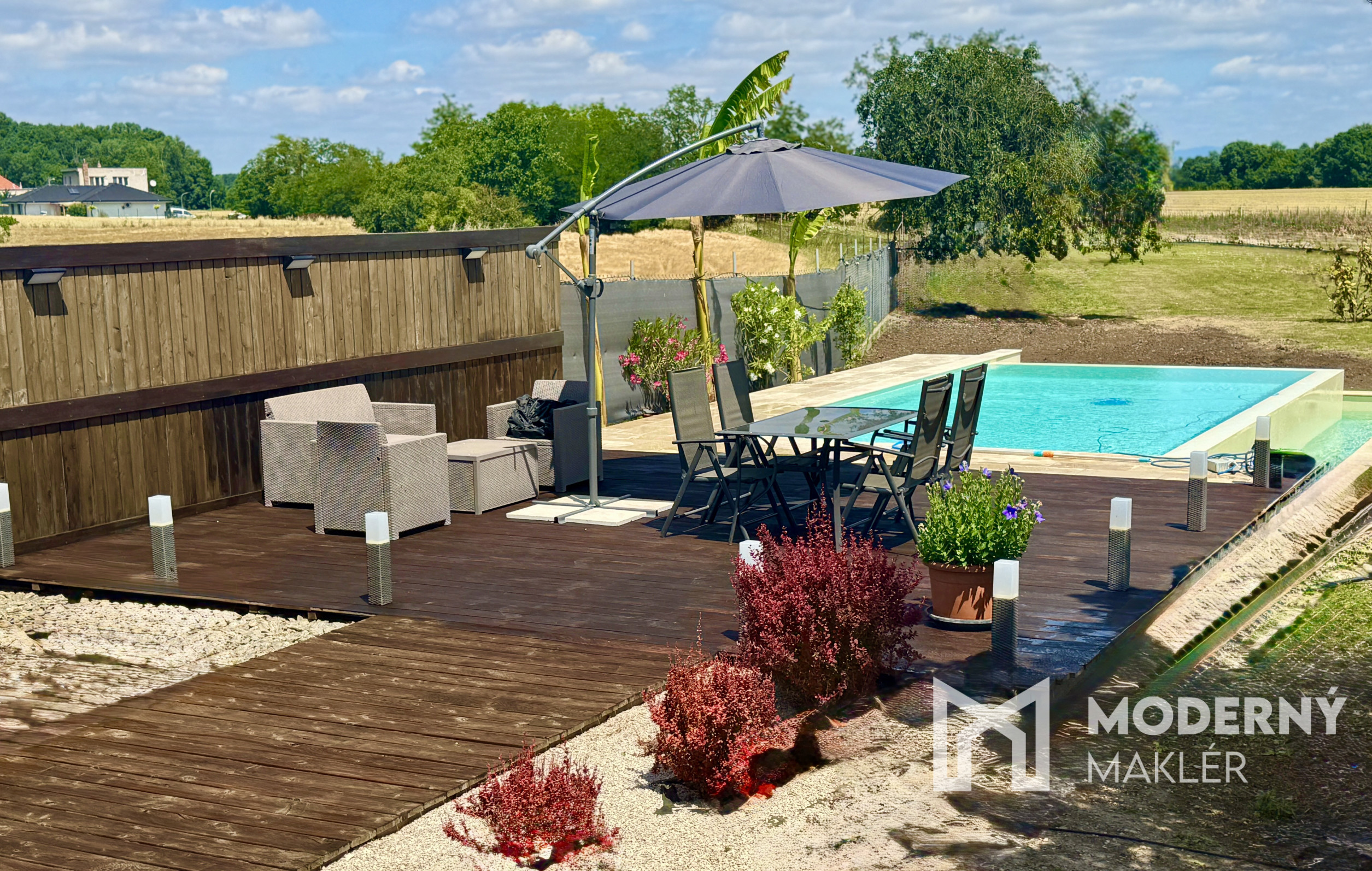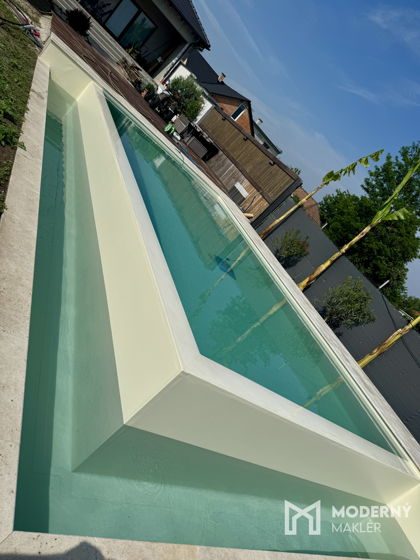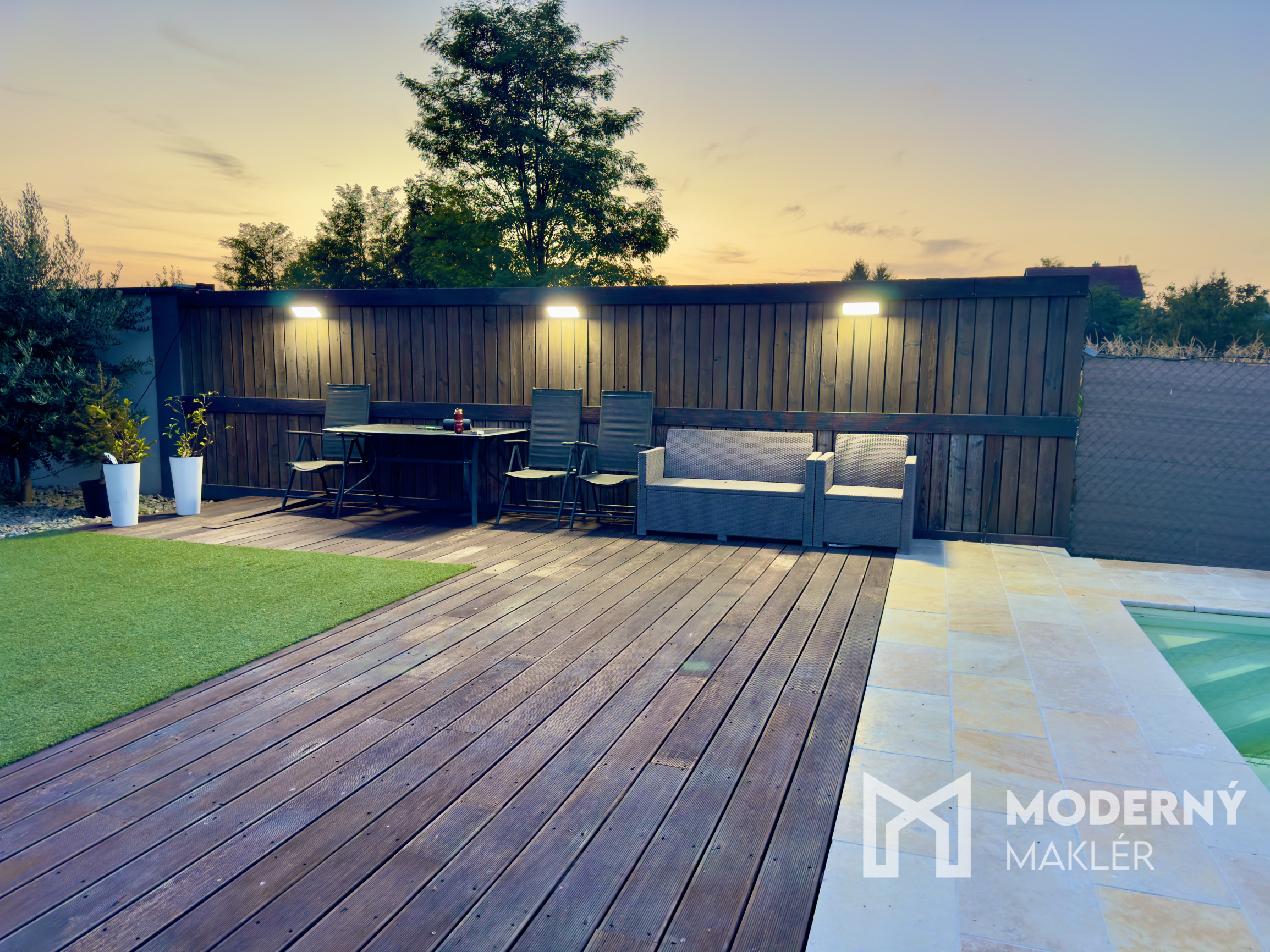 Exteriér domu dopĺňa podzemný bazén s luxusným obkladom z travertínu a terasa z tvrdého dreva s rozlohou 50 m². Chodník vedúci k bazénu je vytvorený z červeného smreku, čo dodáva celému priestoru elegantný charakter.