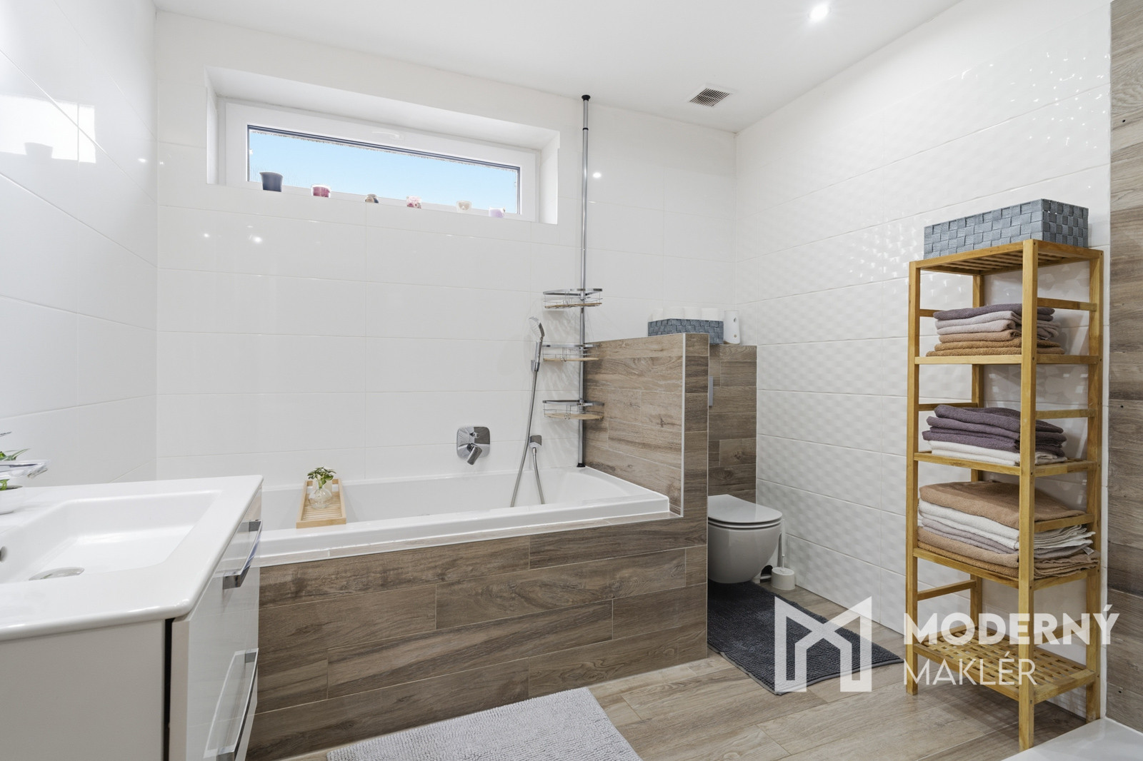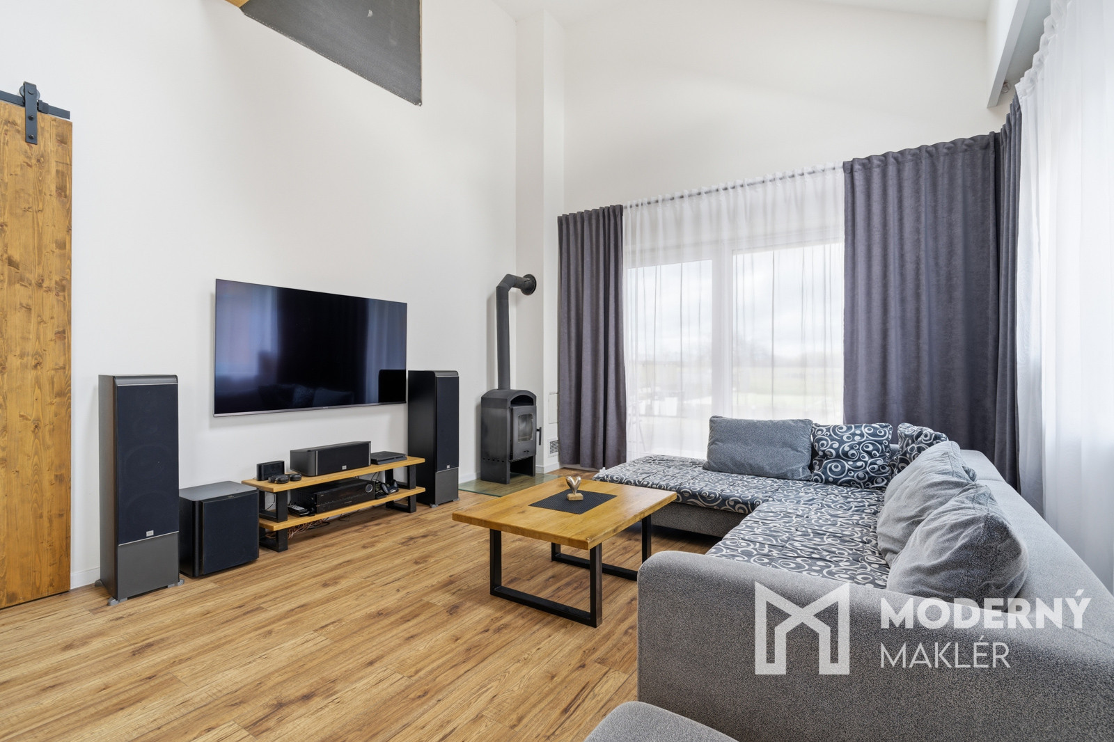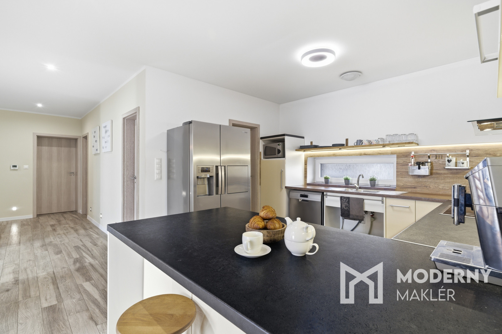 Nehnuteľnosť ponúka premyslené rozloženie s bočným vstupom, ktorý vedie do priestrannej vstupnej chodby so šatníkom. Odtiaľ pokračujete do druhej prepojenej chodby, kde sa nachádzajú dve detské izby orientované na západ, pričom každá z nich disponuje vlastným šatníkom. V tejto časti domu sa nachádza kompletne vybavená kúpeľňa s vaňou, sprchovým kútom a WC, ako aj samostatné WC. Centrálnou časťou prízemia je praktická kuchyňa so špajzou, oproti ktorej sa rozprestiera veľká a priestranná obývacia izba s krbom a jedálňou orientovaná na východ. Z obývacej izby máte priamy vstup na zastrešenú loggiu s rozlohou 40 m², z ktorej sa dostanete aj do hlavnej spálne orientovanej na východ, strategicky umiestnenej pri kuchyni.